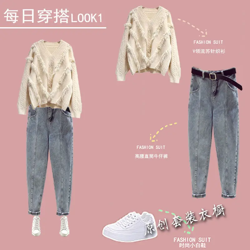 Костюм из двух предметов Женский Осенний Модный корейский вариант свободного пуловера с V-образным вырезом и кисточками узкие джинсы с высокой талией
