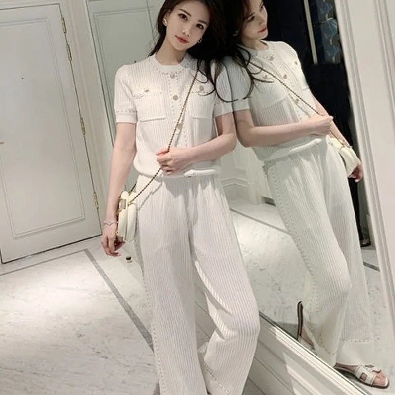 Модный женский костюм, 2021 летний костюм с широкими штанинами, темпераментный костюм из двух частей с короткими рукавами и длинными рукавами