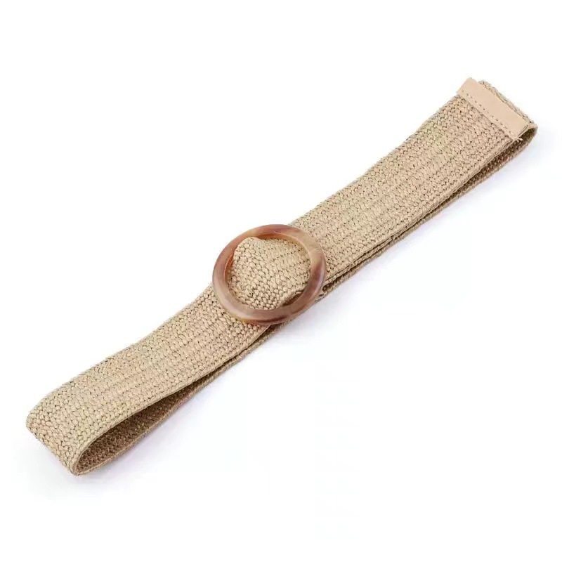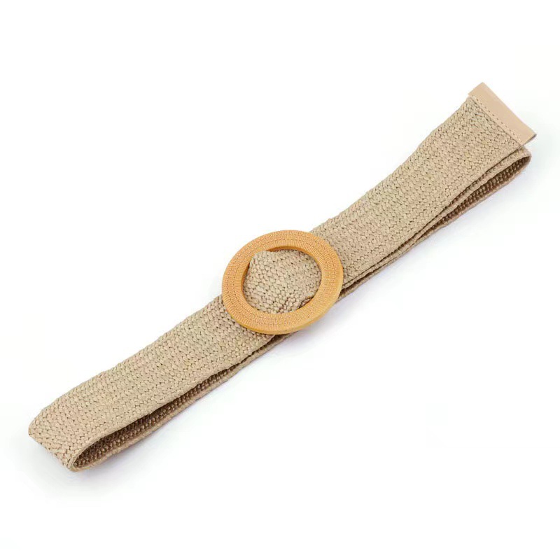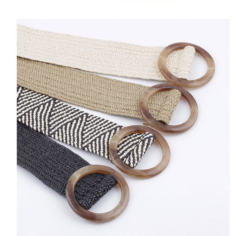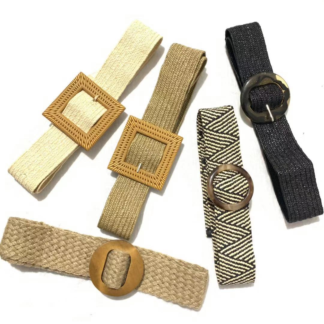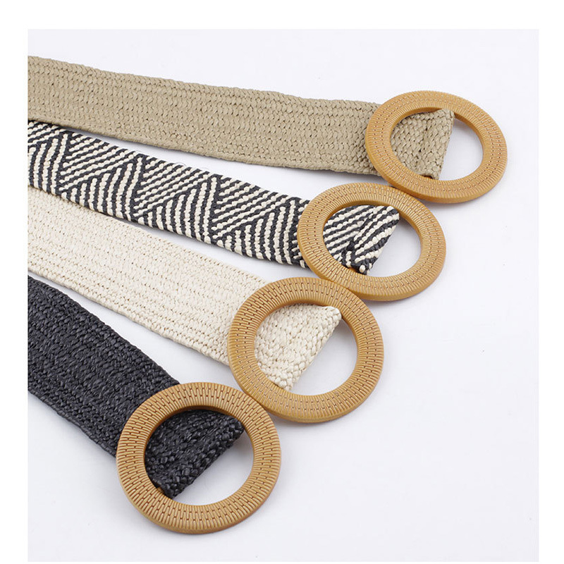Женский широкий плетеный эластичный пояс для платья с Круглой Бамбуковой пряжкой, повседневный модный пояс с деревянной Нефритовой пряжкой, пояс из искусственной соломы