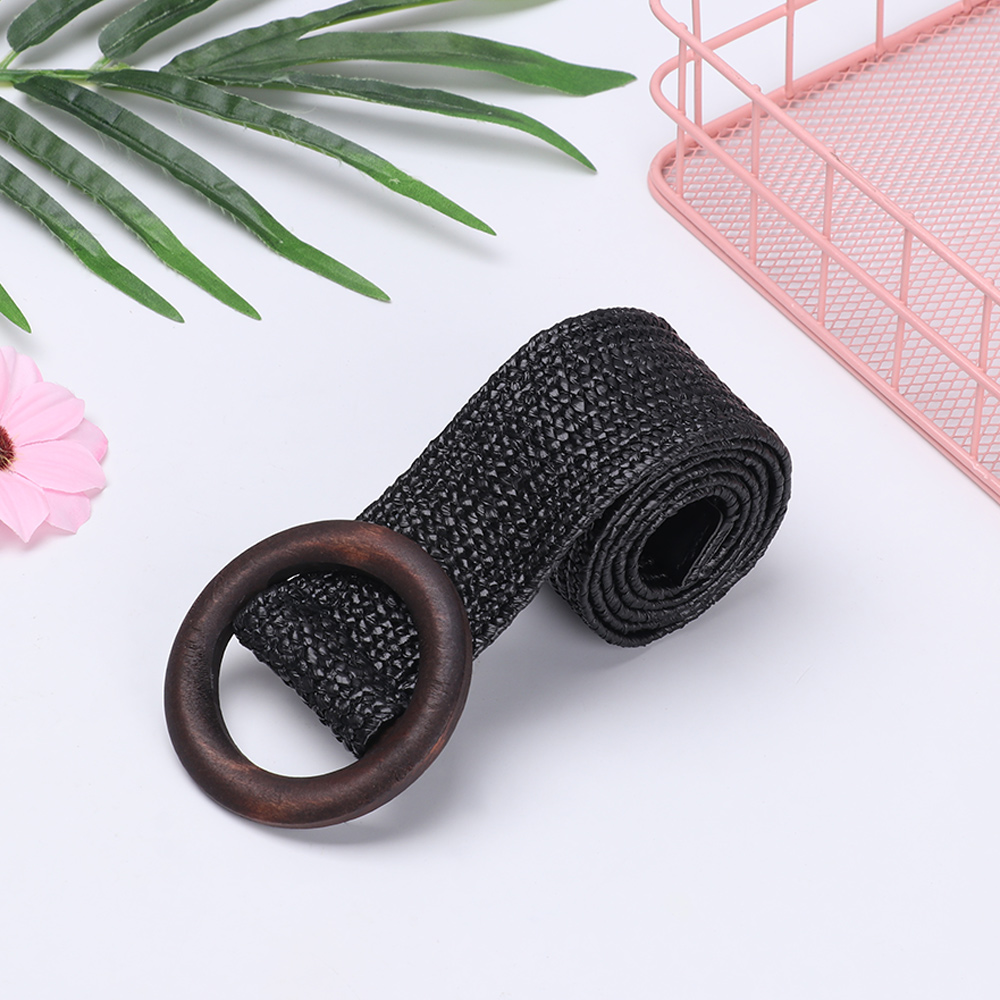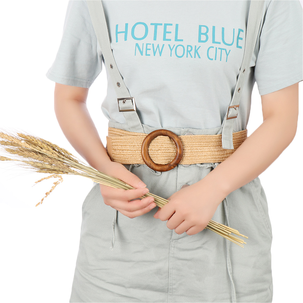 Женский соломенный ремень с круглой деревянной пряжкой, модная повседневная цепь на эластичном поясе, Ювелирное Украшение для тела, аксессуар для платья, рубашки, 1 шт.