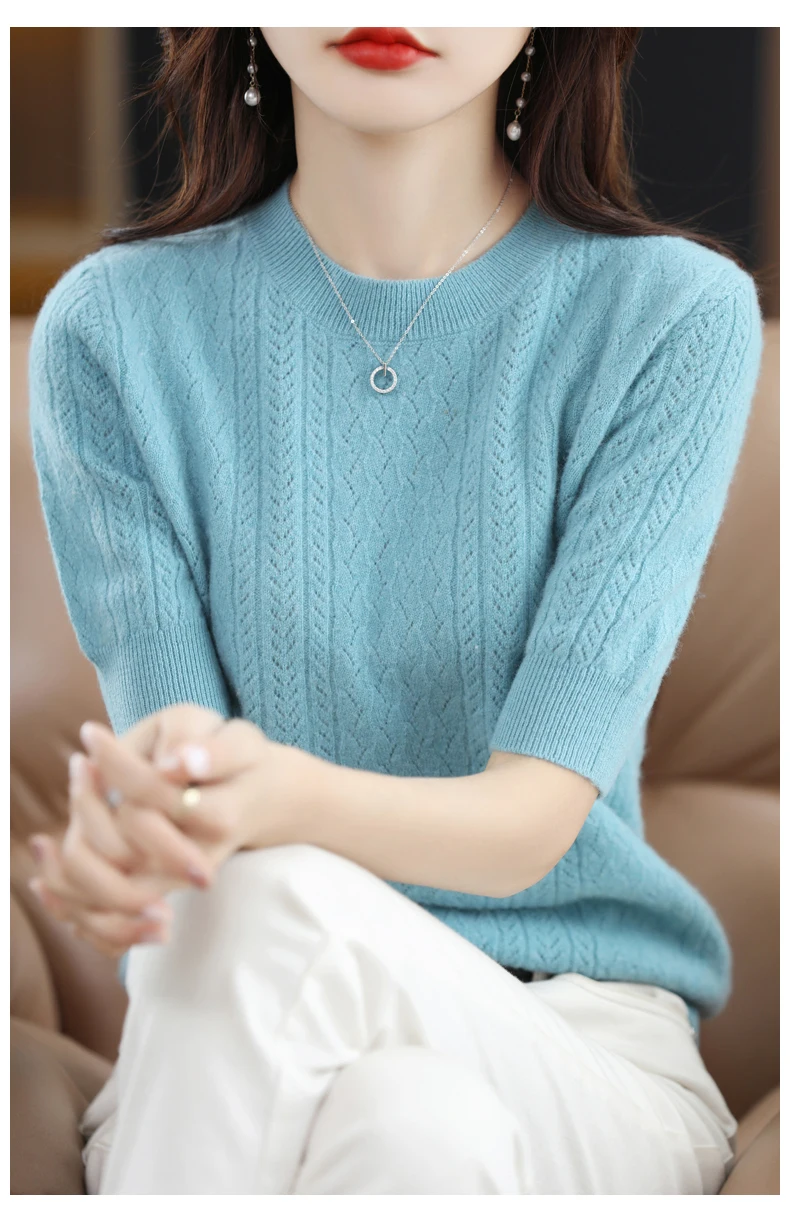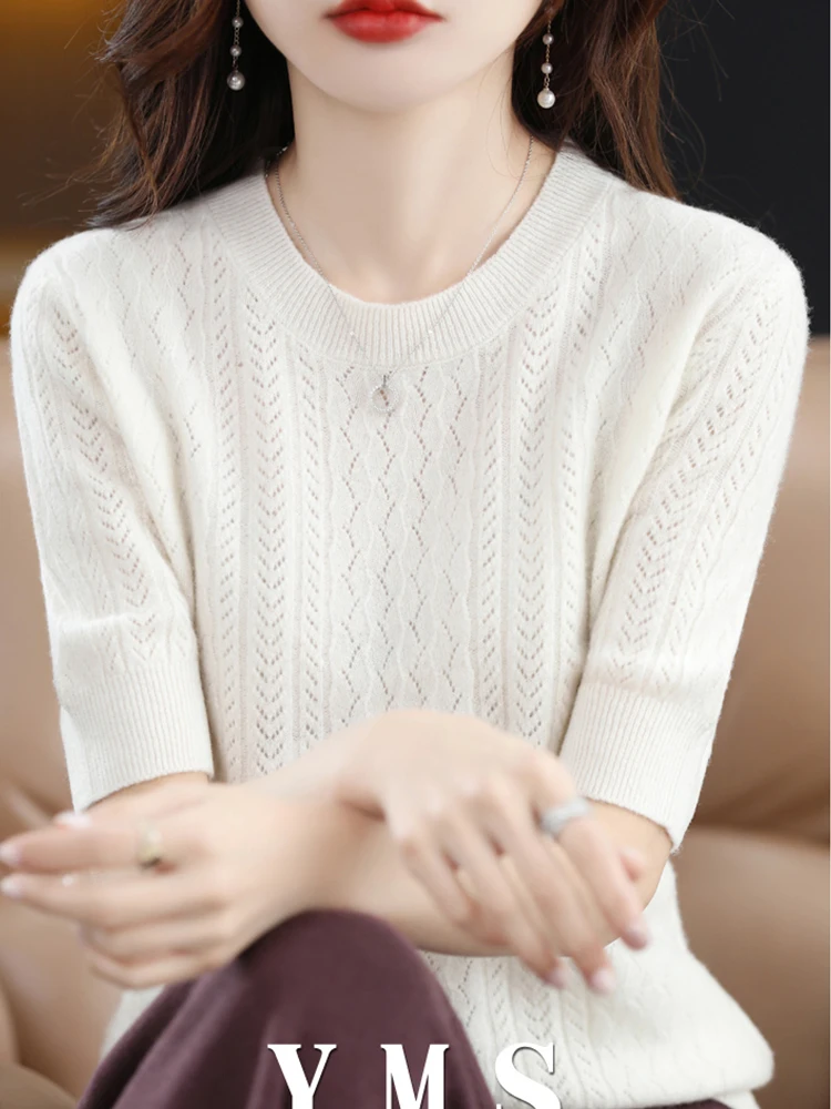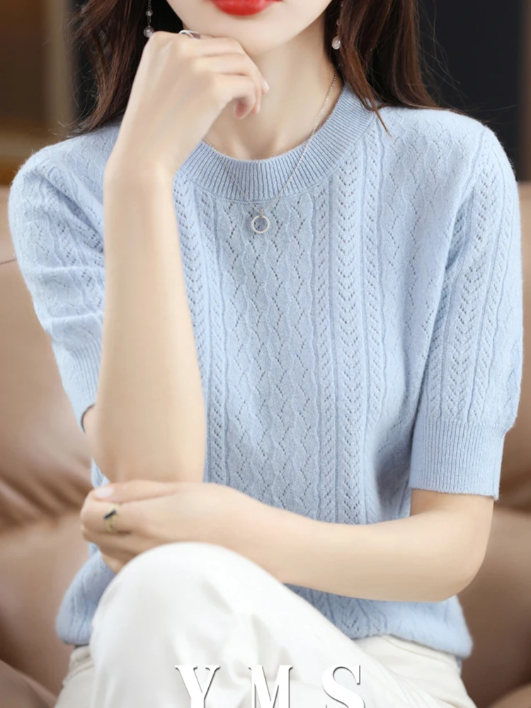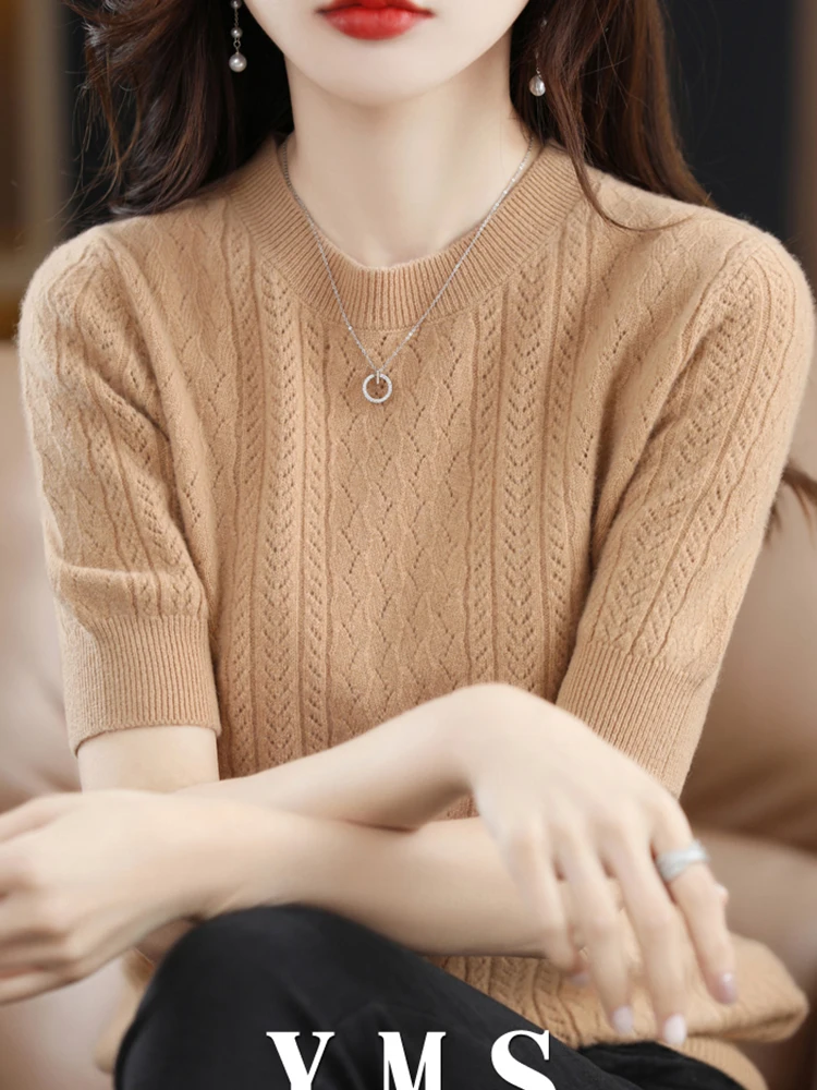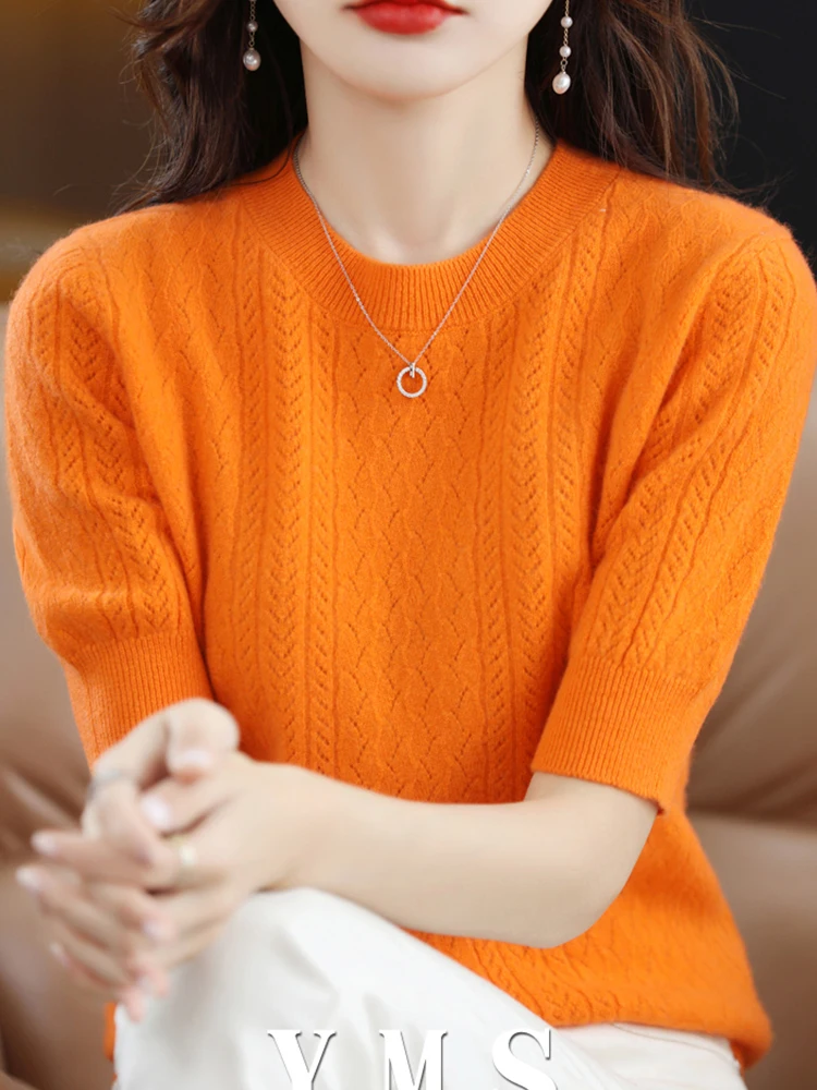Женский трикотажный пуловер из шерсти мериноса, однотонный Повседневный свитер с круглым вырезом и короткими рукавами, весна-осень