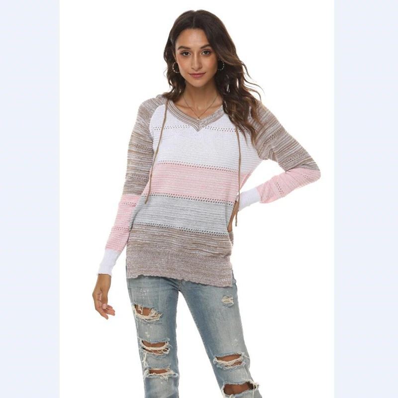 Женский трикотажный свитер с капюшоном, повседневный Полосатый пуловер с длинным рукавом и V-образным вырезом, в стиле пэчворк, осень 2021