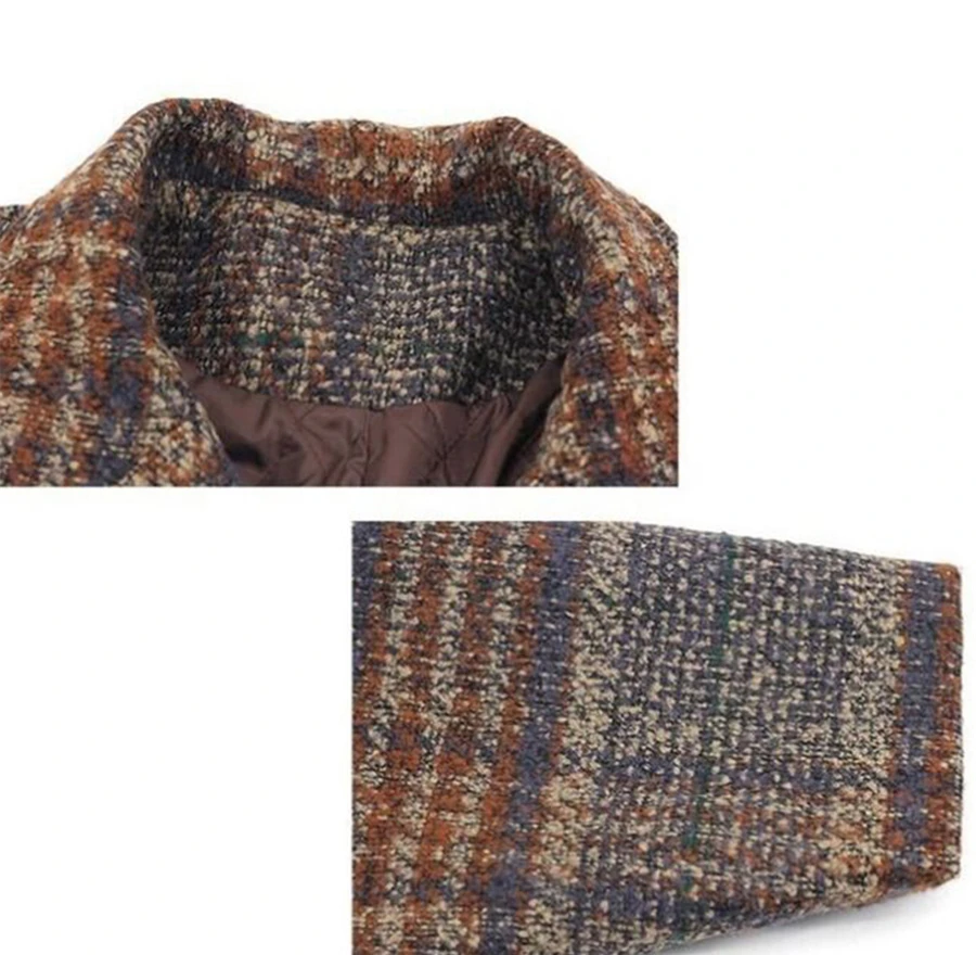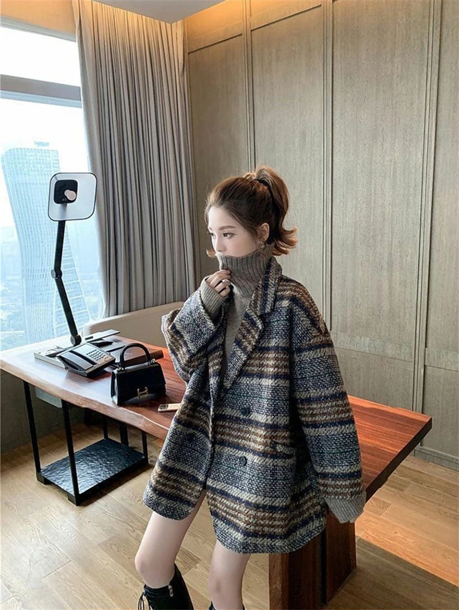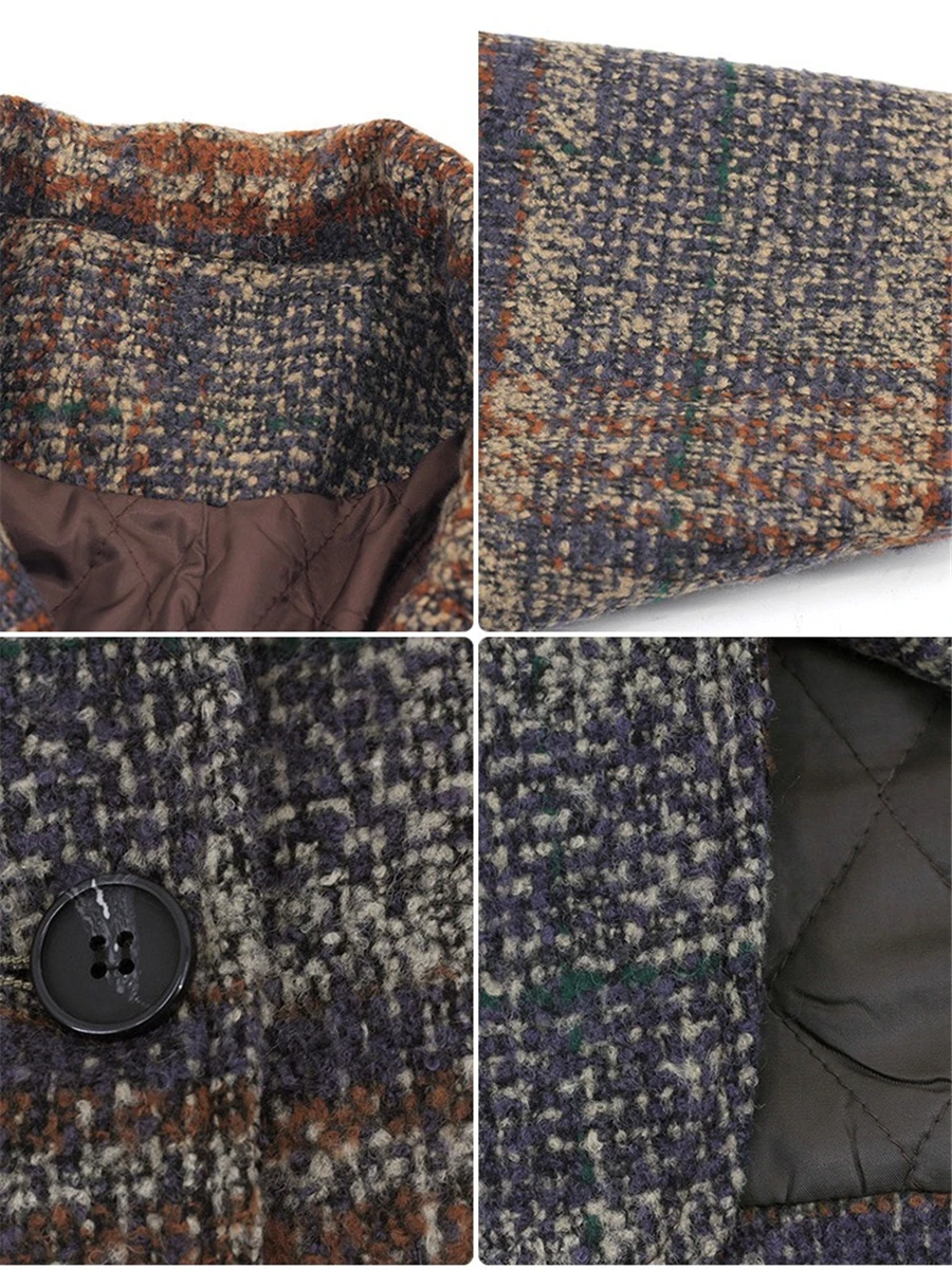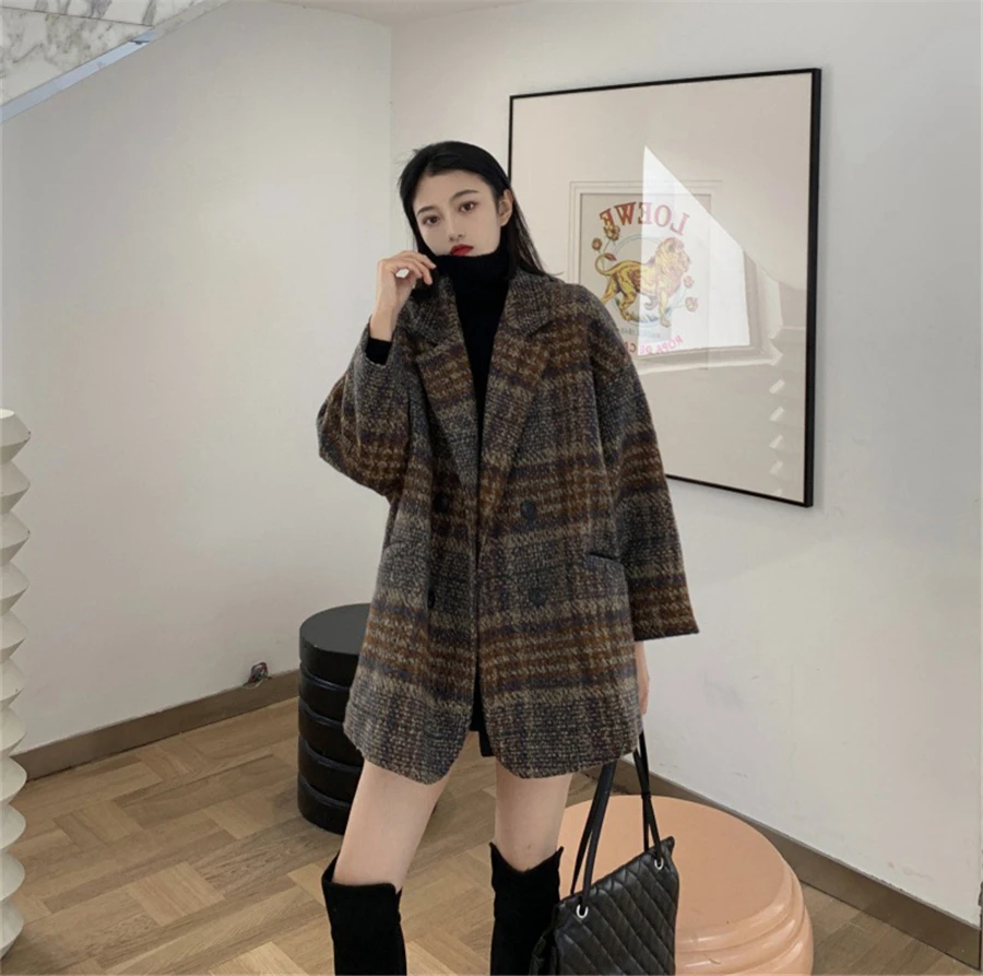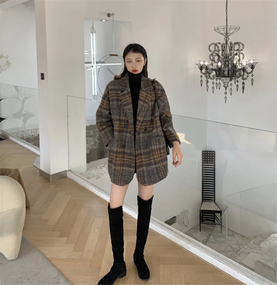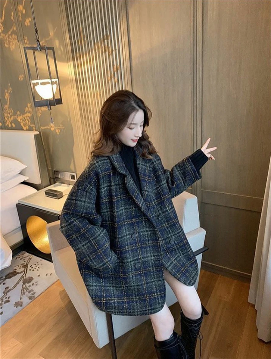 Женский твидовый клетчатый зимний блейзер с хлопковой подкладкой, повседневные длинные пальто, Дамская винтажная утепленная двубортная верхняя одежда для работы