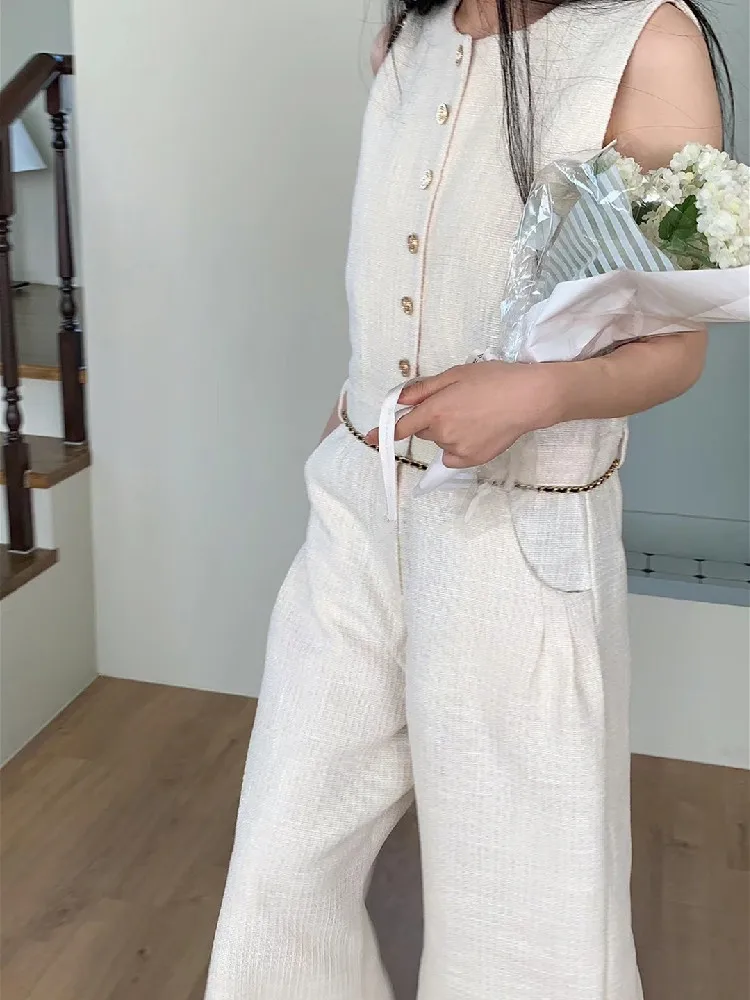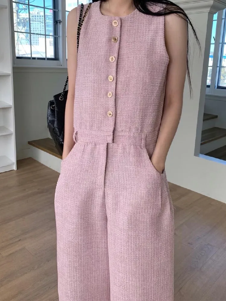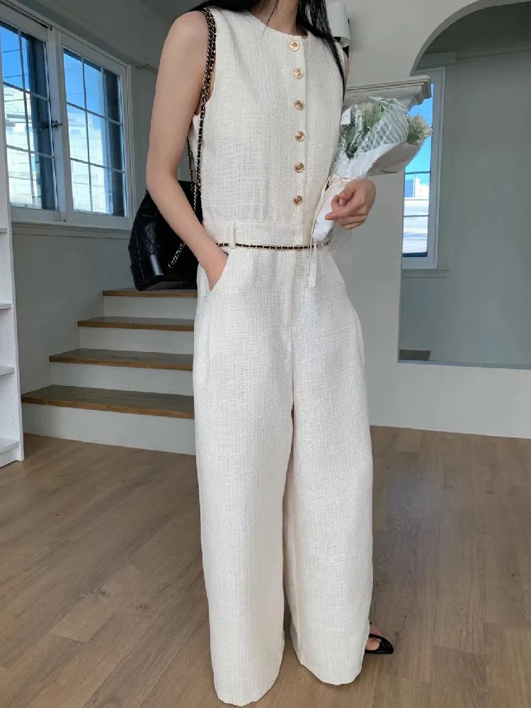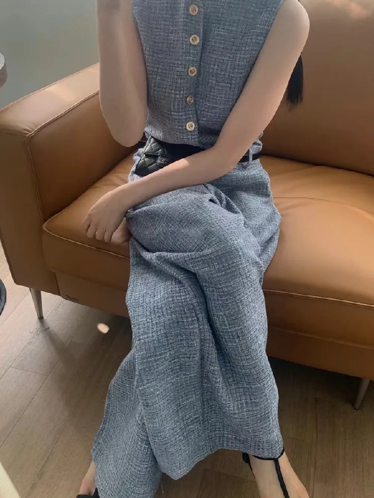 Женский твидовый комбинезон в Корейском стиле, однобортный свободный винтажный комбинезон без рукавов с круглым вырезом и широкими штанинами, 2023