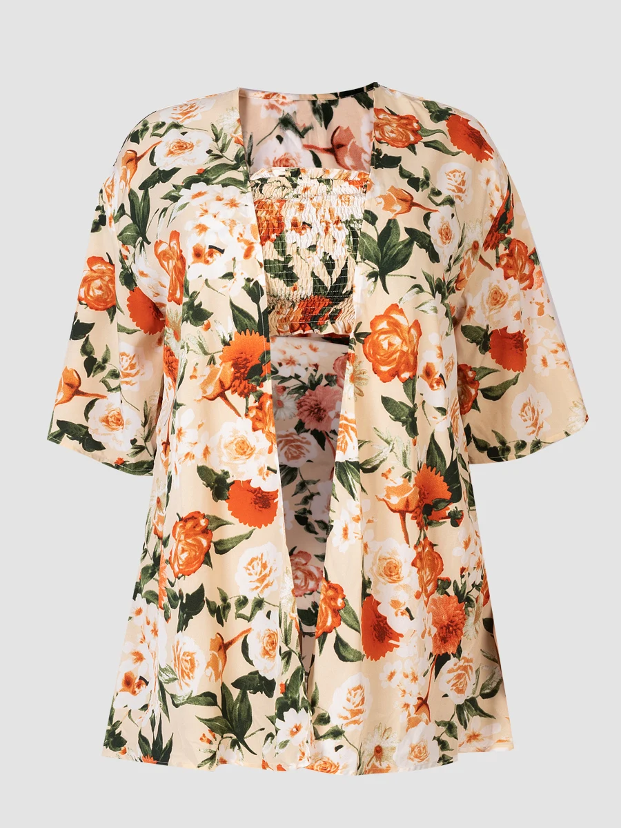 Женское кимоно с тропическим принтом, коротким рукавом и открытым спереди