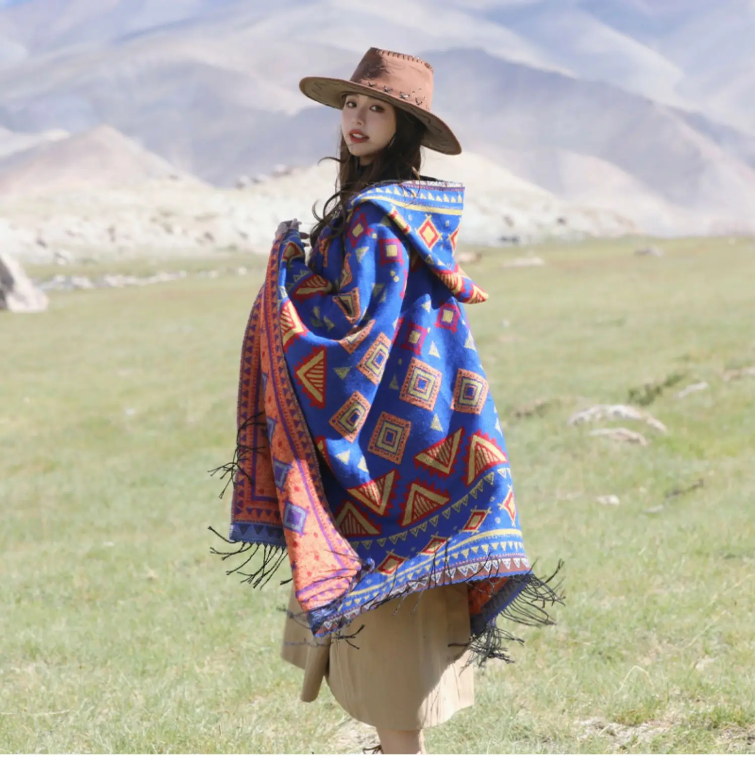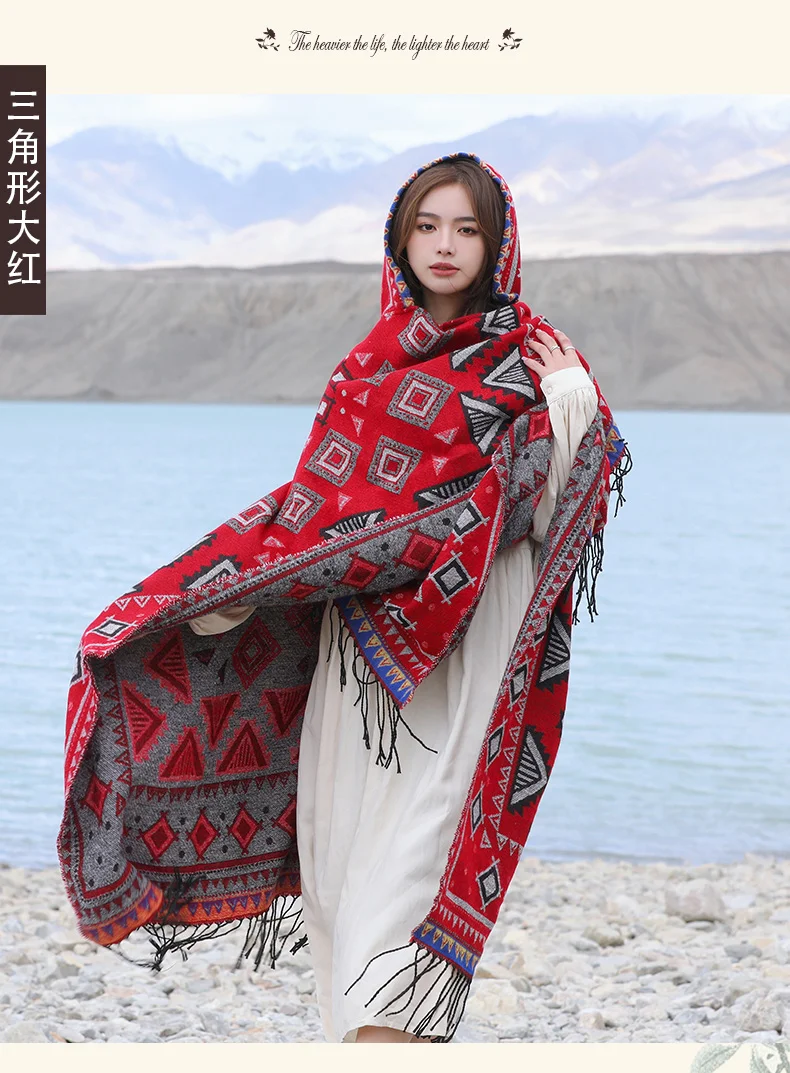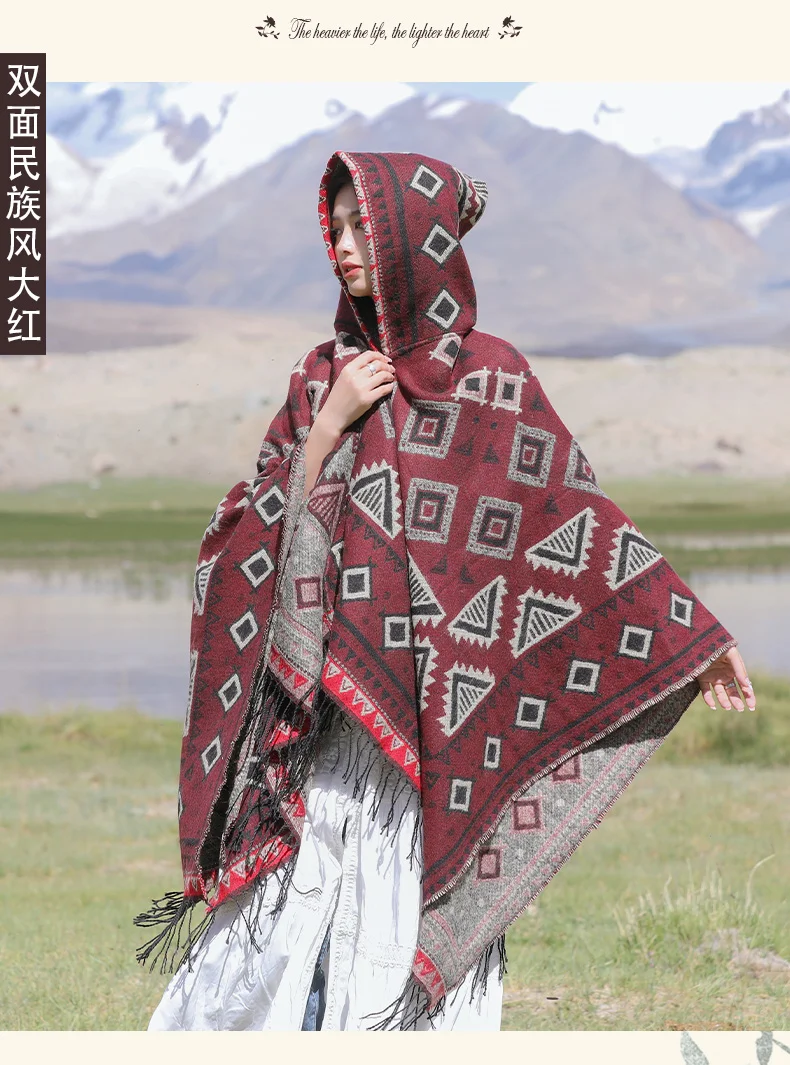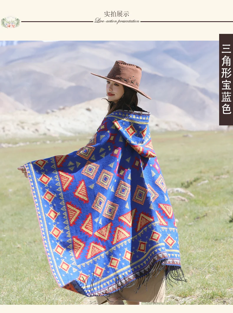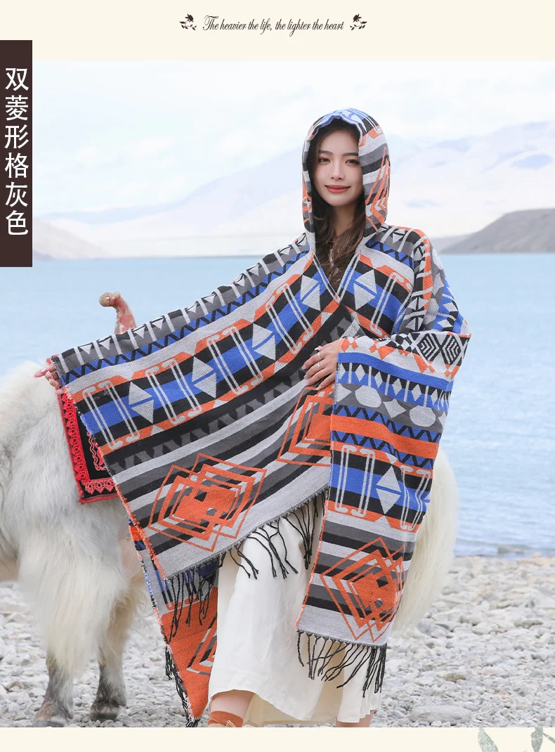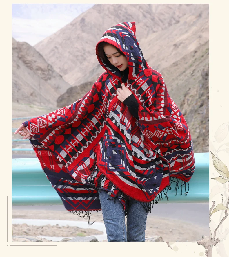 Винтажное пончо с капюшоном с геометрическим принтом, женский теплый плащ с кисточками 2024 весна-осень, имитация кашемировой шали