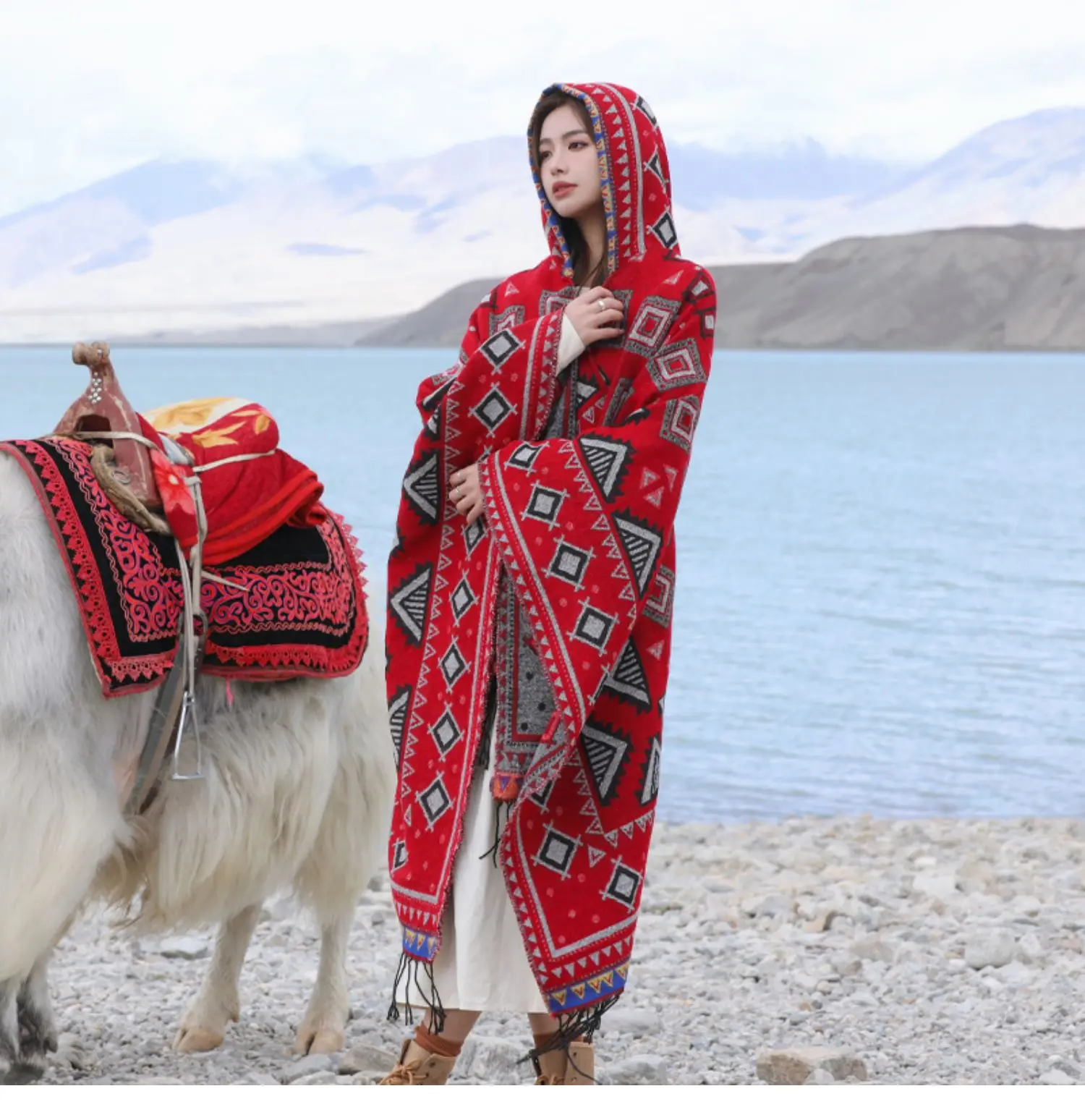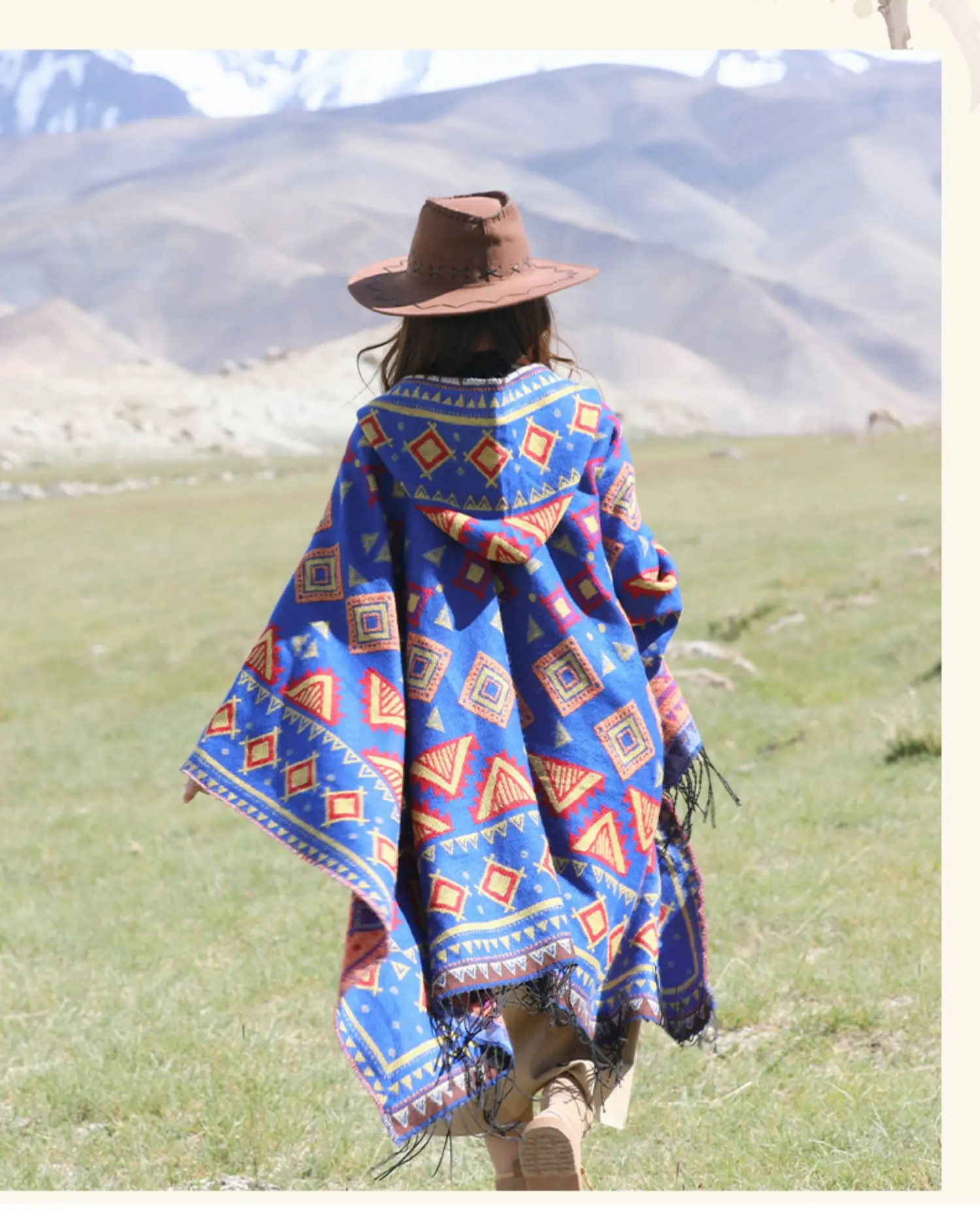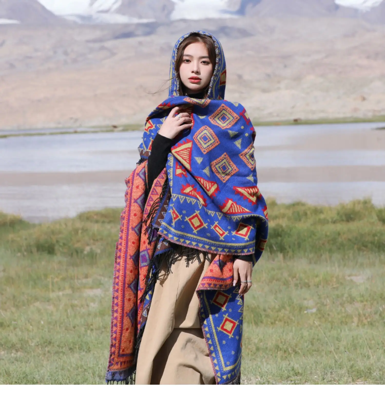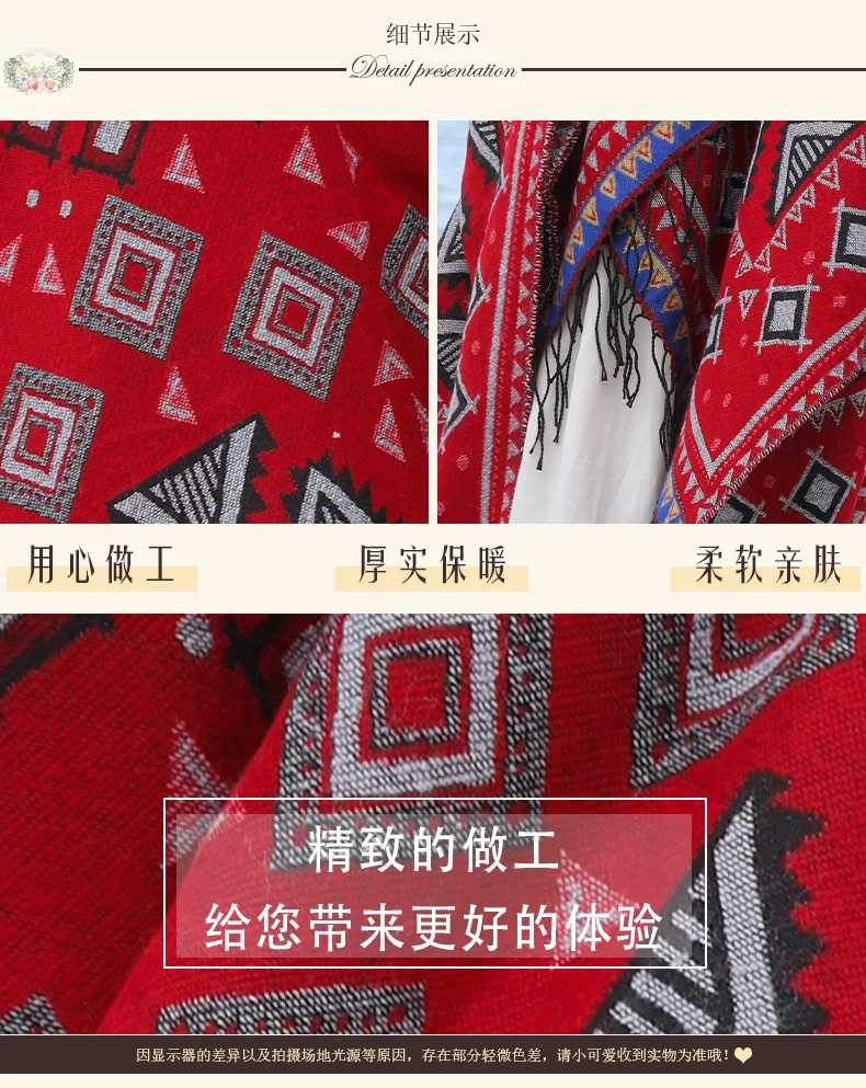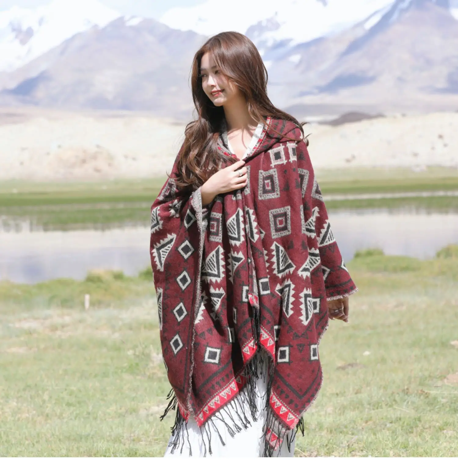 Винтажное пончо с капюшоном с геометрическим принтом, женский теплый плащ с кисточками 2024 весна-осень, имитация кашемировой шали