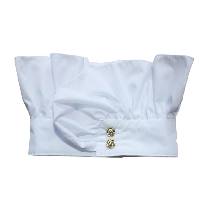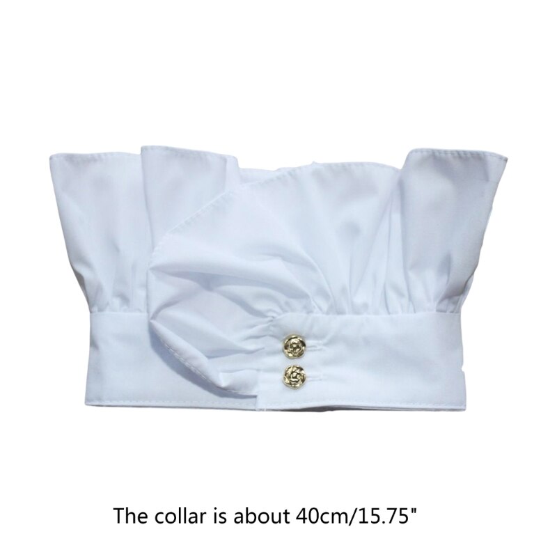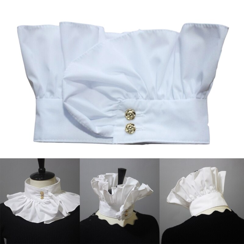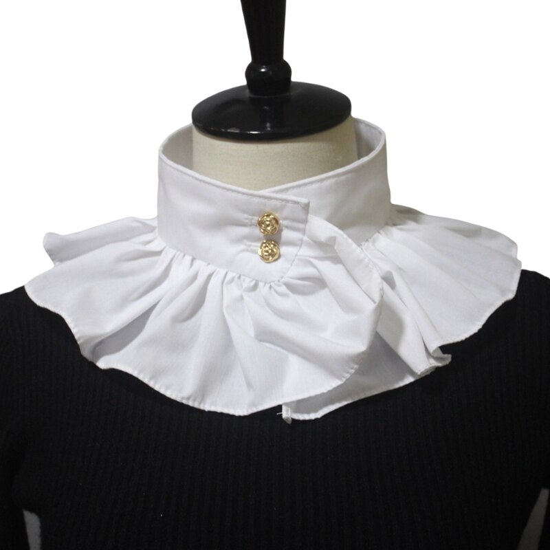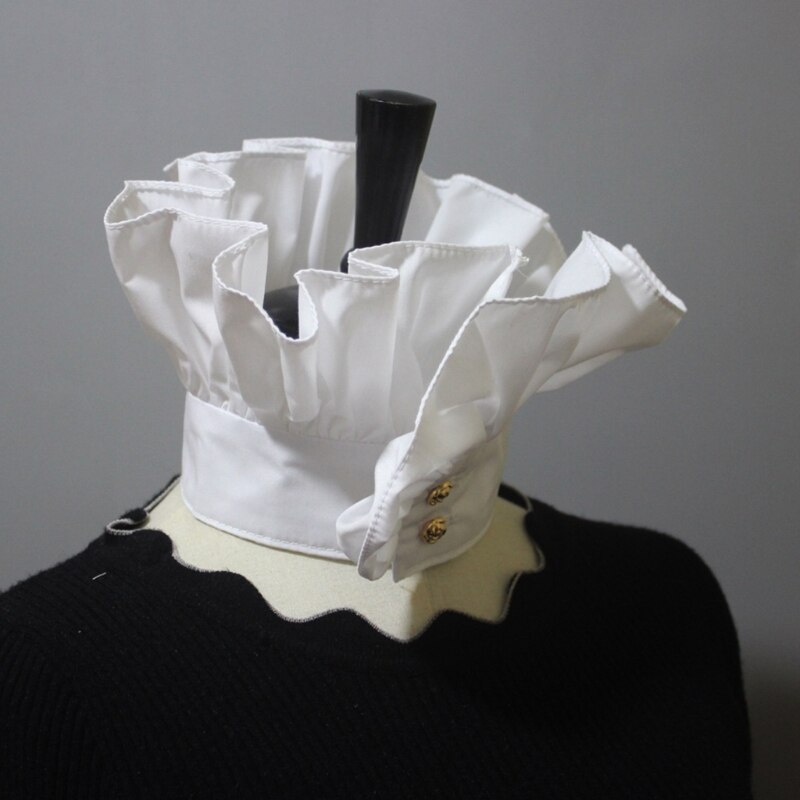 Застежка на две пуговицы спереди, воротник с рюшами, воротник-стойка, высокая горловина, два способа ношения.