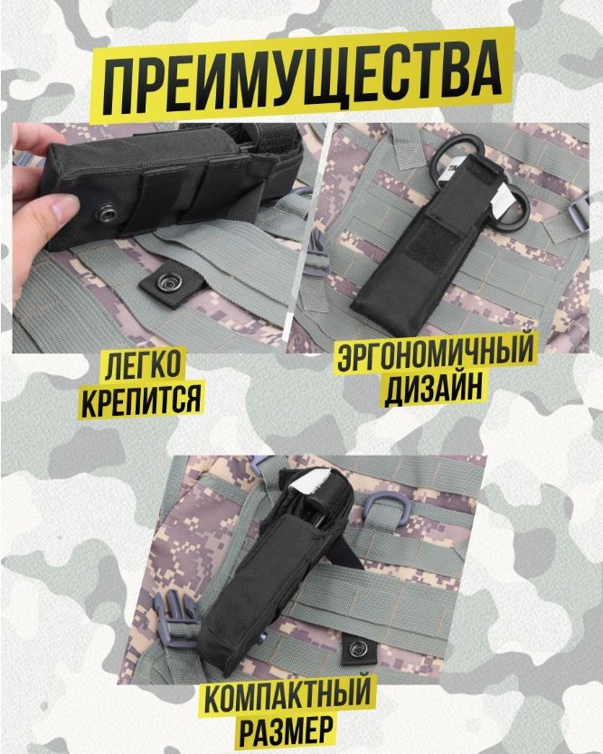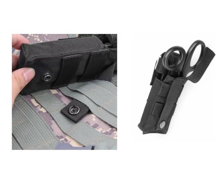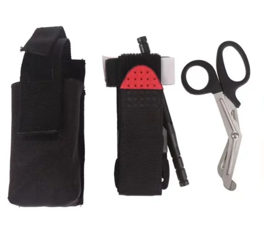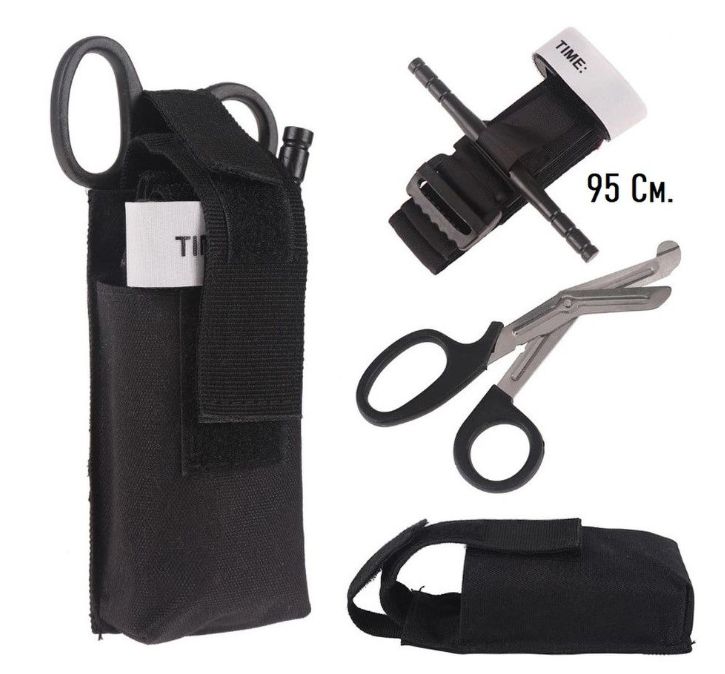 Удобный набор включается в себя необходимые предметы: жгут кровоостанавливающий, тактические ножницы, чехол.