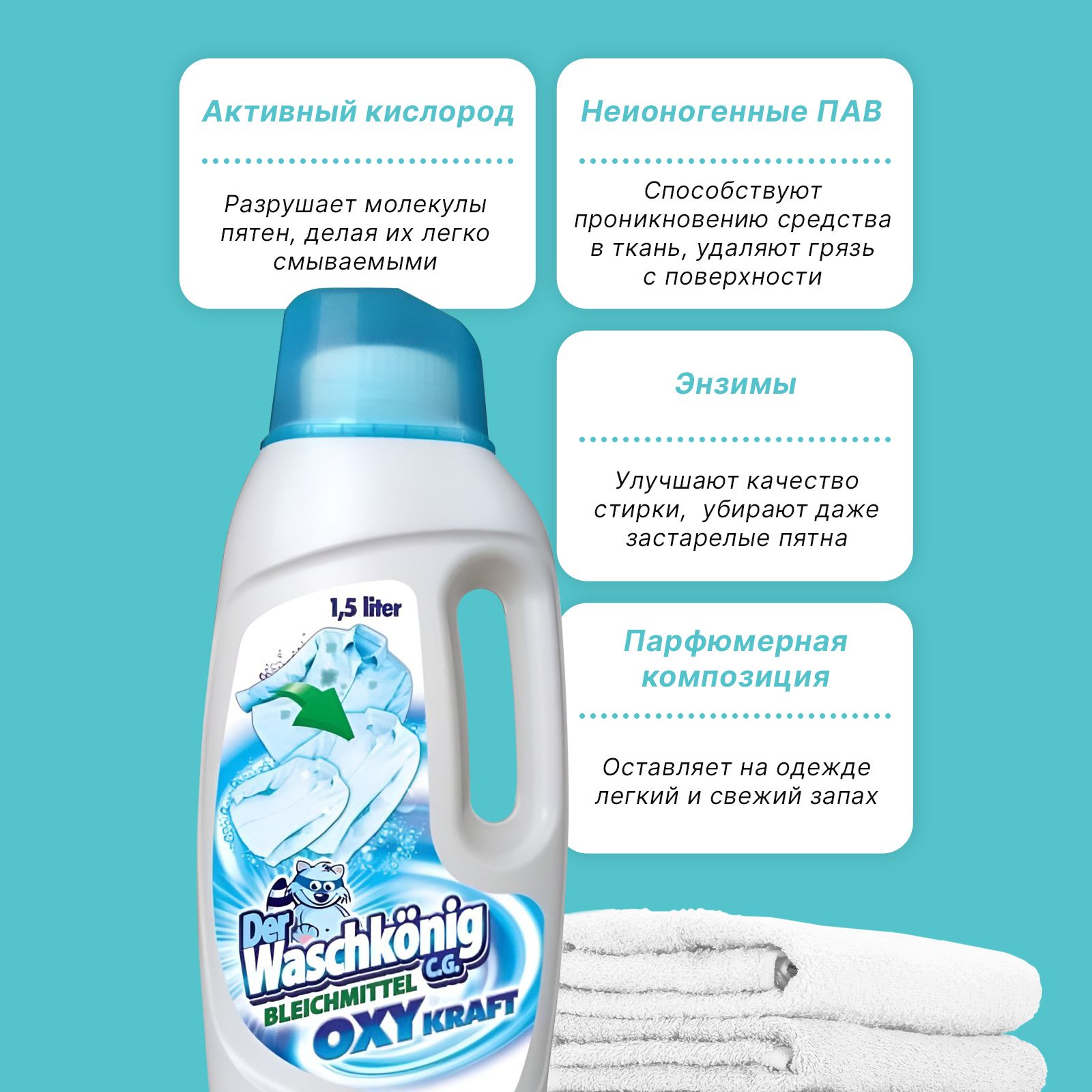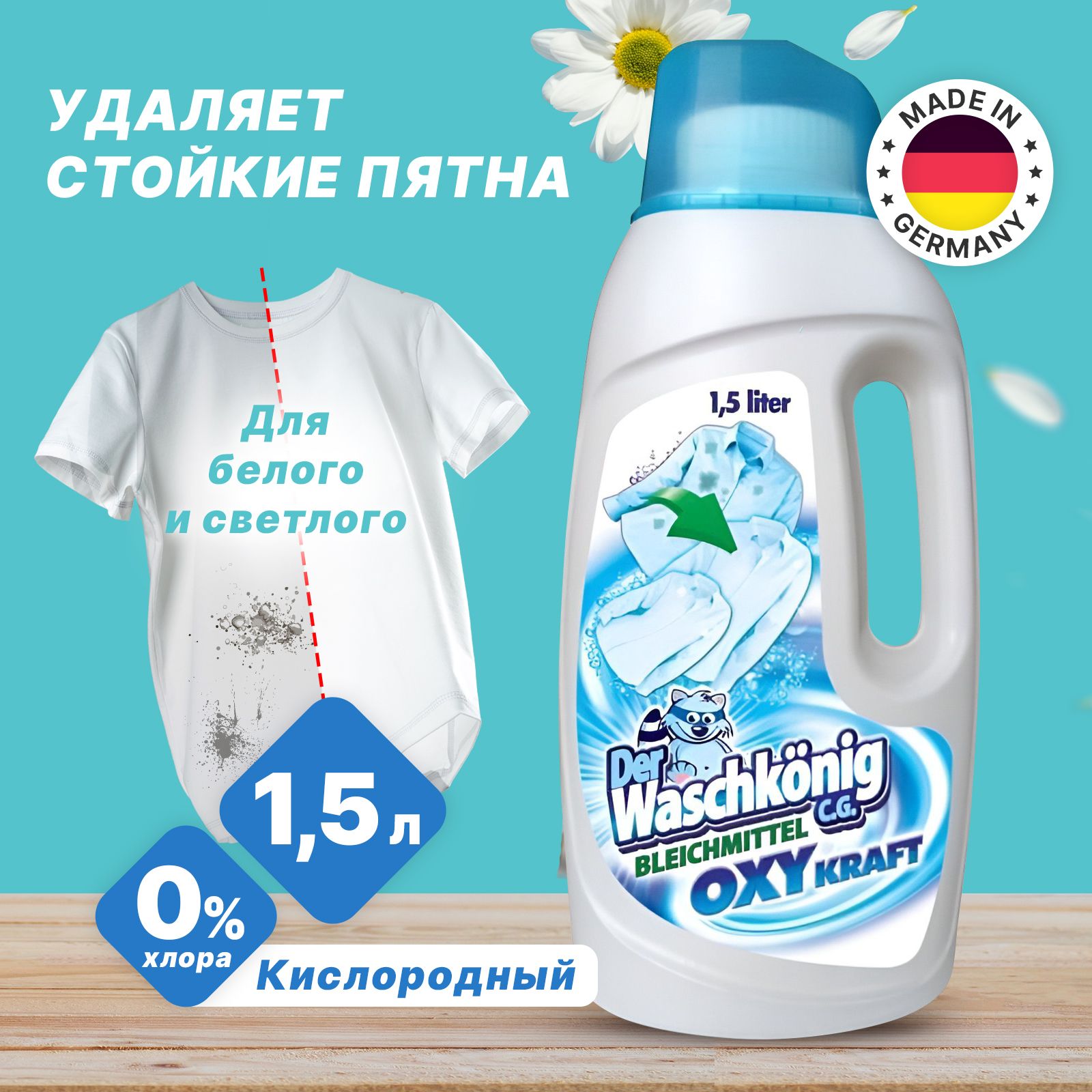Жидкий пятновыводитель отбеливатель для белья и одежды Der Waschkonig C.G. 1500 (Германия) для стирки и замачивания вещей, от крови, жира, пота