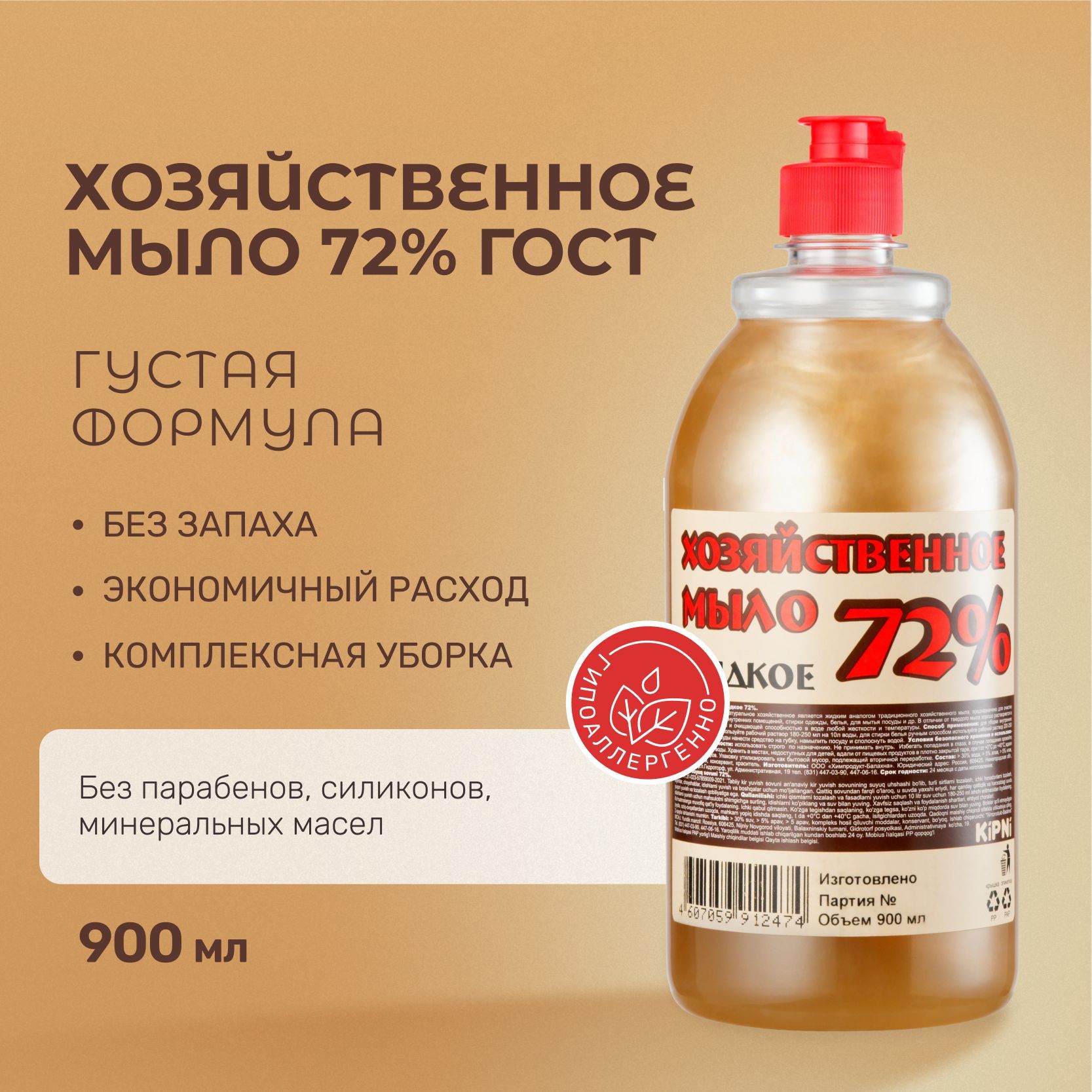 Жидкое хозяйственное мыло для кухни и дома имеет мягкую формулу, которая бережно удаляет грязь и жир, не повреждая поверхности. Оно легко смывается водой и не оставляет никаких пятен или разводов на поверхностях. Благодаря натуральному составу, мыло хозяйственное 72% бережно ухаживает за кожей рук, не сушит ее и не вызывает раздражения. Мыло хозяйственное жидкое имеет высокую концентрацию, поэтому даже небольшое количество мыла достаточно для очистки большой поверхности. Средство очень экономично в использовании, и его хватит на долгое время.