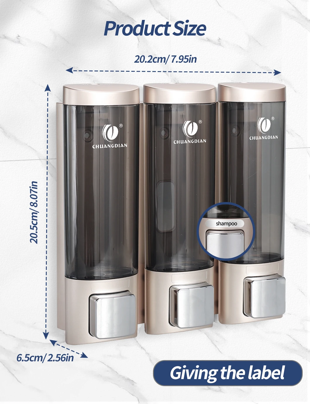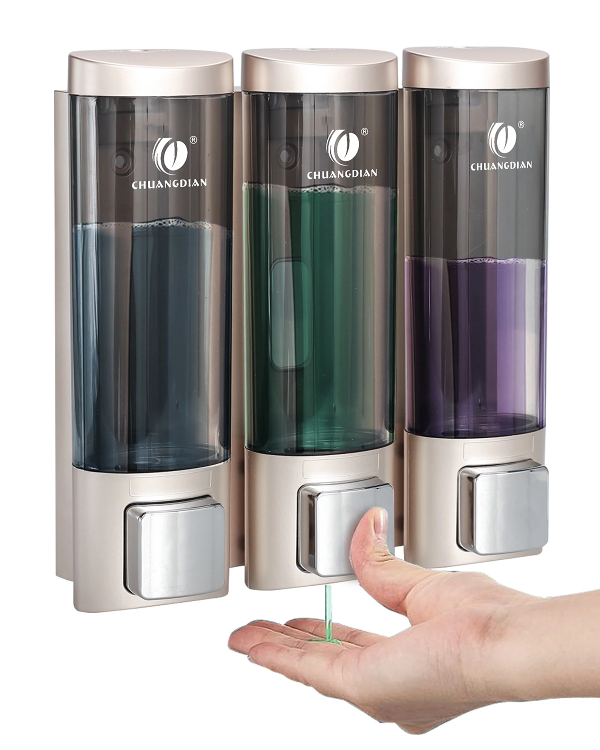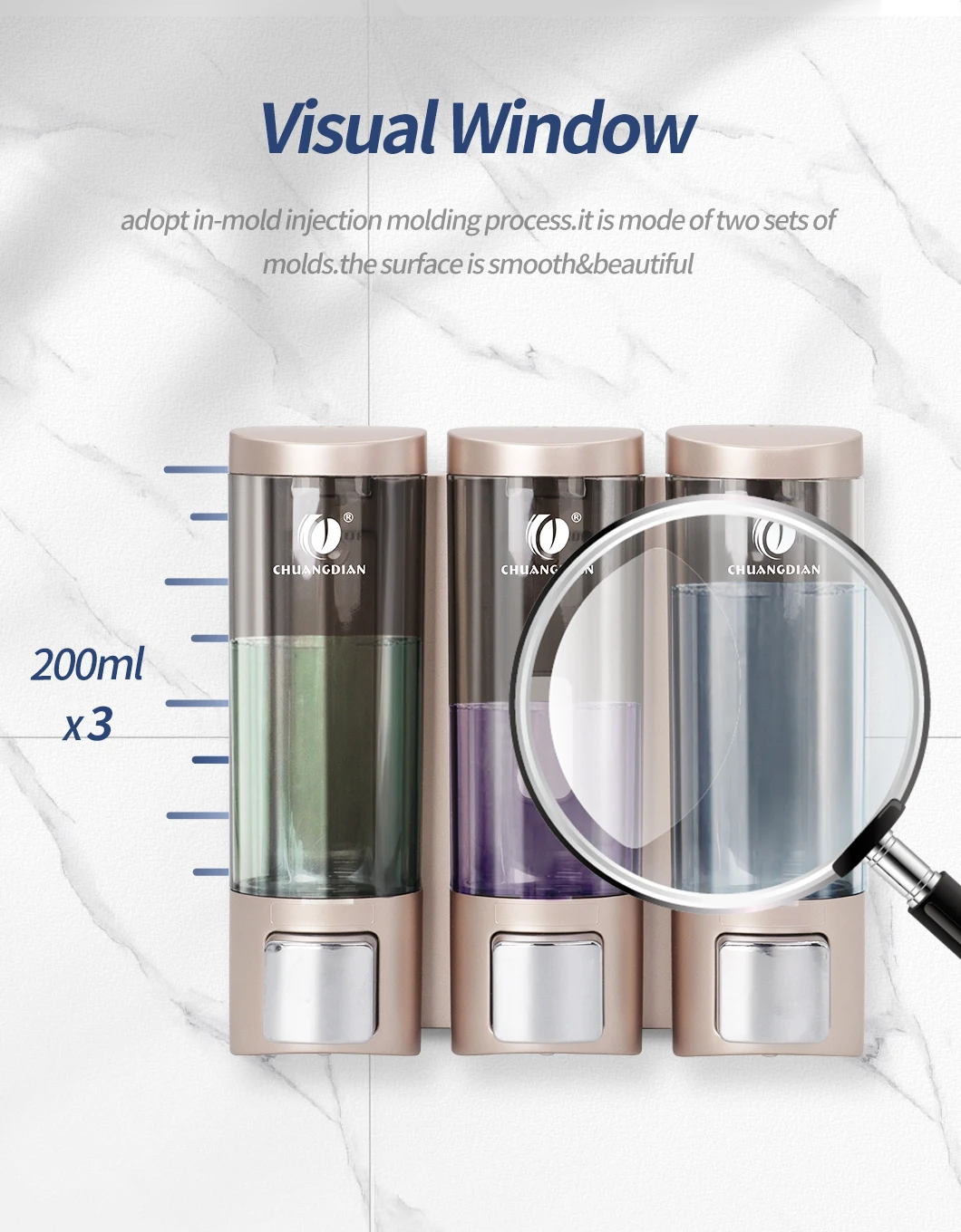 2,3-диспенсеры для чашек: с емкостью 3x200 мл, Диспенсер может содержать большое количество жидкого мыла, домашних лосьонов, шампуней и т. д. с деликатным выходом, не капать без вытягивания, нет грязных пятен и не теряет мыло.