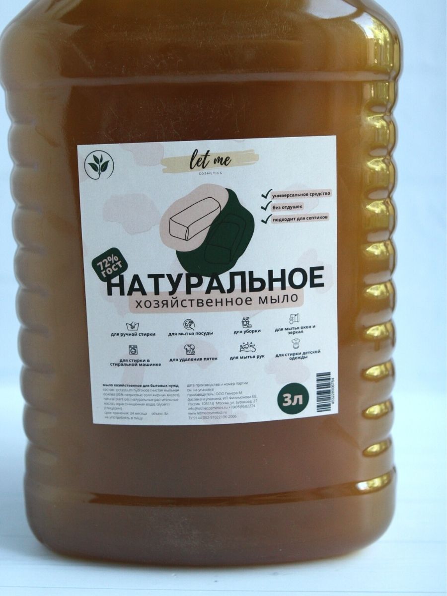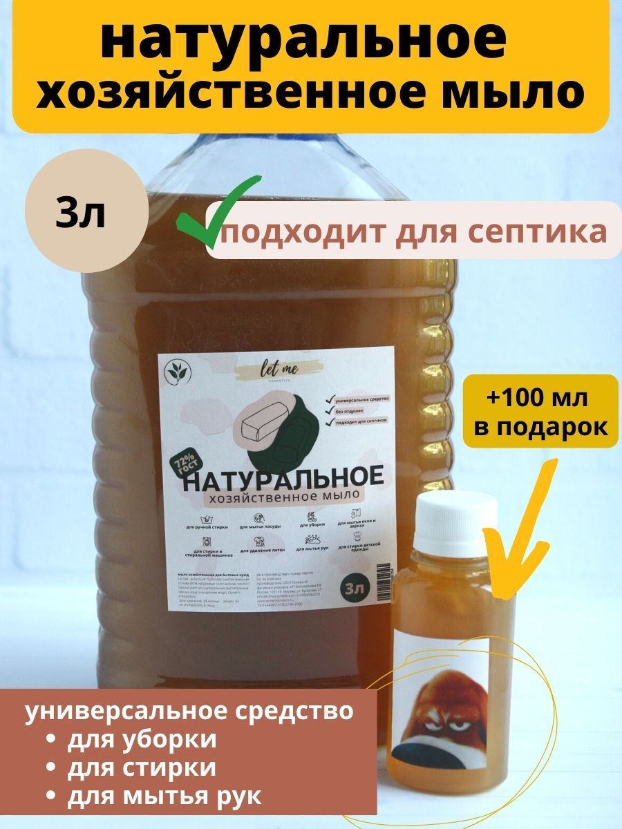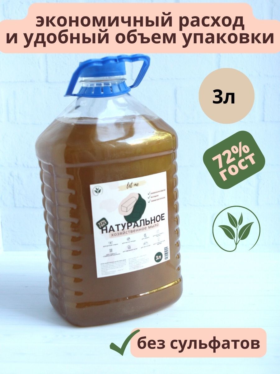 • Жидкое хозяйственное мыло, объем 3л. Антибактериальное средство для уборки, чистки, стирки, мытья пола и посуды.   Хозяйственное мыло для комплексной уборки позволяет содержать дом в идеальной чистоте без вреда для здоровья вашей семьи и окружающей среде. Состав хозяйственного мыло натуральный. Подходит для стирки детского белья. Мыло без отдушек, что важно для ухода за детской одеждой. Не вызывает аллергию.