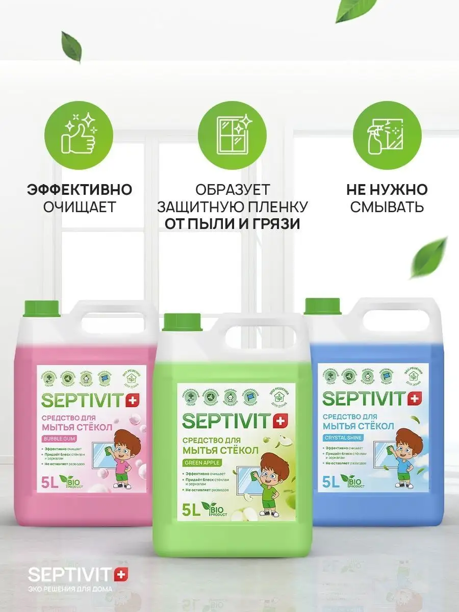 Описание: Средство для мытья СТЕКОЛ SEPTIVIT Premium с антибактериальным эффектом в удобном экономичном объеме 5 литров (5000 мл). Средство эффективно и бережно очищает стеклянные, зеркальные и глянцевые поверхности, удаляя загрязнения без разводов, образует защитную пленку от пыли и грязи. Специально разработанная формула позволяет без труда очистить загрязненные поверхности и придать им антистатический эффект. Состав продукции бренда SEPTIVIT Premium / Септивит разработан по высоким европейским стандартам качества. Все компоненты, используемые в составе средств биоразлагаемы и гипоаллергенны. Средство не содержит агрессивных сульфатов и фосфатов. Septivit Premium - ЭКО-решения для Вашего дома!