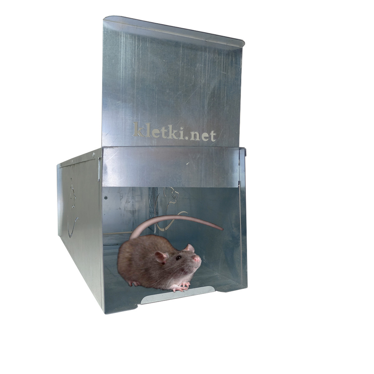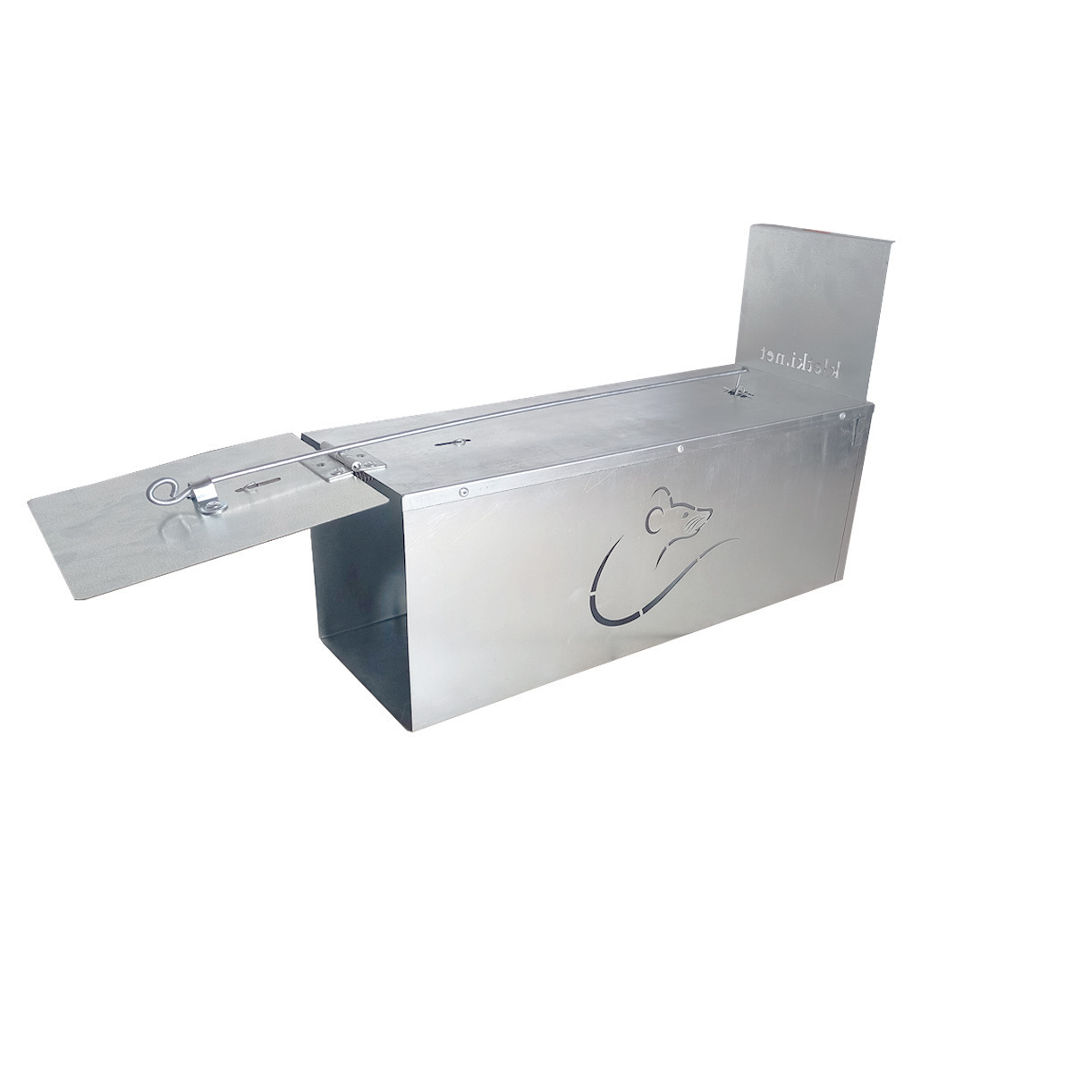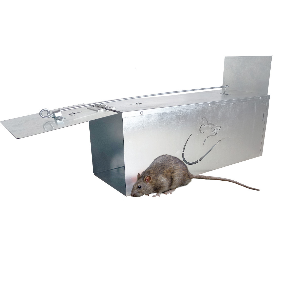 Запорная пружина дверки крысоловки фиксируется с помощью штанги на верхней части изделия. На иглу находящуюся внутри накалывается приманка. Как только зверек дотронется до приманки дверка захлопывается и крыса попадает в западню. Дверка ловушки надежно фиксируется при помощи мощной пружины. Для насадки приманки и безопасной выемки животного имеется резервная дверца.
