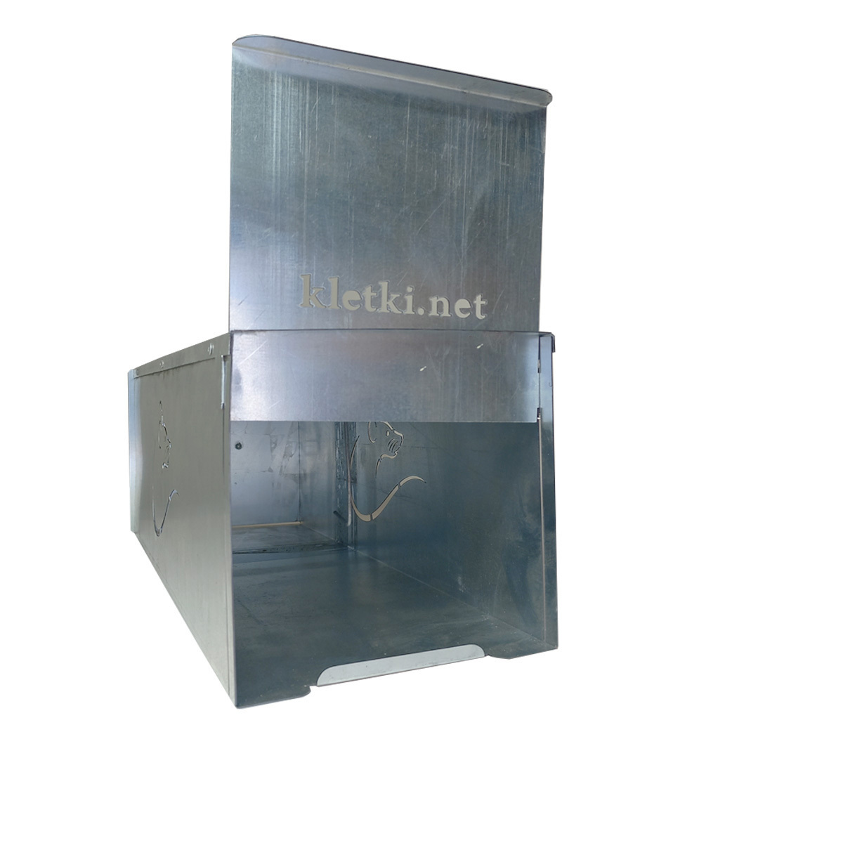 Крысоловка изготовлена из металлического листа, представляет собой емкость в виде параллелепипеда с отверстиями для естественной вентиляции. Внутри ловушки установлен крючок для насадки приманки.
