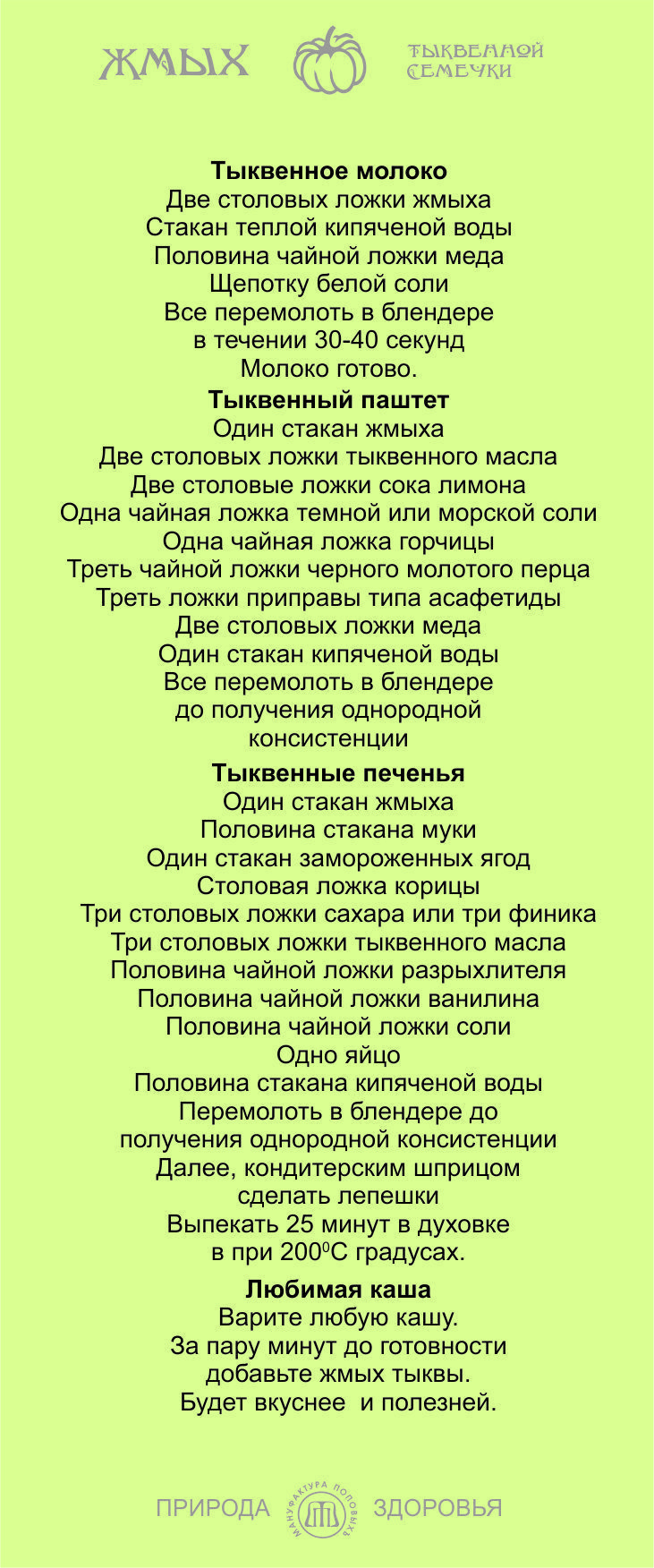 Описание: Жмых остается после холодного отжима тыквенных семян. В результате получается тыквенный жмых, в котором остается белок (около 45%), углеводы (около 20%) и жиры (около 18%). Тыквенный жмых содержит протеины (не более 33%), клетчатку (не более 5%), а также пищевые волокна, полиненасыщенные жирные кислоты (омега-3 и омега-6), минеральные, макро и микроэлементы (магний, кальций, марганец, цинк, железо) и витамины (B1, B2, B3, B6, A, K). При потреблении тыквенного жмыха с едой (с кашами или белково-витаминными коктейлями) нормализует функционирование печени и уровня холестерина, нормализует обмен веществ и пищеварение, уменьшает интоксикацию организма и повышает потенцию, предупреждает развитие аденомы и паразитов в желудке. Жмых можно использовать для выпечки, в панировке для котлет, биточков, зраз, тем самым увеличивая их пищевую ценность. Протеин в тыквенном жмыхе полезен при составлении рациона для людей, ведущих активный образ жизни. Две пары столовых ложек тыквенного жмыха обеспечивают организму суточную норму цинка, марганца. Тыквенный жмых в составе масок, кремов и лосьонов, благодаря высокому процентному содержанию витаминов группы В, поддерживает здоровье ногтей, волос и кожи.