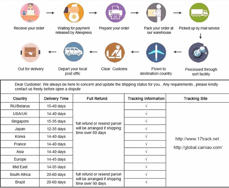 Пожалуйста, сначала свяжитесь с нами, мы будем отслеживать ваш товар. Если вы не можете получить его, мы полностью вернем Вам деньги или отправим его повторно. Мы честный продавец, поэтому не волнуйтесь.