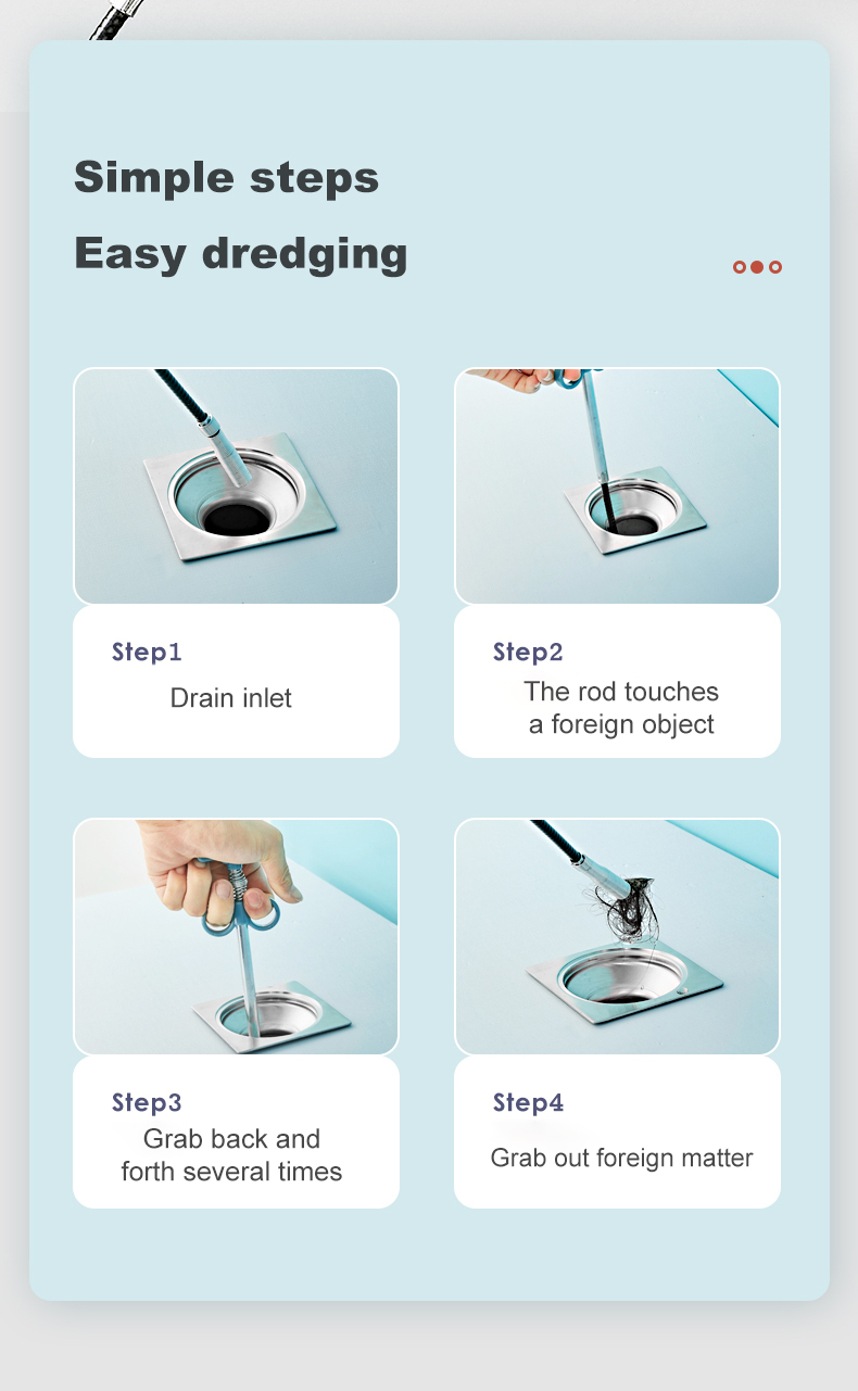 Из стока в полу можно вынуть золотые и серебряные украшения и волосы. Он очень подходит для мытья ванных комнат, кухонь, раковин, ванн, труб, стоков, канализации и других мест, которые часто блокируются. Многослойная дренажная змея эффективно улавливает волосы, пищу и другие засоры.