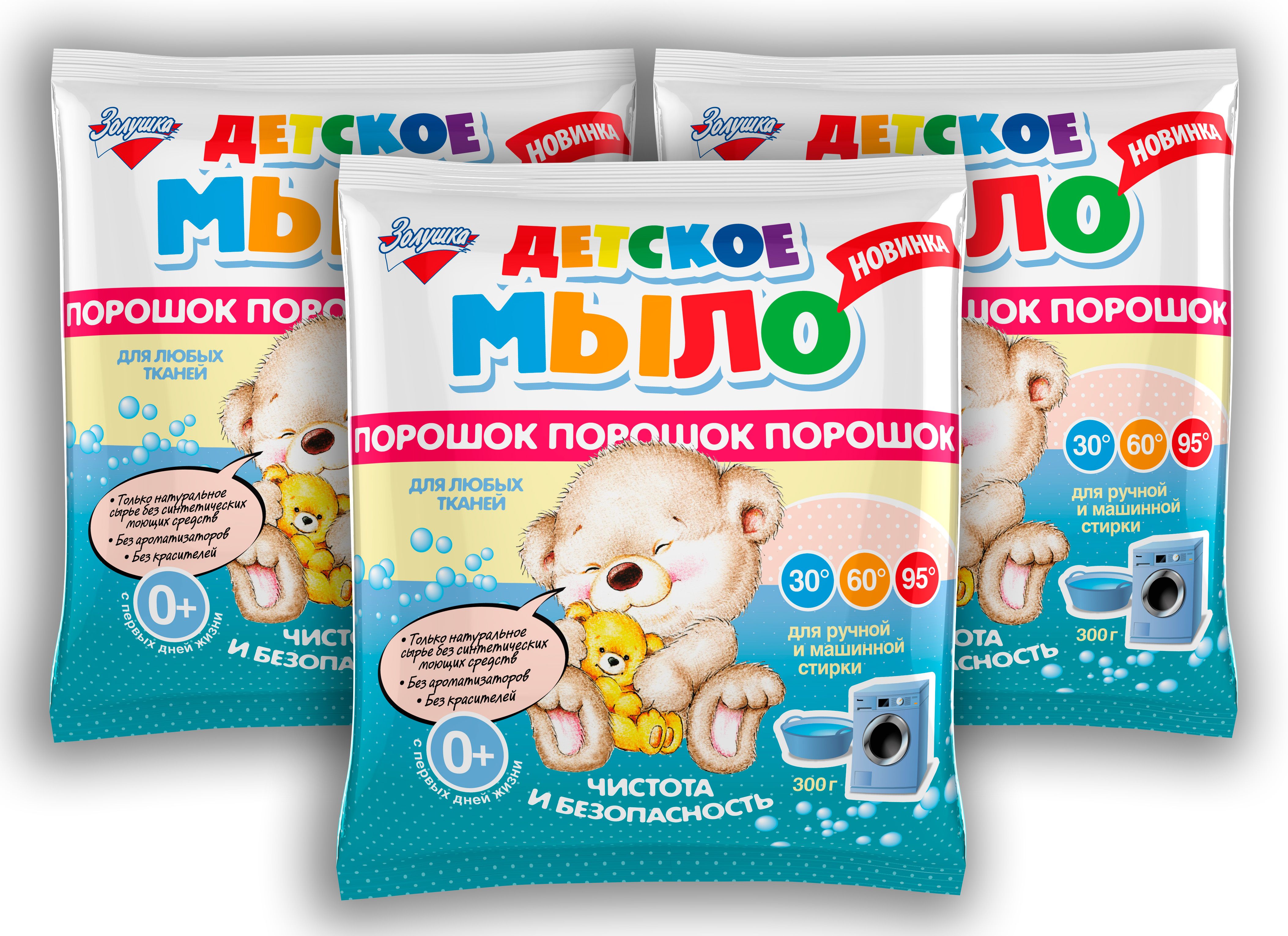 ЗОЛУШКА: Стиральный порошок "Детское мыло", 0+, 300 г, пакет, 3 штуки