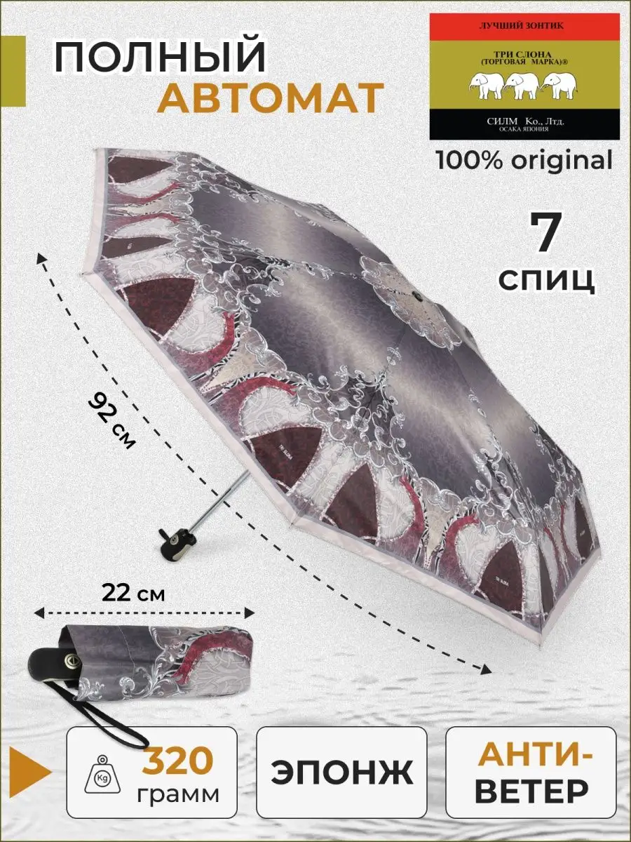Описание: Производство зонтов под брендом Три слона было начато 120 лет назад. Первое время мануфактура, расположенная на территории Японии, носила название Футагава Кайша Лтд. и сменила его только в 1985 году на СИЛМ Ко., Лтд. На территории СССР продукция Три слона появилась примерно в 1970 году. Материал купола эпонж это хлопчатобумажная или шелковая ткань с шероховатой поверхностью, на которой вода превращается в капельки и скатывается, а сам зонт остается сухим. Ручка зонта выполнена из дерева, имеет длинный шнурок, дающий возможность ношения зонта через плечо. Зонт трость имеет усиленный каркас в 24 спиц. Конструкция зонта из комплекса пружин и звеньев спиц изготовлена из гибкого и упругого материала углепластика и фибергласса. Места сочленения спиц защищены от протирания дополнительными кусочками ткани. Пружины защищают зонт от поломок при выворачивании от ветра. Конструкция зонта выполнена из алюминия, раздвижной стержень из металла.