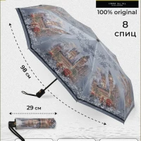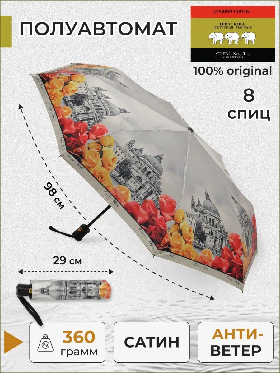 Описание: Разнообразная модель зонтов бренда Три Слона с городами, архитектурой, достопримечательностями, узорами и орнаментами подойдет для мужчин, женщин, детей. Характеристики: полуавтомат, 8 спиц, вес 360 гр, 3 сложения, длина в сложенном виде 30 см, фактический диаметр купола 98 см, материал купола Полиэстер и Сатин, материал ручки пластик, материал каркаса и спиц сталь, алюминий, фибергласс. На мужской, женский и детский зонты мы предоставляем гарантию 6 месяцев. Во все наши зонты встроена система антиветер. В комплекте зонт и чехол. Три Слона-это знаменитый во всем мире и постсоветском пространстве бренд зонтов, качество которых проверено годами. Наша продукция 100% оригинальная, имеет все фирменные бирки, заводские выштамповки и голографические наклейки, которые подтверждают безупречное качество.