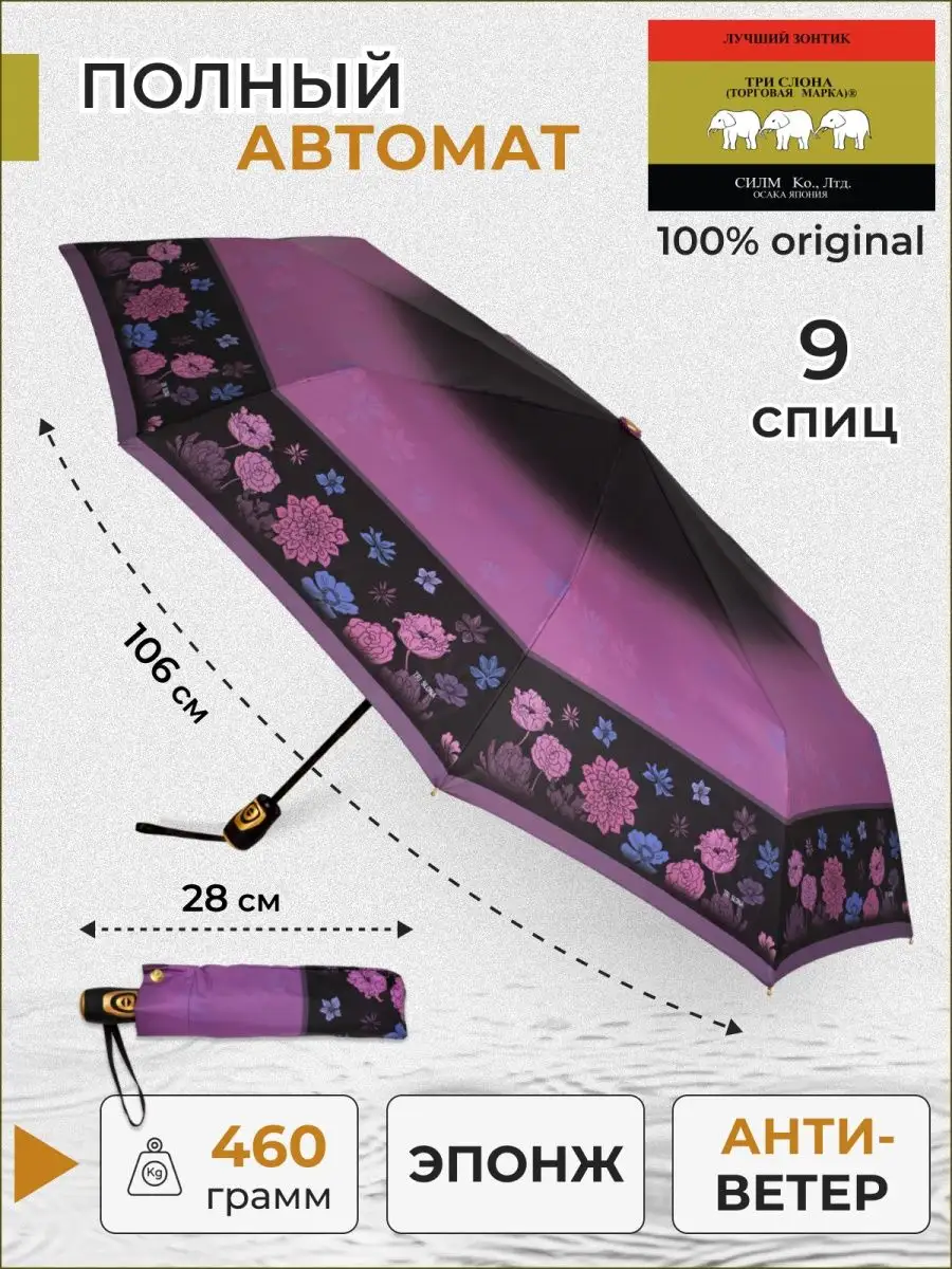 Описание: Аккуратная модель зонтов бренда Три Слона с цветами и плавным цветовым переходом подойдет для мужчин, женщин, детей. Характеристики: полный автомат, 9 спиц, вес 460 гр, 3 сложения, длина в сложенном виде 30 см, фактический диаметр купола 104 см, материал купола Полиэстер, материал ручки пластик, материал каркаса и спиц сталь, алюминий, фибергласс. На мужской, женский и детский зонты мы предоставляем гарантию 6 месяцев. Во все наши зонты встроена система антиветер. В комплекте зонт и чехол. Три Слона-это знаменитый во всем мире и постсоветском пространстве бренд зонтов, качество которых проверено годами. Наша продукция 100% оригинальная, имеет все фирменные бирки, заводские выштамповки и голографические наклейки, которые подтверждают безупречное качество.