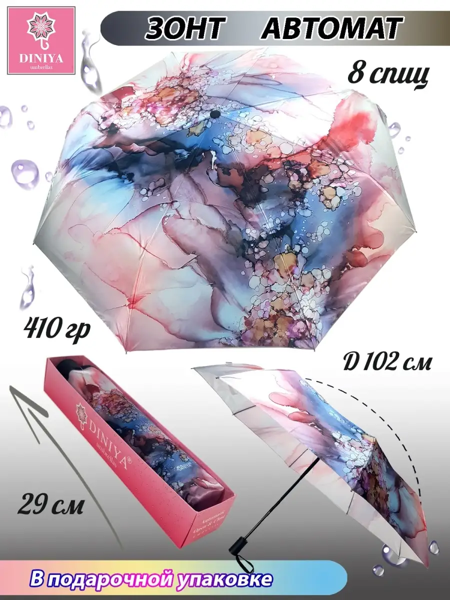 Описание: Зонт "Акварельные краски" от бренда Diniya - это стильный и практичный аксессуар, который станет незаменимым помощником в любую погоду. Прочный стальной каркас с антикоррозийным покрытием и 8 спиц обеспечивают надежность и долговечность зонта. Система антиветер позволяет ему оставаться устойчивым даже при сильном ветре. Нескользящая прорезиненная ручка Soft Touch делает использование зонта более удобным и комфортным. Купол диаметром 102 см выполнен из водоотталкивающего сатина, что обеспечивает надежную защиту от дождя и снега. Складной механизм в 3 сложения позволяет легко хранить и носить зонт с собой. Облегченная конструкция весом 410 г и длиной в сложенном виде всего 29 см делает этот зонт идеальным выбором для женщин, девушек, подростков и детей. В комплекте с зонтом идет двойной непромокаемый чехол, который защищает его от повреждений и загрязнений. А подарочная коробочка придает зонту еще больше элегантности и стиля. Зонт "Акварельные краски" - это не только стильный аксессуар, но и полезный предмет в повседневной жизни. Он защитит вас от непогоды и подарит комфорт в любой ситуации.