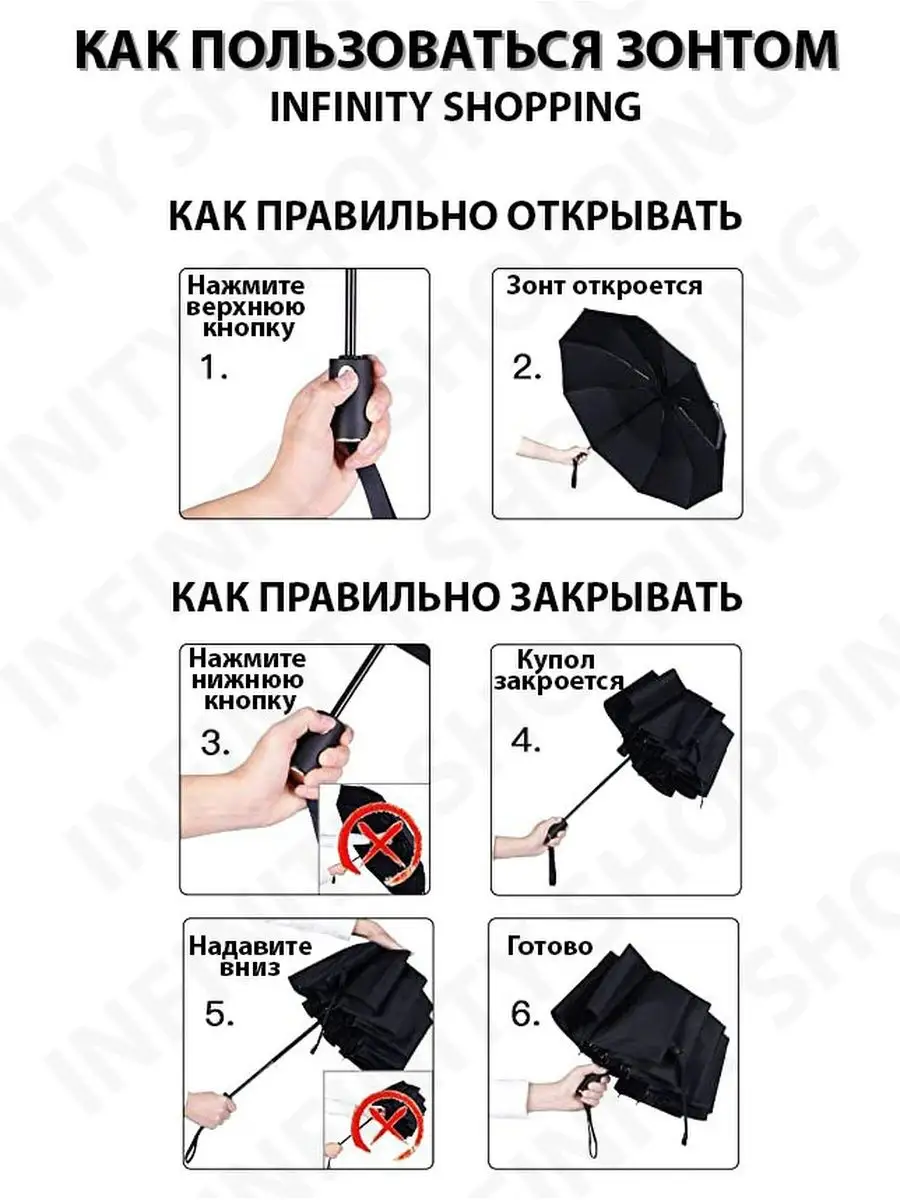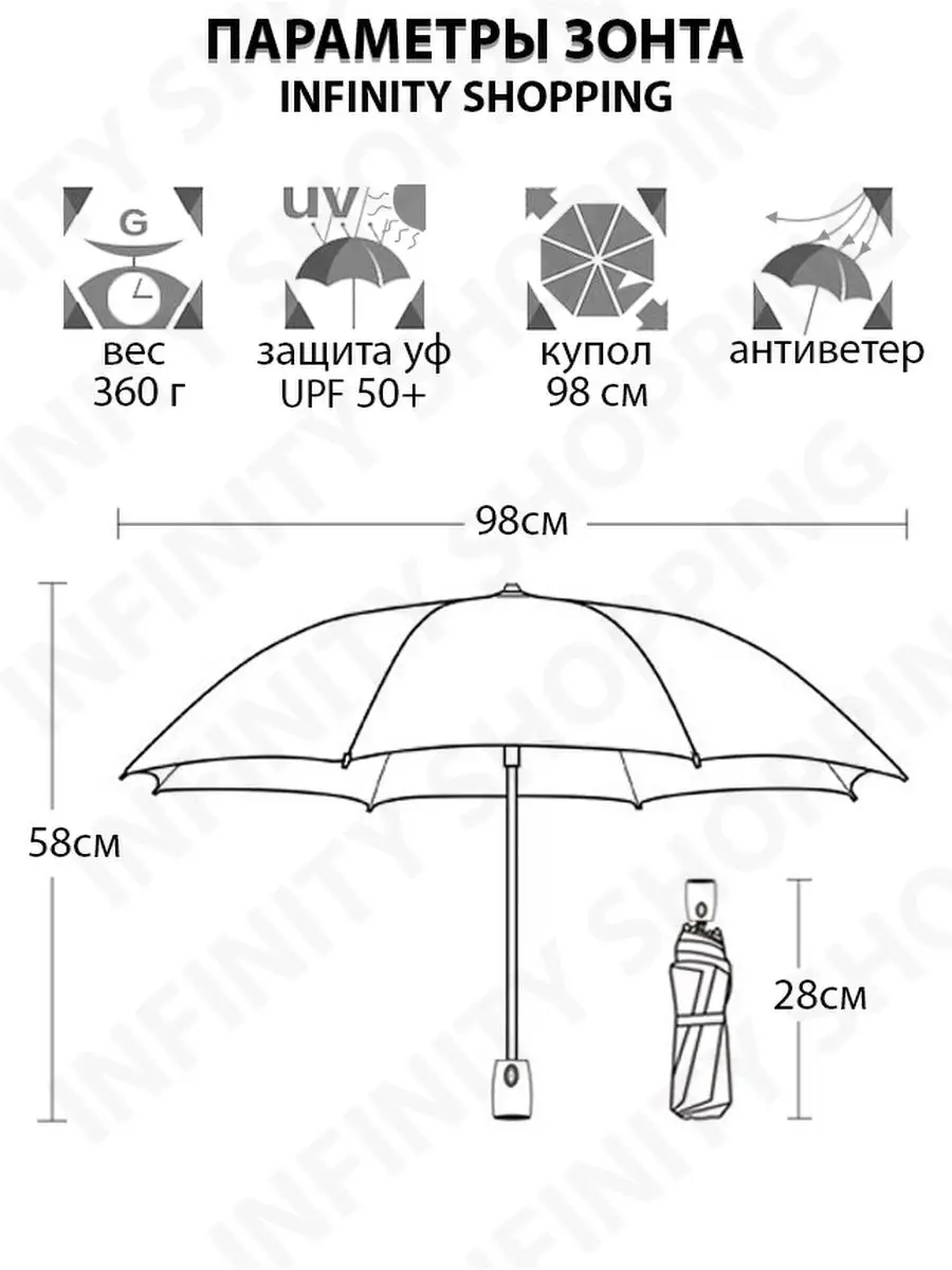 Описание: Встречайте сезон с модным зонтом бренда Infinity Shopping! Стильный и практичный. Большой автоматический зонт открывается по нажатию кнопки. Зонт автомат женский изготовленный из материала обеспечивающий 100% защиту от дождя. С нашим брендовым зонтом Вы будите выглядеть шикарно на прогулке. Имеется аксессуар для зонта - чехол. Зонтик автомат женский стильный, красивый, прочный зонт на все случаи жизни! Стильный дизайн позволяет использовать модный зонт как реквизит для фотосессии. Зонтик женский защитит во время прогулки от дождя и летнего зноя. Компактный зонт имеет небольшой размер в сложенном виде, обеспечивает компактное хранение дома или в автомобиле. Красивый зонт женский упакован в подарочную коробку и станет прекрасным подарком для любимой, маме, подруге, жене, дочке, бабушке, коллеге, на день рождения, подарок на юбилей, на выпускной, на Новый год, на 8 марта, 14 февраля. Зонт мини отлично подойдёт для путешествий, отпуска, командировки. Зонт брендовый модный женский автомат подчеркнёт ваш стиль и прекрасный вкус! Будем рады обратной связи! Нас ищут: зонт женский; женский зонт автомат; зонтик женский; стильный зонт; зонт шанель; зонт гуччи; зонт луи виттон; зонт автомат; зонт большой; зонт мини; зонт необычный; стильный зонт; зонт мужской автомат черный; зонт трость; прозрачный зонт; зонт прозрачный женский; зонты женские; зонт женский прозрачный; зонт от солнца; зонт женский мини; зонт женский автомат антиветер; зонт женский автомат