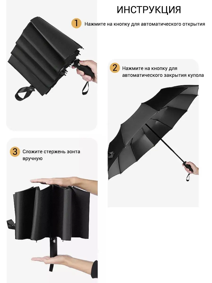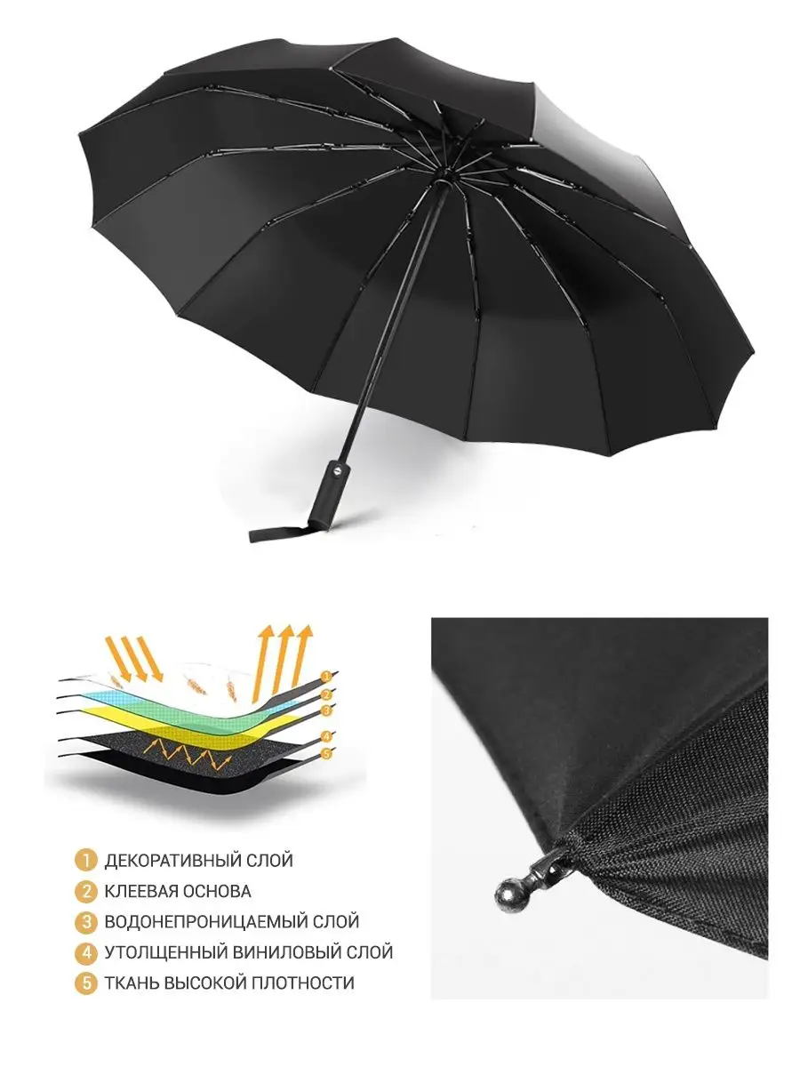 Описание: Зонт автомат премиум качества со стальным каркасом и прочной тканью из износостойкого материала. Оснащен системой антиветер, надежно защитит вас от дождя даже в самый ненастный день. Автоматический зонт открывается за 1 секунду и легко складывается с помощью нажатия кнопки. Зонты идут в комплекте с чехлами, поэтому их удобно хранить в машине, сумке, рюкзаке и не переживать, что другие вещи промокнут. Складной черный зонт имеет 12 прочных стальных спиц и матовое противоскользящее прорезиненное покрытие ручки. Этот аксессуар станет вашим фаворитом при первом же использовании. Маленький, облегченный, компактный зонтик с большим куполом идеальный вариант для ежедневного использования в ненастный период. Зонтики универсальные, унисекс, подходят для женщин и мужчин, взрослых и детей. Прочный и качественный чёрный зонт - это не только необходимый аксессуар для себя, но и полезный подарок другу, подруге, парню и девушке на новый год, день рождения и прочие праздники. Вы будете довольны нашими зонтами, если вас интересовали: прочный зонтик от дождя и солнцезащитный, подростковый, семейный однотонный в стиле минимализм с системой антишторм. Пользуйтесь зонтами с удовольствием!)