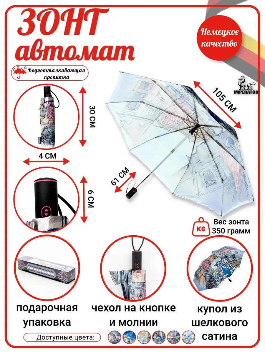 Описание: Женский складной зонт автоматический тм Imperator – невероятно красивый, компактный, легкий, а значит очень удобный аксессуар, который всегда защитит вас от мокрого снега, дождя, знойного солнца или ветра. Стильный зонт имеет маленький размер и свободно помещается в женской сумочке (сумку) или рюкзаке, что делает его идеальным выбором для девушек и женщин любого возраста. Благодаря маленькому весу и габаритам им сможет пользоваться маленький мальчик или девочка (как детский зонт), девушка подросток (подростковый), и женщина любого возраста. Технические параметры: материал купола – шелковый сатин с водоотталкивающей пропиткой. Диаметр купола в раскрытом состоянии 105 см. Механизм открытия – полный автомат в три сложения - с 8 сталь ными спицами и системой Антиветер. Ручка изготовлена из качественного мягкого материала резина под каучук soft-touch. Вес зонта 350 грамм, в закрытом (в сложенном) состоянии зонт довольно маленький и компактный - с чехлом 30 см в длину. Он почти как мини - зонт. Маленькие зонтики Imperator имеют яркий оригинальный рисунок на весь большой купол зонта, что существенно отличает его от аналогичных зонтов других производителей. Такой дизайн всегда будет выделять вас на улице и привлекать внимание прохожих. В плохую погоду будет поднимать вам настроение своим ярким дизайном. Сам облегченный купол изготовлен из мягкого, но прочного материала (шелковый сатин), его приятно держать в руках и использовать во время дождя. Для производства каркаса автоматического зонта мы используем механизм немецкого производителя с функцией "Smart open". Такой механизм обеспечивает мягкое и плавное открытие и закрытие зонта. При открывании купольный зонт не дергает, открывается без рывков и никогда не выпадет из рук, что очень важно когда на улице грязь и слякоть. И при этом усиленный механизм очень прочный и прослужит вам очень долгое время даря комфорт и радость использования. Механизм нашего зонта с системой Антиветер / Антишторм, который не дает зонту сломать даже в самый сильный ветер или ураган. При максимальном давлении на купол, спицы зонта рассчитаны на то, что бы перевернуть купол в обратную стороны. Эта система Антиветер не дает сломать спицы или порвать купол. Купол изготовлен из шелкового сатина и имеет водоотталкивающую пропитку. Дополнительно материал купола имеет водоотталкивающую пропитку, что позволяет зонту не впитывать влагу, во время дождя он не становится тяжелее и быстрее сохнет после прогулки. В комплект к зонту входит удобный чехлом для хранения, который выполнен в одном дизайне с куполом зонта. Чехол на молнии и кнопке. С одной стороны, благодаря этому зонт имеет очень презентабельный и благородный вид, а с другой делает его очень удобным в использовании. Зонт после использования свободно и легко помещается в чехол, его не нужно пытаться впихнуть и тем самым не портится рисунок и дизайн купола и увеличивается его долговечность. Купив красивый и качественный зонт один раз, вы будете испытывать комфорт использования зонта каждый раз при необходимости. Зонтик аксессуар складной подойдет на зиму, весну, лето и осень, защитит от мокрого снега, дождя, ветра и знойного солнца. Благодаря компактным размерам и удобной ручке зонт можно взять с собой на прогулку, повседневной поездки на работу, путешествию, в машину, в 