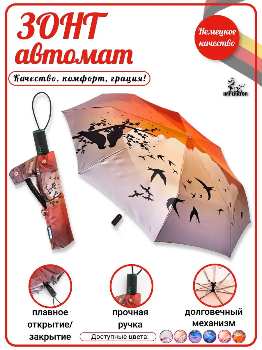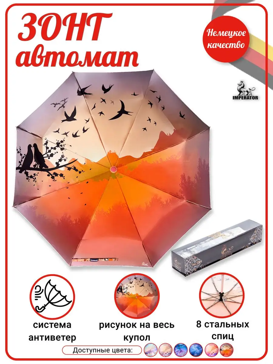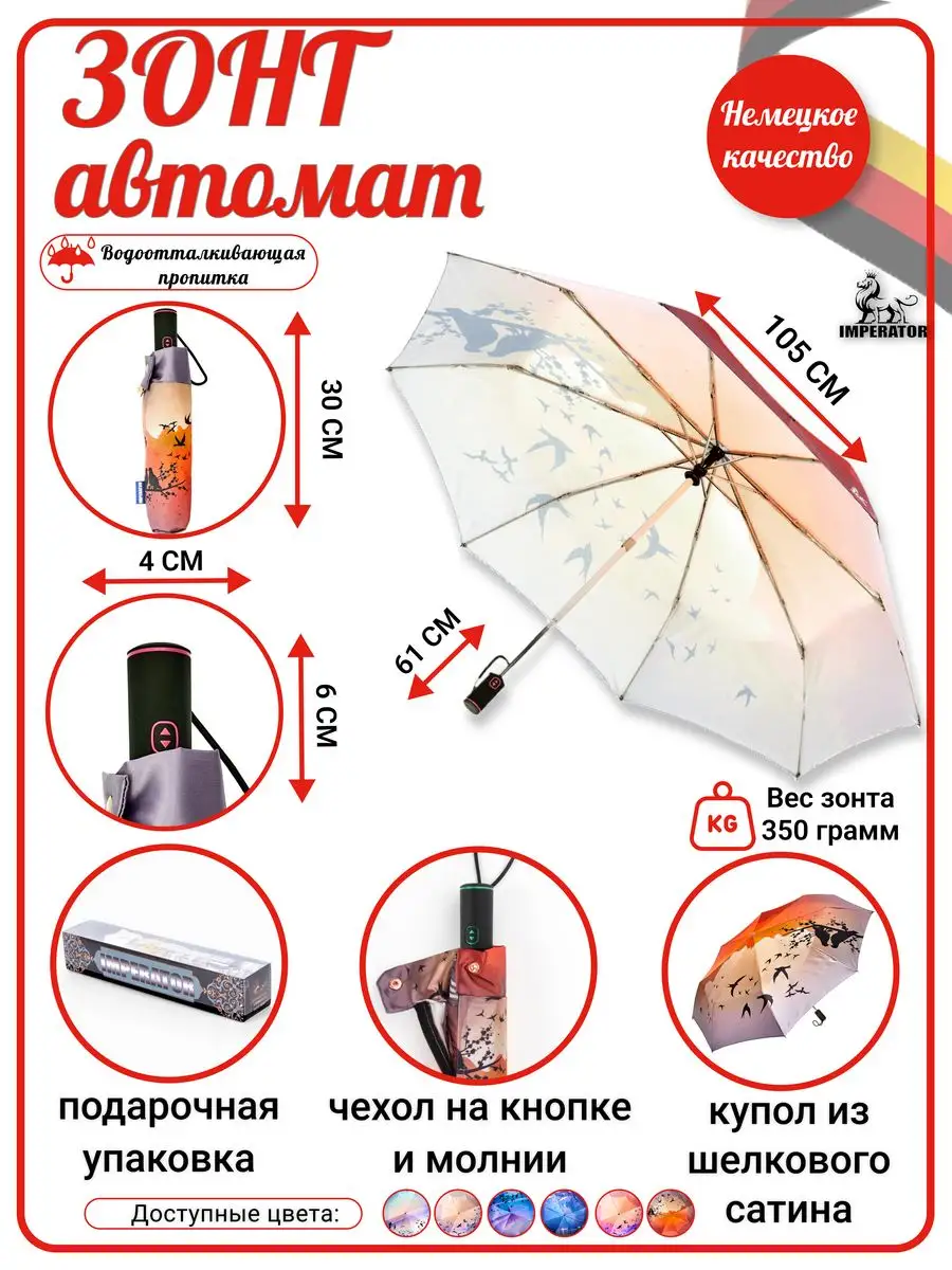 Описание: Женский складной зонт автоматический тм Imperator – невероятно красивый, компактный, легкий, а значит очень удобный аксессуар, который всегда защитит вас от мокрого снега, дождя, знойного солнца или ветра. Стильный зонт имеет маленький размер и свободно помещается в женской сумочке (сумку) или рюкзаке, что делает его идеальным выбором для девушек и женщин любого возраста. Благодаря маленькому весу и габаритам им сможет пользоваться маленький мальчик или девочка (как детский зонт), девушка подросток (подростковый), и женщина любого возраста. Технические параметры: материал купола – шелковый сатин с водоотталкивающей пропиткой. Диаметр купола в раскрытом состоянии 105 см. Механизм открытия – полный автомат в три сложения - с 8 сталь ными спицами и системой Антиветер. Ручка изготовлена из качественного мягкого материала резина под каучук soft-touch. Вес зонта 350 грамм, в закрытом (в сложенном) состоянии зонт довольно маленький и компактный - с чехлом 30 см в длину. Он почти как мини - зонт. Маленькие зонтики Imperator имеют яркий оригинальный рисунок на весь большой купол зонта, что существенно отличает его от аналогичных зонтов других производителей. Такой дизайн всегда будет выделять вас на улице и привлекать внимание прохожих. В плохую погоду будет поднимать вам настроение своим ярким дизайном. Сам облегченный купол изготовлен из мягкого, но прочного материала (шелковый сатин), его приятно держать в руках и использовать во время дождя. Для производства каркаса автоматического зонта мы используем механизм немецкого производителя с функцией "Smart open". Такой механизм обеспечивает мягкое и плавное открытие и закрытие зонта. При открывании купольный зонт не дергает, открывается без рывков и никогда не выпадет из рук, что очень важно когда на улице грязь и слякоть. И при этом усиленный механизм очень прочный и прослужит вам очень долгое время даря комфорт и радость использования. Механизм нашего зонта с системой Антиветер / Антишторм, который не дает зонту сломать даже в самый сильный ветер или ураган. При максимальном давлении на купол, спицы зонта рассчитаны на то, что бы перевернуть купол в обратную стороны. Эта система Антиветер не дает сломать спицы или порвать купол. Купол изготовлен из шелкового сатина и имеет водоотталкивающую пропитку. Дополнительно материал купола имеет водоотталкивающую пропитку, что позволяет зонту не впитывать влагу, во время дождя он не становится тяжелее и быстрее сохнет после прогулки. В комплект к зонту входит удобный чехлом для хранения, который выполнен в одном дизайне с куполом зонта. Чехол на молнии и кнопке. С одной стороны, благодаря этому зонт имеет очень презентабельный и благородный вид, а с другой делает его очень удобным в использовании. Зонт после использования свободно и легко помещается в чехол, его не нужно пытаться впихнуть и тем самым не портится рисунок и дизайн купола и увеличивается его долговечность. Купив красивый и качественный зонт один раз, вы будете испытывать комфорт использования зонта каждый раз при необходимости. Зонтик аксессуар складной подойдет на зиму, весну, лето и осень, защитит от мокрого снега, дождя, ветра и знойного солнца. Благодаря компактным размерам и удобной ручке зонт можно взять с собой на прогулку, повседневной поездки на работу, путешествию, в машину, в 