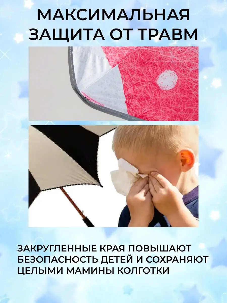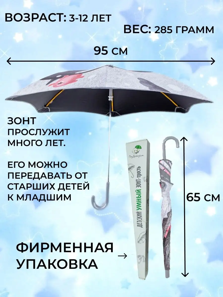 Описание: Безопасный детский зонт трость высокого качества! Это зонт, который Вы покупаете для своего ребенка на много лет, а потом передаёте младшим детям или племянникам. Скругленные углы без торчащих спиц позволяют быть уверенным, что ребенок будет в безопасности, не ткнет другого ребенка в голову или глаз и не зацепит мамины колготки. Каждая спица спрятана в свой защитный кармашек, пружина механизма находится в пластиковой капсуле. Светоотражающая лента на зонте обеспечит безопасность Вашему ребенку в темное время суток. Водитель всегда сможет увидеть ребенка на дороге или пешеходном переходе. Зонт механический, складывается без усилий.Усиленные, гнущиеся, прорезиненные спицы с безопасными наконечниками и дополнительными соединителями обеспечат защиту от случайной поломки спиц при сильном ветре, падении, изгибах или ударах. Их практически невозможно сломать. Это защитит Вашего ребенка от травм при случайном падении или играх с зонтом.Яркие расцветки с милыми и добрыми мульт персонажами понравятся детям. Детский зонтик предназначен для тех детей, которые не любят дождевики. Зонт - стильный детский аксессуар, его можно подобрать под цвет одежды.Зонт трость очень легкий, имеет 6 пластиковых спиц. Материал купола винил.Доставляется в защитной коробке. Детский зонт необходим ребенку в любое время года, и зимой и летом.Подходит в качестве подарка для мальчика и для девочки 3-10 лет на день рождения или любой другой праздник.