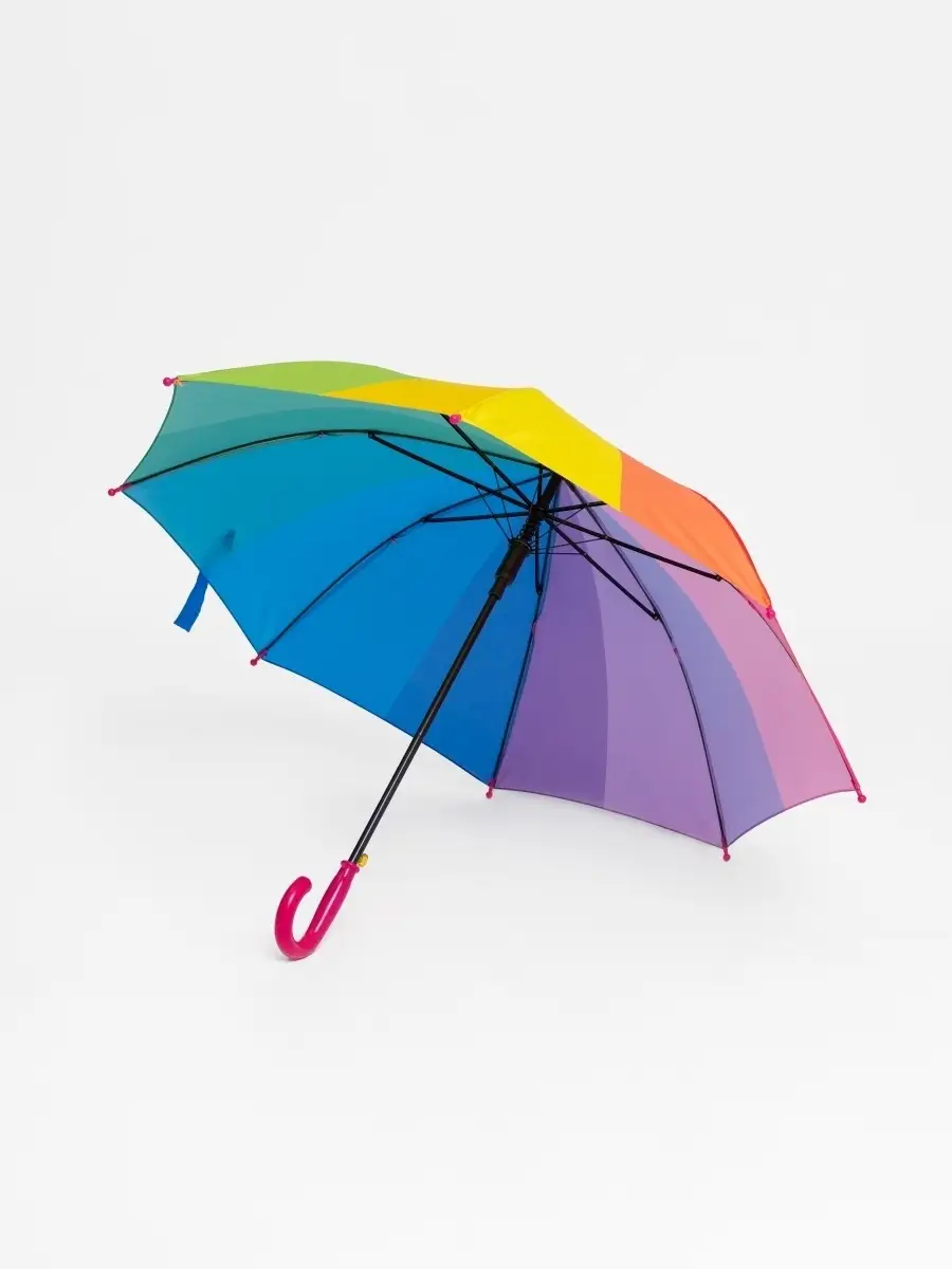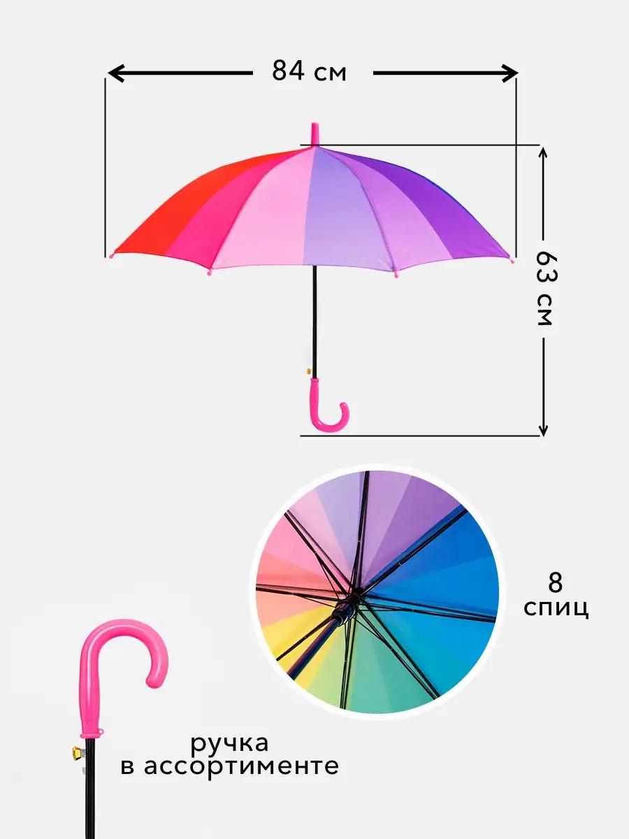 Описание: Зонт – элегантный и необходимый аксессуар, который должен присутствовать в гардеробе каждого человека, вне зависимости от возраста и пола. Так компактный детский разноцветный зонтик обязан быть у ребенка. Необычная расцветка поднимет настроение даже в самый пасмурный день и сделает прогулку под дождем приятной. Летом такой зонт может послужить защитой от дождя и солнца, а в дождливую пору он не просто защитит от промокания, но и поднимет настроение. Детский радужный зонт трость имеет не большой вес, что очень важно при выборе для маленькой девочки или мальчика, ведь детские зонты должны быть легкими. Максимально простой и надежный полуавтоматический механизм складывания, с одним сложением. Восемь спиц, не скользящую ручку крючок, ветроустойчивый купол. Школьник с легкостью раскроет и сложит зонт самостоятельно. Усиленные спицы сделаны из углепластика, жесткие, упругие и не сломаются, если ребенок уронит зонт или наступит на него. Такой зонт будет отличным подарком для Вашего чада и универсальным дополнением к яркому образу взрослой женщины или подростка. В нашем магазине представлено большое количество разнообразных видов детских зонтов. Они имеют разные расцветки и элементы декора: со свистками и без. Зонты максимально красивые, с любимыми героями, чтобы поднимать ребенку настроение. Можно выбрать зонт с любым персонажем из мультиков / мультфильмов: Щенячий патруль, Человек-паук, Халк, Веном, Марвел, Тачки, Молния Маквин, Холодное сердце, Эльза, Анна, персонажи Дисней. Зонт трость детский, купол радужный - радуга. Внимание! Зонт для ребенка - не только защита от осадков, это еще одна интересная игрушка, которая выдерживает активный детский интерес, но под присмотром взрослого человека.