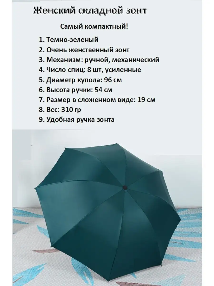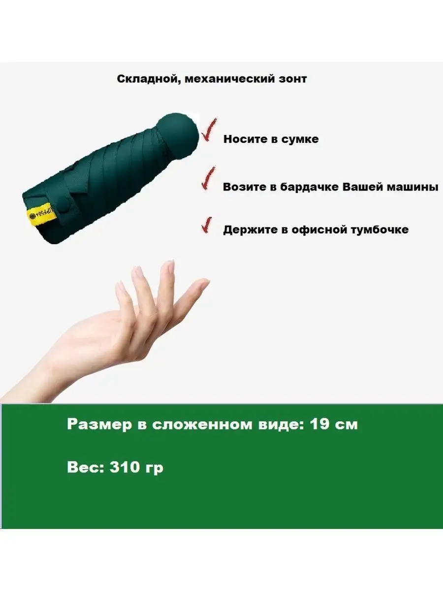 Описание: Классический мини зонт имеет надежный механический принцип открывания и закрывания зонта. Размер в сложенном виде 19 см, вес 310 гр, что позволяет положить зонт как в сумочку, так и в рюкзачок, бардачок Вашей или служебной машины или ящик офисной тумбочки. Зонт имеет 8 усиленных спиц с гибкими концами, что защищает его от сильных порывов ветра, так называемый принцип АНТИВЕТЕР / АНТИШТОРМ. Если все-таки произошел выгиб спиц наружу, при сильном порыве, достаточно просто резко встряхнуть зонт или руками опустить вывернутые спицы - и они вернуться на место. Зонт имеет купол размером 96 см, обтянутый полиэстером с водоотталкивающей пропиткой.Высококачественный водоотталкивающий материал, быстро сохнет, меньше мнется, прочный. Уникальные свойства материала делают зонт более долговечными. В купе с механическим открыванием зонта, он практически вечен). Этот зонт — это отличный подарок жене, мужу или ребенку на Новый Год, Рождество, День рождение, просто практичный подарок.