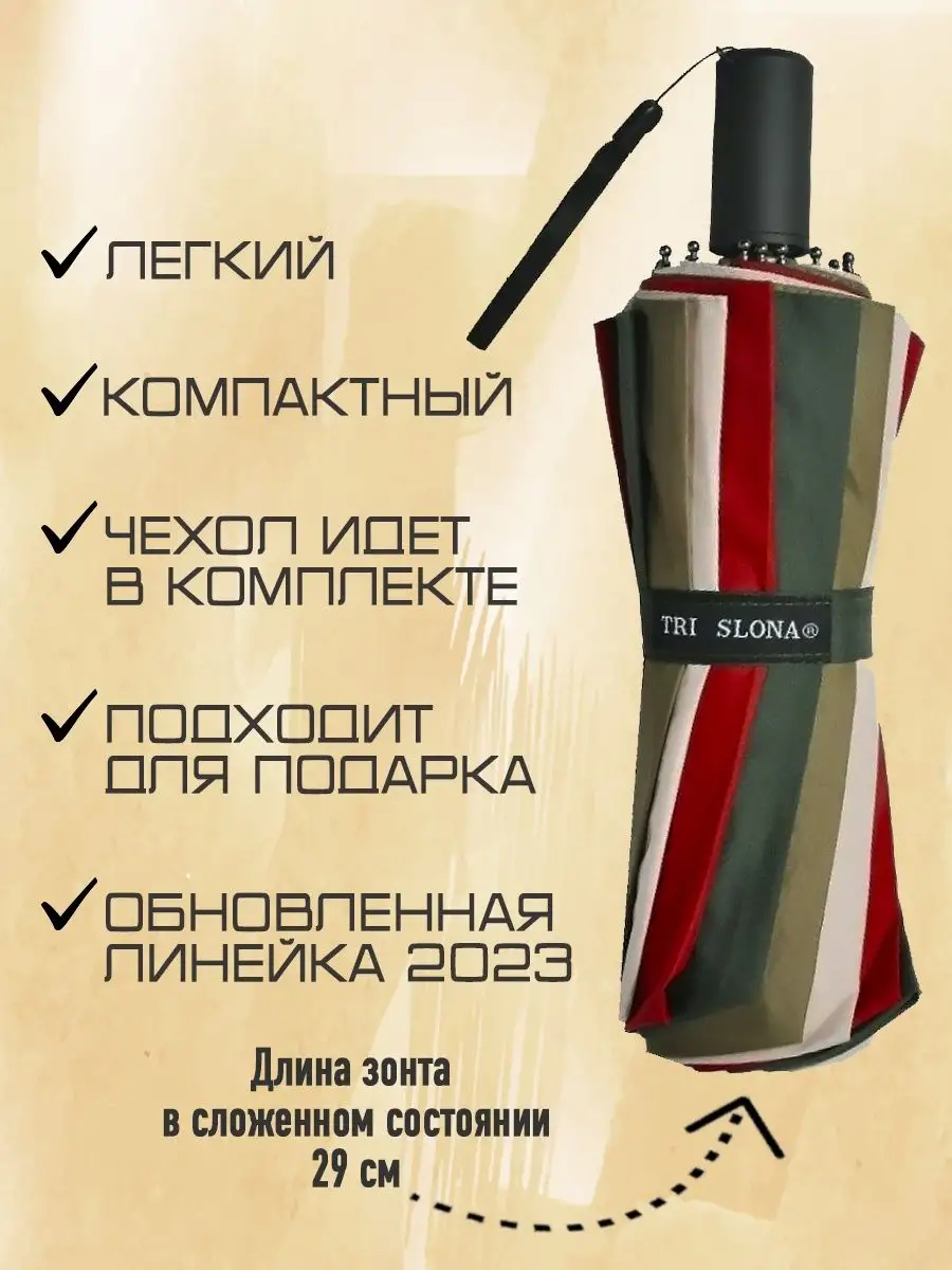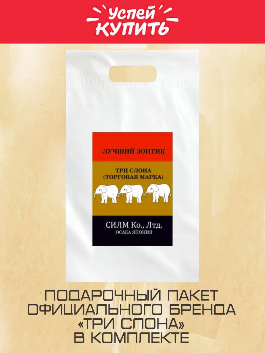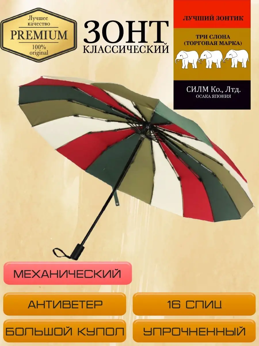 Описание: "Три слона” - один из крупнейших японских брендов зонтов, качество которых проверено столетиями. Мы являемся одними из немногих официальных поставщиков продукции 3 слона, продающих оригинал, а не копии для на наших любимых клиентов. Никогда не знаешь, когда пойдет дождь, но с нашими зонтами вы всегда будете готовы к любой погоде! У нас в ассортименте есть все виды зонтов: механические, полуавтоматические, автоматические и полный автомат, складные и трости, компактные и большие семейные. Для настоящих модниц и модников мы предлагаем женские и мужские зонты разных цветов и форм: от мини до трости, с антиветером и усиленными спицами, от классических черных до разноцветной трости с большим куполом. Данная модель механического зонта представлена в разноцветном варианте (красный, темно-зеленый, белый) с стильной ручкой из soft-touch покрытия. Также идет в комплекте чехол для удобного хранения. Зонт полный автомат подходит как для женщин и мужчин, так и для подростков девочек и мальчиков. Особенность заключается в том, что этот зонтик, включает в себя 16 спиц, прочный большой купол и систему антиветер. Такой зонтик будет служить вам долго и верно в любую непогоду не один сезон! Благодаря куполу из премиального эпонжа он быстро сохнет, не мнется, сохраняет идеальный вид, дополняя ваш образ. Зонт три слона - 100% тренд 2023 года, который будет не стыдно приобрести для себя или в подарок близким людям: на день рождения, без повода, для мамы и для папы, для брата или сестры, для друзей и даже для бабушек и дедушек. Выбрать наш зонт - значит приобрести не только защиту от дождя, но и стильный, качественный аксессуар, который подчеркнет ваш индивидуальный стиль. Приятных покупок!