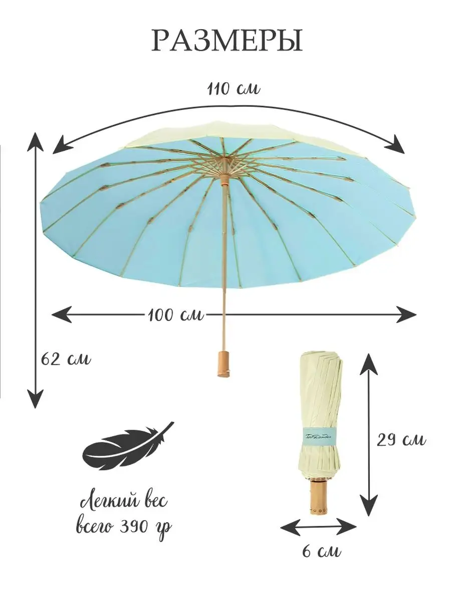 Описание: Женский зонтик для истинных леди, которые ценят стиль, красоту и практичность во всем, оставаясь элегантными даже в дождливую погоду. Эта коллекция зонтов специально создана, чтоб воссоздать образ элегантной барышни начала 20-го века. Для его изготовления применялись только натуральные материалы и современные технологии. Уникальная комбинация механического зонта и системы антишторм, современная прорезиненная сатиновая ткань купола и эргономичная деревянная ручка. При этом он очень легкий и прочный. Зонт женский МЕХАНИЧЕСКИЙ, складной, усиленный, со стальными спицами в подарочной коробке! Нежные пастельные оттенки. Зонтик открывается легким движением руки до щелчка и складывается обратно тоже вручную. Складной механизм имеет прочный каркас, 16 спиц и систему антишторм, благодаря чему прослужит очень долго, так как при сильном ветре или урагане он не сломается, а просто вывернется назад и потом вернётся в обычное состояние. Большой диаметр купола в 105 см делает его семейным. Укроет от дождя не только взрослую пару, но и ребенка. В сложенном виде компактный, всего 33 см в длину и 7 см диаметре. Легко помещается в женскую сумку или бардачок автомобиля. Непромокаемый чехол идет в комплекте. Чем отличается зонт автомат от механического зонта? Автоматические открываются и закрываются с одной кнопки, а механические открывается и складывается вручную. Преимущества механического зонта в том, что он меньше весит за счет отсутствия внутри металлического механизма и пружин, и снижается вероятность поломки зонта, т.е. Вы избежите случаев, когда зонт может заклинить или он не раскроется. Также, зонты-автоматы, как правило, более тугие, чем механические. Все наши зонты сразу упакованы в подарочные коробки, которые делают их готовым подарком к любому празднику. Отличный подарок для девушек и женщин, которые ценят стиль, красоту и практичность. Подарок на день рождения, 14 февраля, 8 марта и на другие значимые праздники! Произведено в России.
