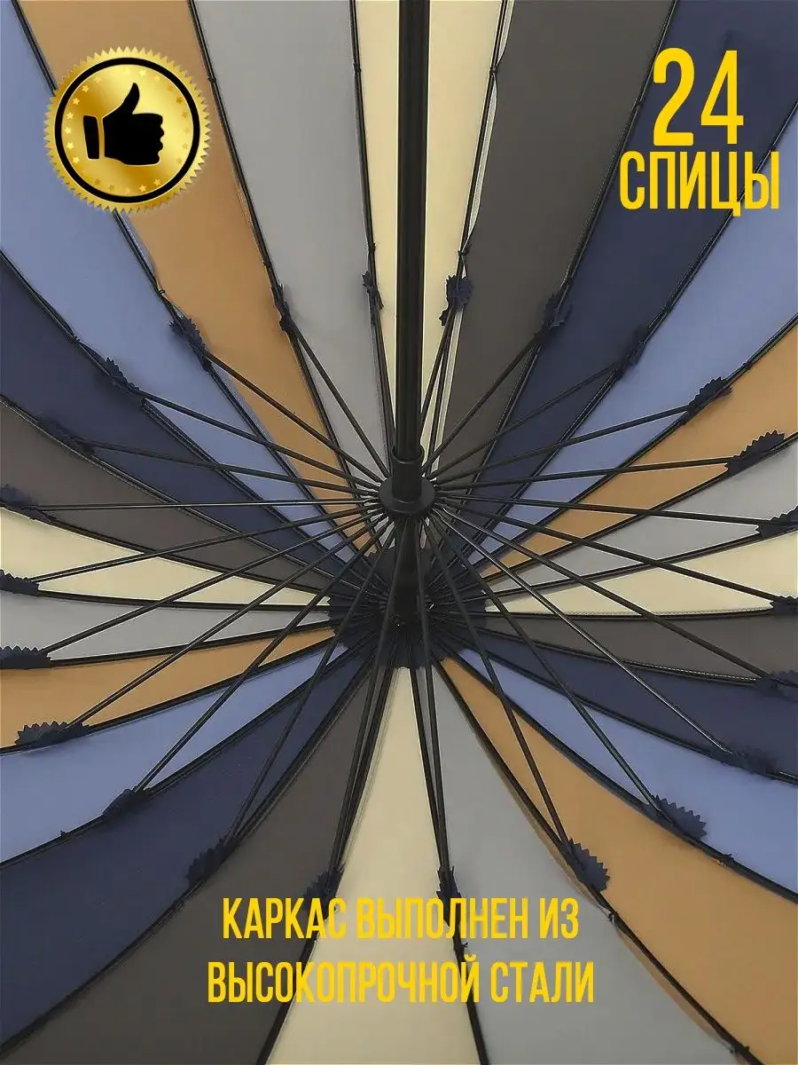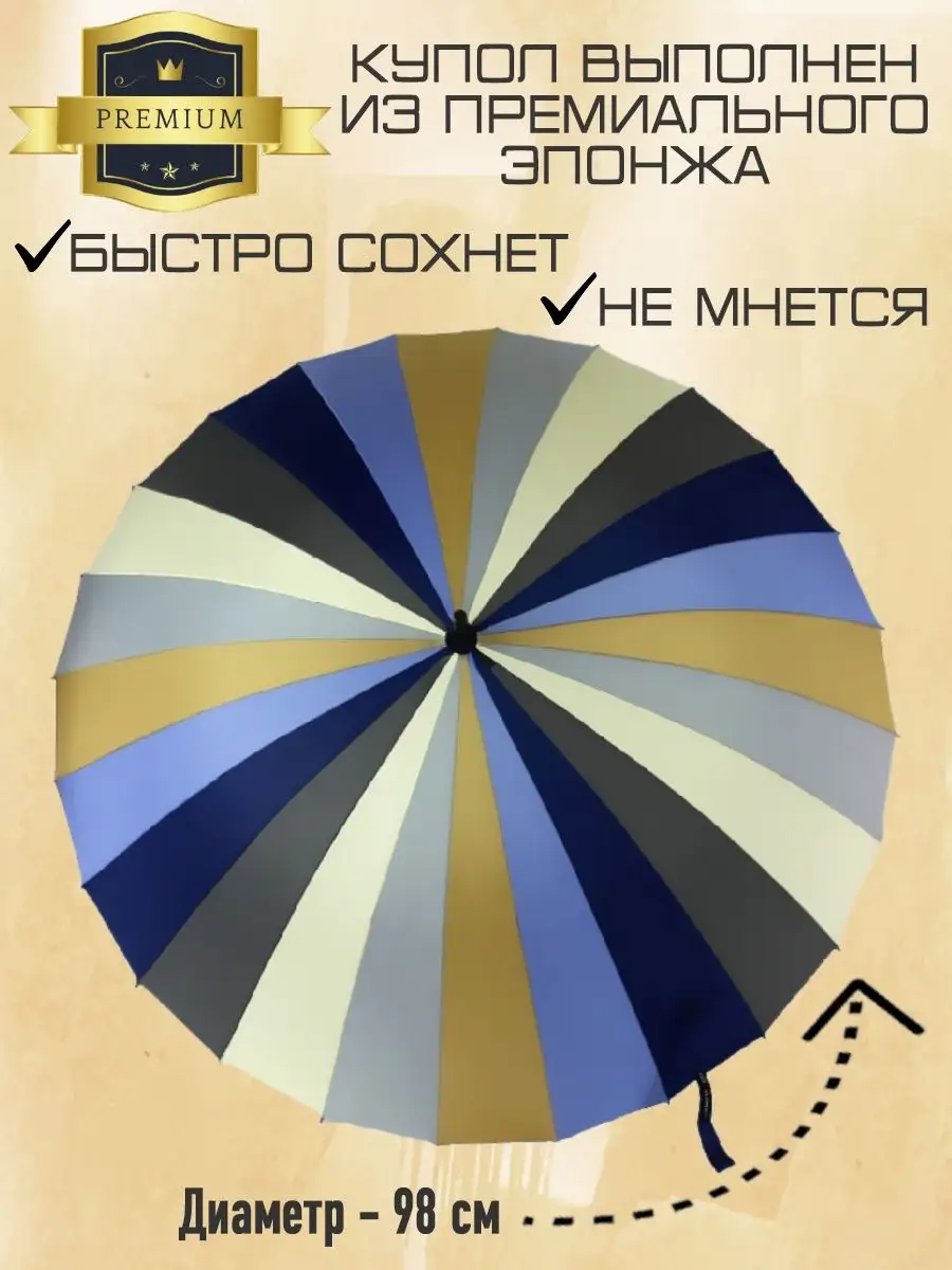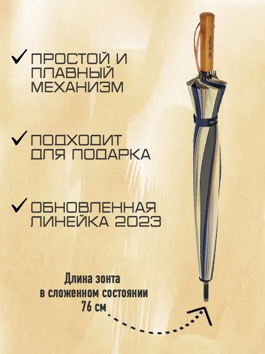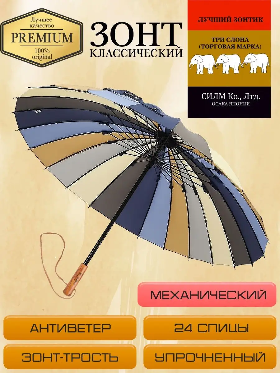 Описание: “Три слона” - один из крупнейших японских брендов зонтов, качество которых проверено столетиями. Мы являемся одними из немногих официальных поставщиков продукции 3 слона, продающих оригинал, а не копии для на наших любимых клиентов. Никогда не знаешь, когда пойдет дождь, но с нашими зонтами вы всегда будете готовы к любой погоде! У нас в ассортименте есть все виды зонтов: механические, полуавтоматические, автоматические и полный автомат, складные и трости, компактные и большие семейные. Для настоящих модниц и модников мы предлагаем женские и мужские зонты разных цветов и форм: от мини до трости, с антиветером и усиленными спицами, от классических черных до разноцветной трости с большим куполом. Данная модель зонт-трости представлена в разноцветном варианте (темно-синий, синий, золотистый, голубой, бежевый) с ручкой из натурального дерева. Также на ручке есть кожаный ремешок, который позволит его хранить удобно в любом месте. Зонт механический трость подходит как для женщин и мужчин, так и для подростков девочек и мальчиков. Особенность заключается в том, что этот зонтик, включает в себя 24 спицы и систему антиветер. С ним не страшно гулять всей семьей в пасмурную погоду! Такой зонт механический будет служить вам долго и верно в любую непогоду не один сезон! Благодаря куполу из премиального эпонжа он быстро сохнет, не мнется, сохраняет идеальный вид, дополняя ваш образ. Зонт три слона - 100% тренд 2023 года, который будет не стыдно приобрести для себя или в подарок близким людям: на день рождения, без повода, для мамы и для папы, для брата или сестры, для друзей и даже для бабушек и дедушек. Выбрать наш зонт - значит приобрести не только защиту от дождя, но и стильный, качественный аксессуар, который подчеркнет ваш индивидуальный стиль. Приятных покупок!