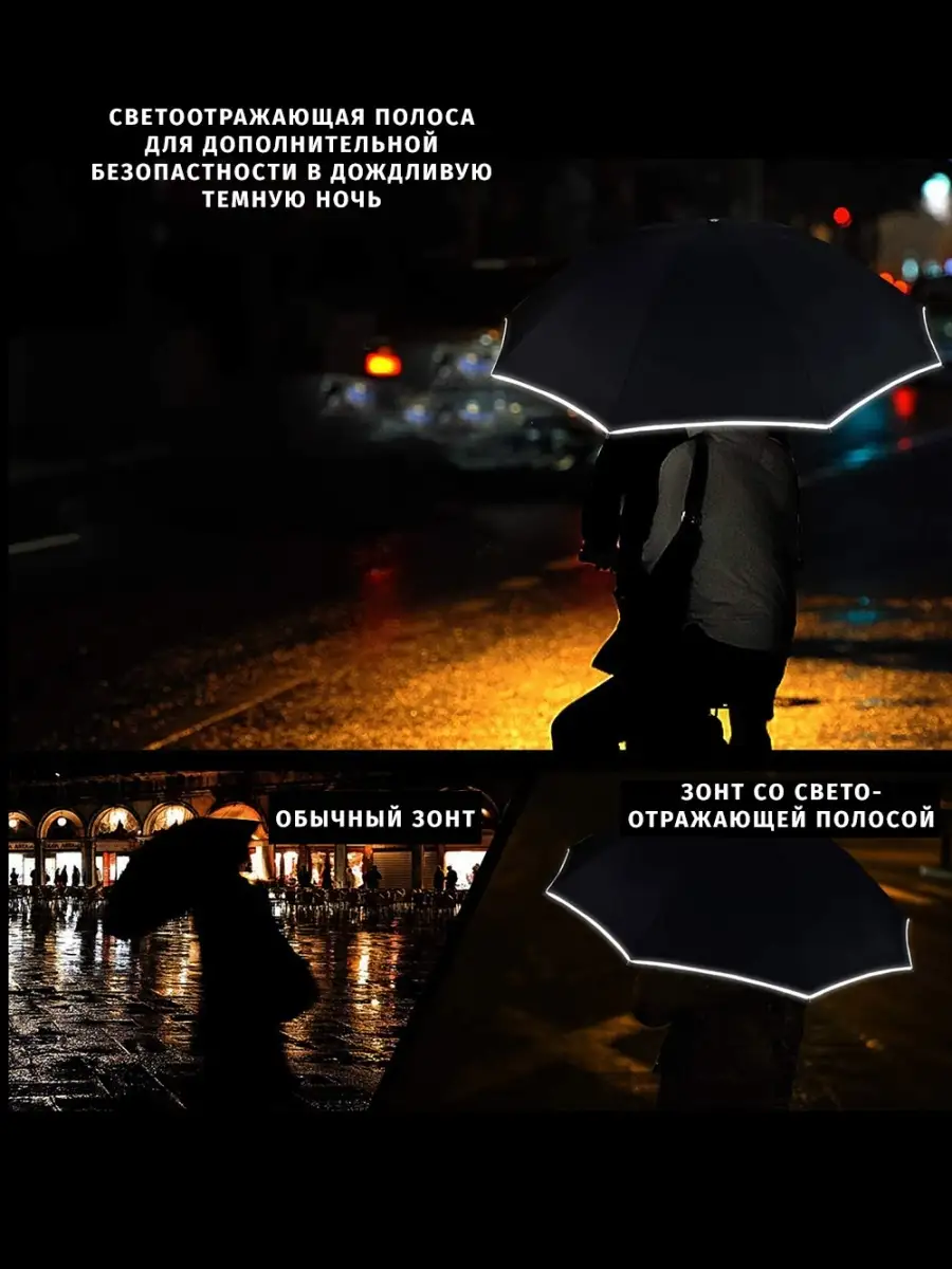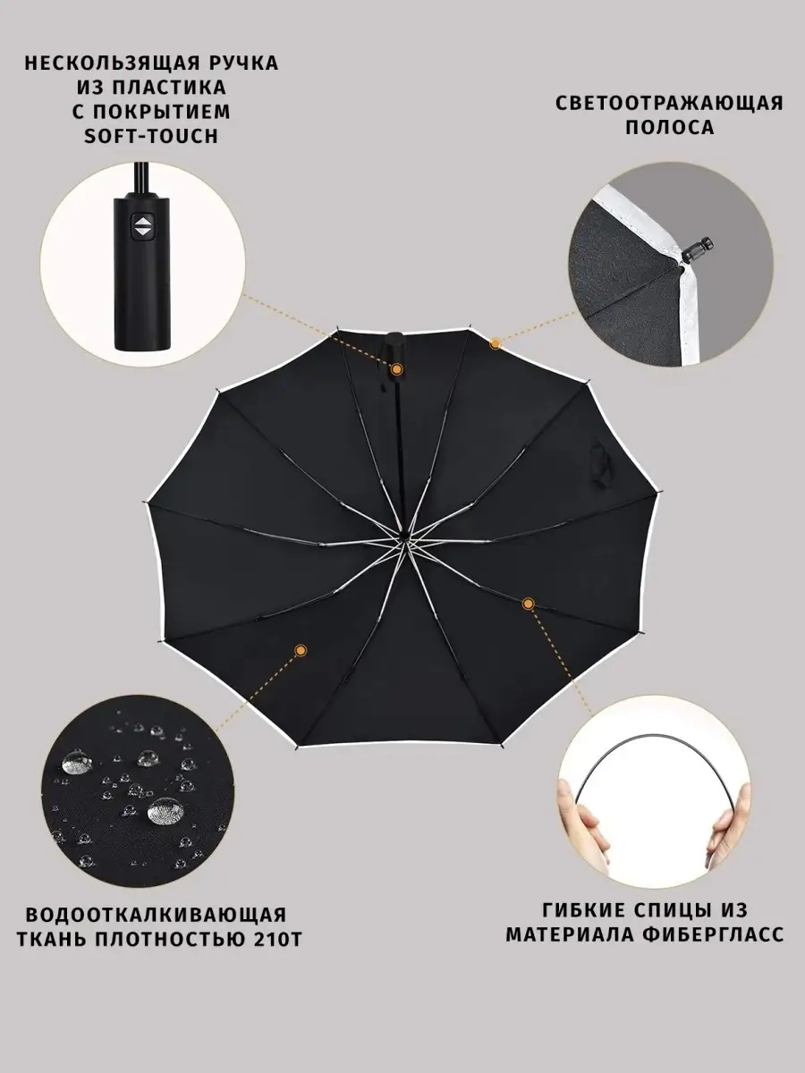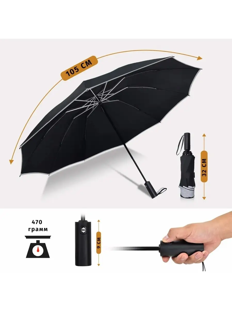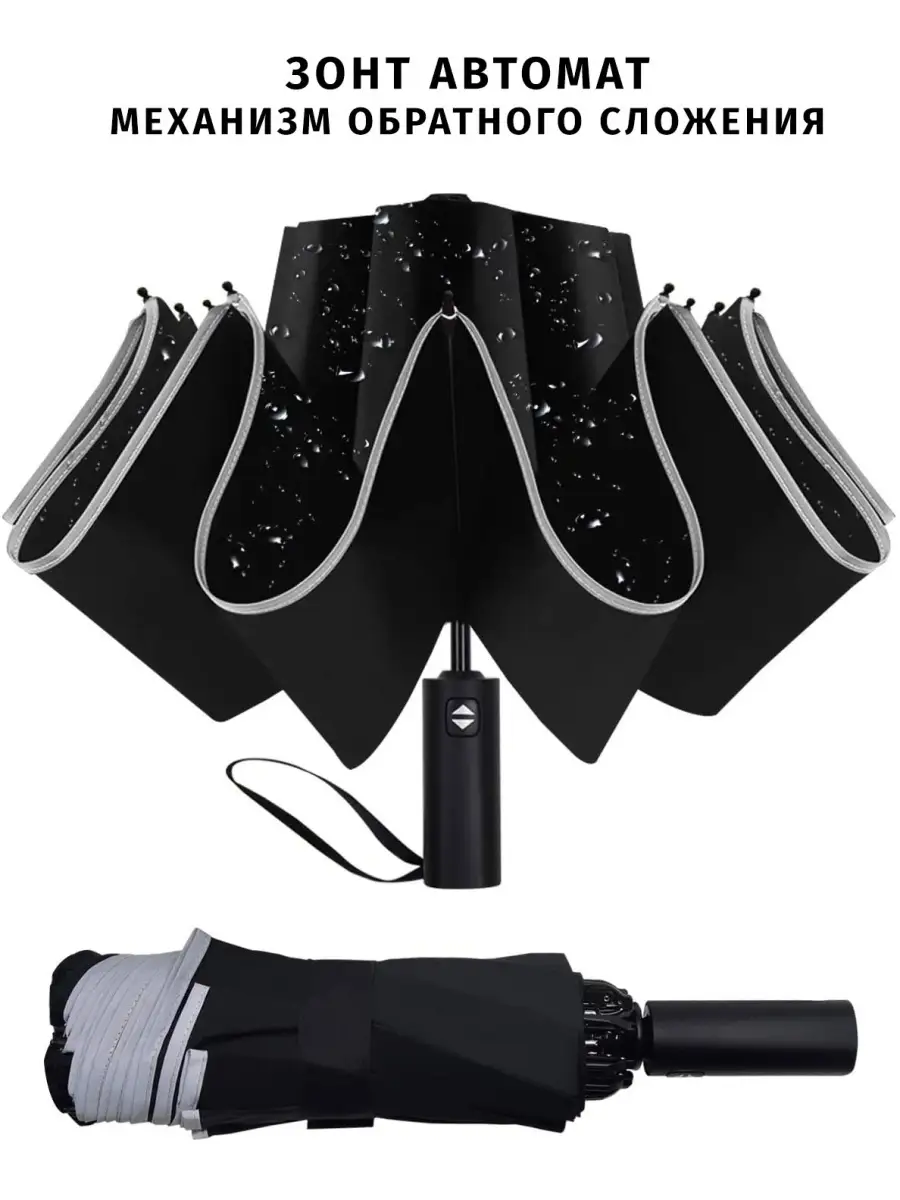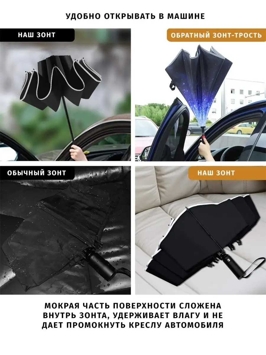 Описание: Необычный мужской зонт автомат уникален тем, что складывается в обратную сторону - зеркально стандартному механизму. Такой механизм обратного сложения имеет ряд преимуществ: капли дождя остаются внутри внешнего отделения в сложенном виде, что позволит сложить зонт и не намочить одежду, сидение или сумку, когда Вам необходимо зайти в помещение или сесть в автомобиль. Высушите автоматический зонт привычным способом в раскрытом виде. Зонт наоброт имеет светоотражающую окантовку, что сделает Вас заметными в темное время суток. Механизм зонта: полный автомат. Прочный зонт имеет стальной каркас с антикоррозийным покрытием и снабжен системой антиветер "Wind Proof". Зонтик унисекс - мужской и женский. Складывается в 3 сложения, длина в сложенном виде 34 см, диаметр купола большой 105 см, 10 спиц из фиберглас, вес 480 г. Складной зонт отличный подарок на день рождение, 23 февраля и другие праздники любимому мужчине, парню, подростку, папе и даже дедушке, а также подойдет и для женщины, девушки.