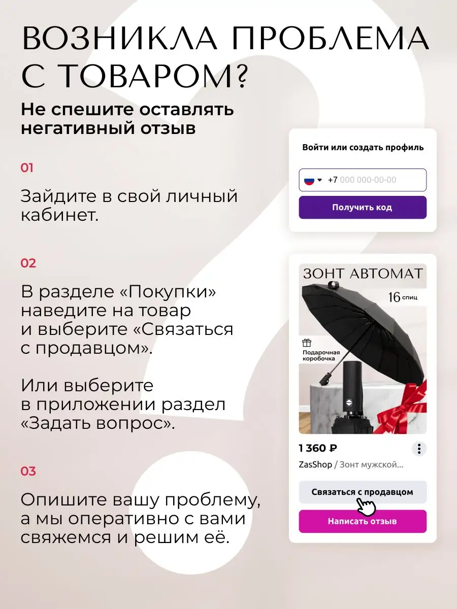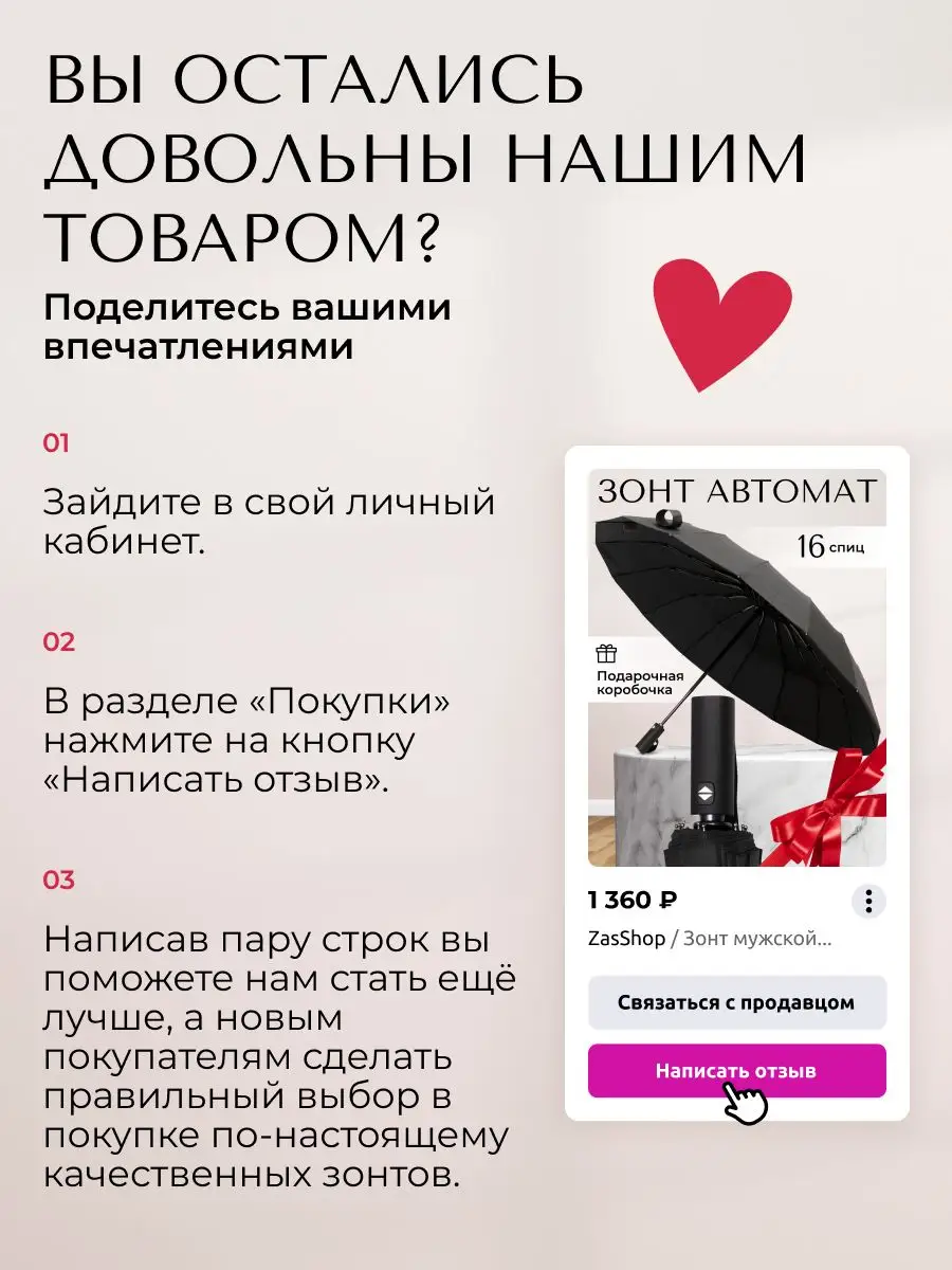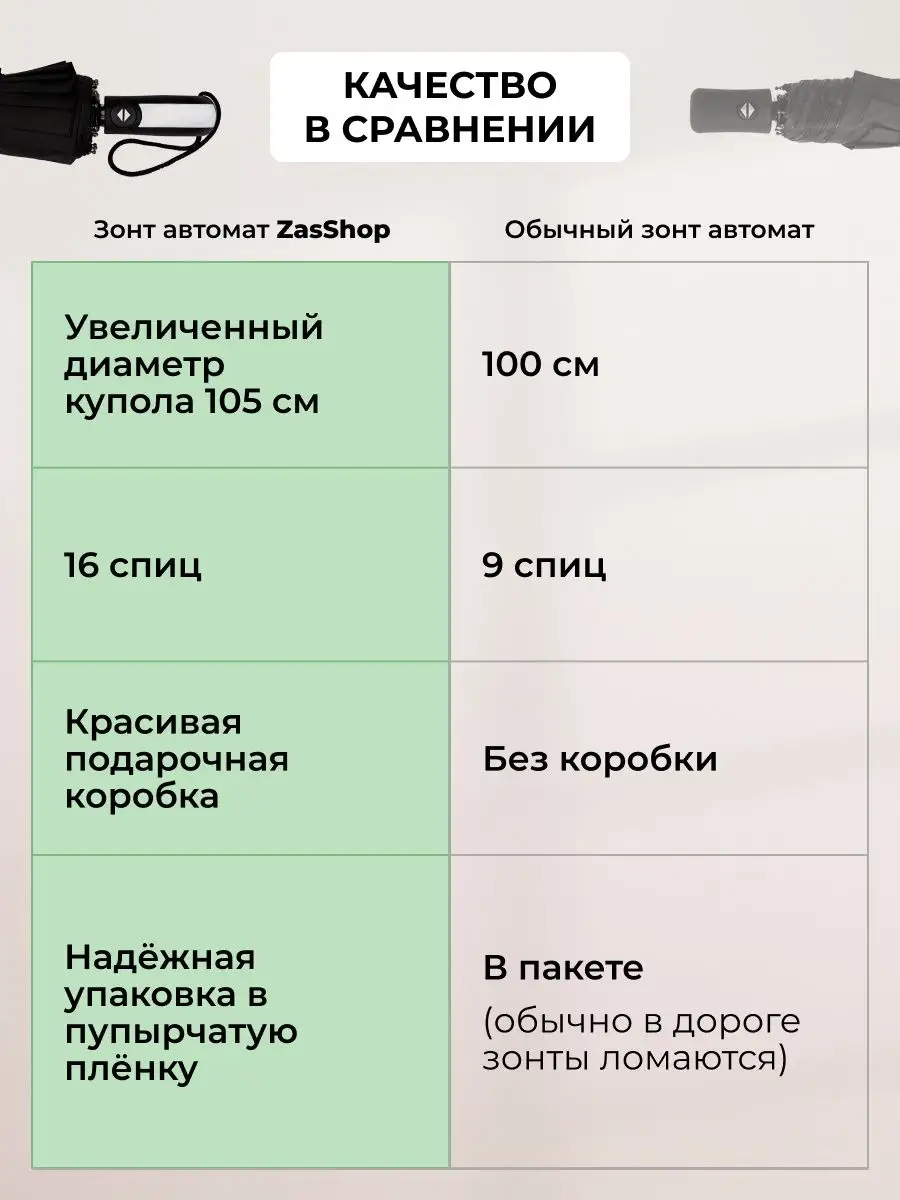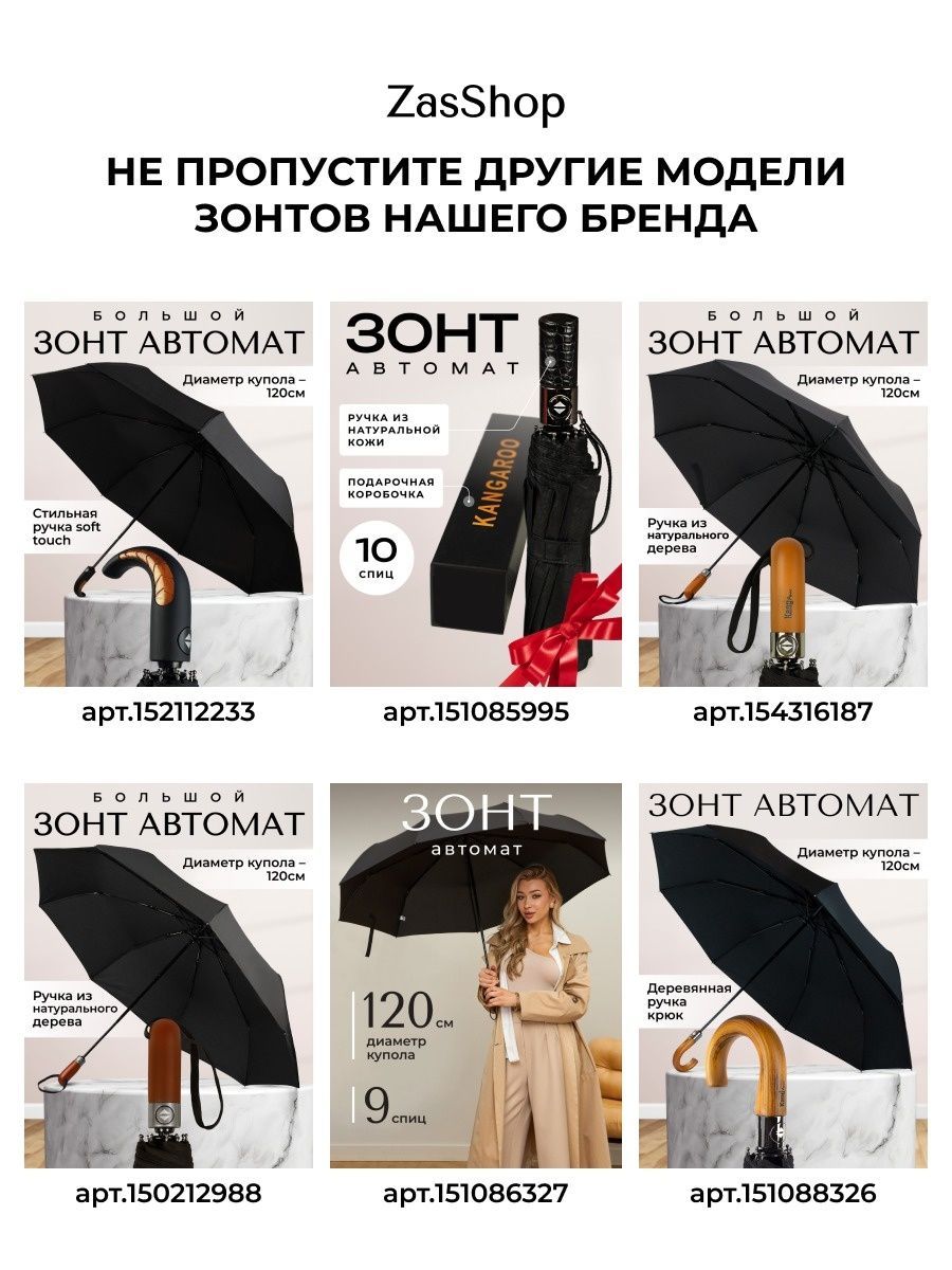 Описание: Представляем Вашему вниманию самый прочный складной зонт на Wildberries в подарочной коробке! Диаметр купола 105 см он чуть больше, чем куполы обычных зонтов, но состоит из 16 спиц , что обеспечивает максимальную прочность купола . В сложенном состоянии зонт компактный - как обычные классические мужские и женские зонты, только чуть потолще, его длина составляет всего 36 сантиметров. Зонт реверсивный , полный автомат. Купол выполнен из плотной качественной ткани насыщенного черного цвета. Благодаря своим размерам зонт защитит от любого косого дождя даже двоих , а система антиветер ( антишторм ), большое количество спиц , прочный стальной каркас с антикоррозийным покрытием не дадут зонту сломаться в случае сильных порывов ветра. Часто такие зонты называют семейный или президентский . Дополнительно в комплекте идет чехол черного цвета . Сам зонт идет в стильной коробке что делает его отличным подарком коллеге , любимому , мужчине , мужу , парню , брату , папе или любимой , женщине , подруге , девушке , жене , маме к любому празднику в том числе на день рождения и юбилей . Так же подойдет мальчику и для девочки. Весь наш товар проходит полную предпродажную проверку что гарантирует отличное качество покупаемого вами продукта. Ключевые слова: меч подростка чехлом три слона катана уличный мини zest подростковый frei regen япония японский зонт-трость трость bugatti полу полуавтомат в 3 4 сложения soft touch деревянной дерево прозрачный