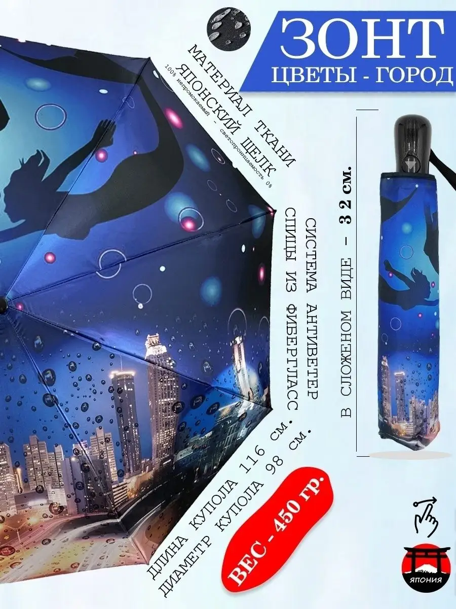 Описание: Зонт полуавтомат женский от ЯПОНСКОГО производителя Steki-Ame. Надежный зонтик и отличный аксессуар для любого категории пользователя. девушки подростков! Зонт имеет необычный и орегинальный принт-в первой половине: большие цветы орхидеи роза с бабочками разноцветные котята осенние листья с каплями дождя русалки-во второй: известные города столицы мира Нью йорк Лондон Красная площадь Москва ВДНХ Дубай! Ткань переливается на свету, Цвет купола не сильно вызывающий и не темный, цвет купола подойдет с любым луком одежды. В тоже время нанесенный принт рассчитан таким образом что можно назвать зонт однотонным цветом. С оригинальным принтом, зонт можно использовать солнечной или пасмурной погоде или на пляже защищая себя от прямых лучей солнца. Материал ткани купола Щелк (Сатин) легко отталкивает воду и грязь. Остается сухим и высыхает быстро без усилий. Нет необходимости ухаживать за тканью! Зон три сложения облегчённый что делает его особенным по сравнению с другими зонтами. Каркас зонтика из надежных материалов стали и гибкого фибергласса на спицах с системой антиветер что защищает от поломок и сильных ветер в дождливую погоду или в время мокрого снега (ДЕРАЖАТЬ КУПОЛ ПРОТИВ ВЕТРА для срабатывания системы антиветер). Открывается при нажаты на кнопку зонт полностью открывается и закрывается рукой складывать стержень зонта до ручки. (полуавтоматически зонт). Ручка зонта из прорезиного материала с покрытием soft touch (софт тач) приятен на ощупь не скользит по руке, прикреплен прочный шнурок. Ручка удобная эргономическая 7 см. имеет овальную форму что подходить для любой размер и тип руки. Общая характеристика зонтика: Зонт полуавтомат, 3 сложения. Диаметр купола 116 см., Длина купола: 98 см., Количество спиц 9 спиц, Длина в сложенном виде: 32 см. Стержень: сталь, Вес: 450 г.