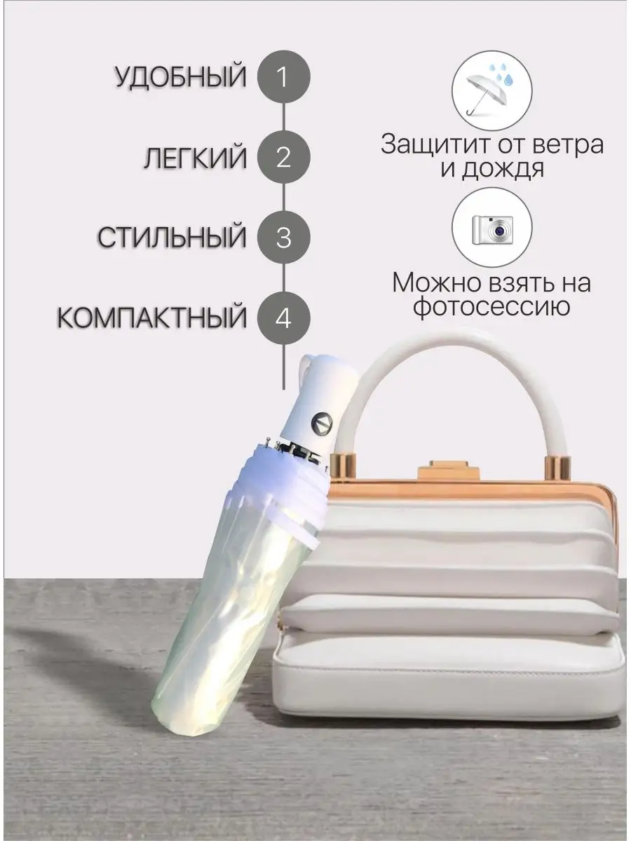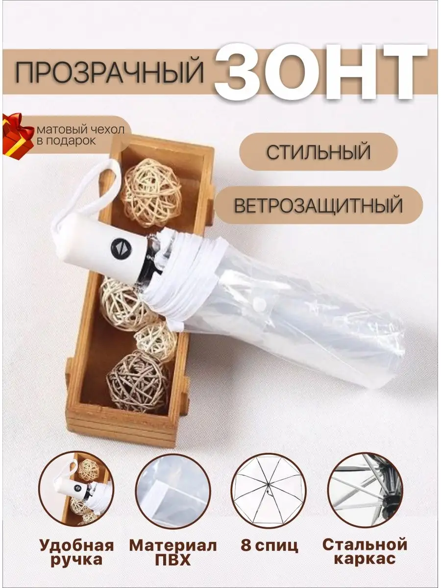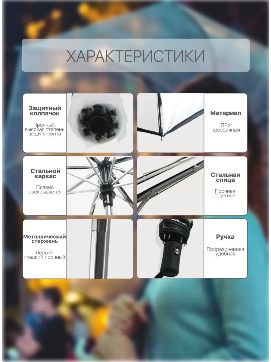 Описание: Прозрачный зонт представляет собой большой купол с ветрозащитной системой на спицах, так что порывистые ветра вам не страшны. Одно из преимуществ этого зонта - его автоматический механизм. Благодаря этому, вы сможете быстро и легко открыть и закрыть его одной кнопкой. Также он является складным, поэтому его можно легко хранить и переносить в чехле, который поставляется в качестве подарка. Этот зонт является идеальным вариантом для женщин, которые хотят выглядеть стильно и необычно. Кроме того, его прозрачный купол позволяет наслаждаться панорамным видом в любую погоду и сохранить обзорность во время дождя. Вы не будете испытывать дискомфорта при передвижении и сможете наслаждаться красивым видом. Рассмотрев все достоинства складного зонта, необходимо отметить его универсальность. Он подойдет как для повседневного использования, так и для особых случаев, таких как свадьбы, юбилеи и другие торжества. Его можно использовать в качестве реквизита во время фотоссесий. Прекрасный дизайн будет идеально сочетаться с любой одеждой и придаст образу неповторимый шарм. Кроме того, зонт имеет стальную конструкцию, благодаря которой он прослужит вам долгое время. Таким образом, прозрачный автоматический зонт - это не только стильный аксессуар, но и функциональный предмет, который защитит вас от непогоды и придаст вашему стилю изюминку. Не упустите возможность приобрести этот зонт и наслаждаться его красивым дизайном и функциональностью в любую погоду! Материал купола имеет свойство слипаться при длительном хранении. Поэтому необходимо правильно хранить зонт и складывать. Нажимать на кнопку для раскрытия необходимо с усилием. После использования зонтика, когда вы закрыли купол, необходимо так же с усилием сложить телескопический стержень до щелчка в районе ручки.
