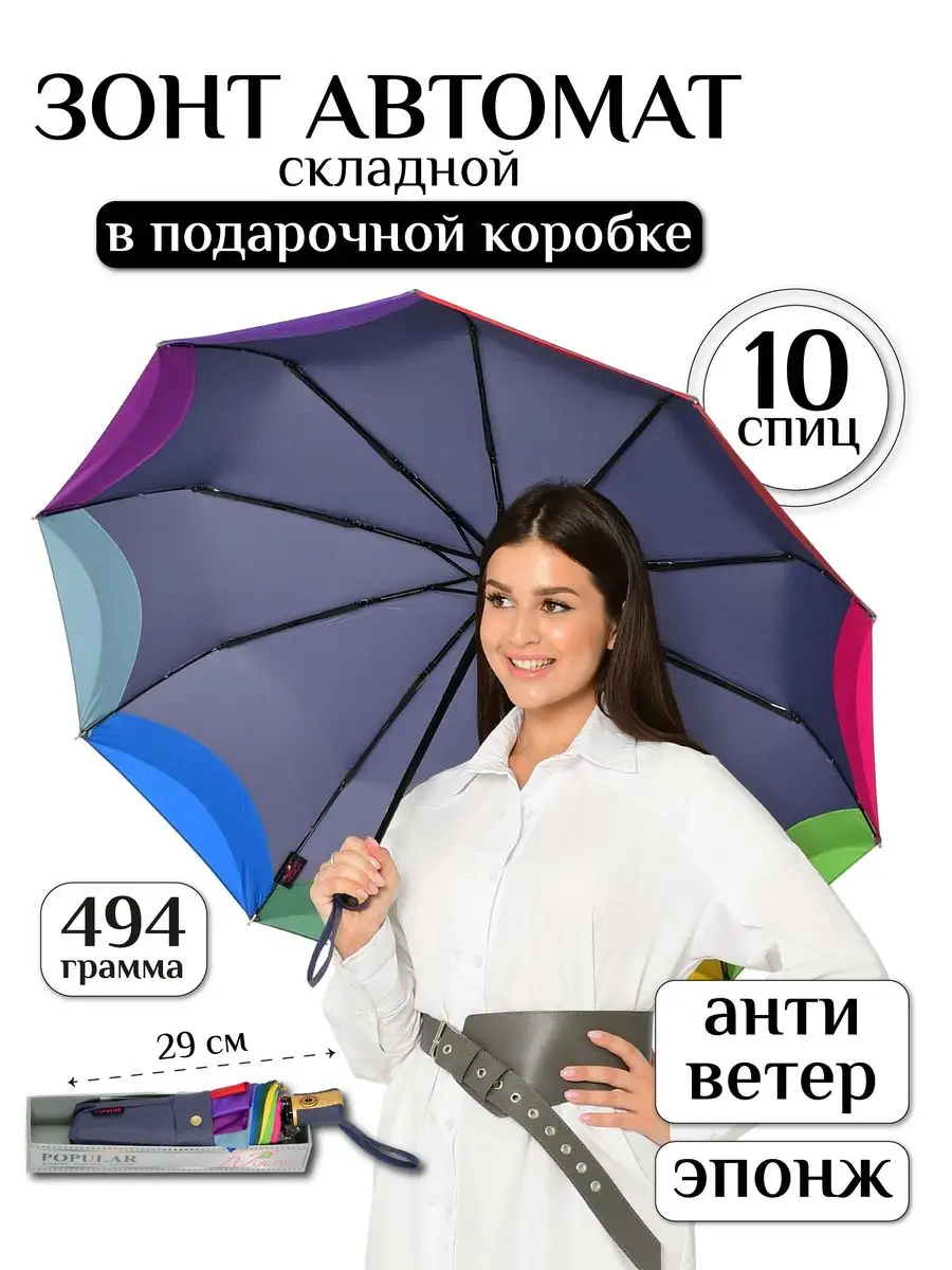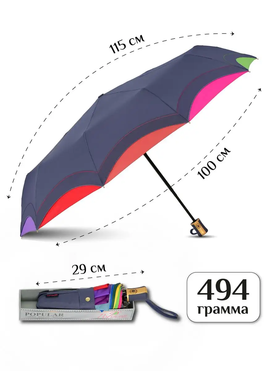 Описание: Женский зонт автомат Popular Umbrella - это стильный и функциональный аксессуар, который защитит вас от дождя и ветра в любую погоду. Он имеет лаконичный цвет, прочный каркас из стали и 10 спиц из нержавеющей стали, что обеспечивает долговечность и надежность. Зонт складной женский оснащен системой "антиветер", которая предотвращает поломку спиц при сильном ветре, и надёжным автоматическим механизмом, который удобен при раскрытии и закрытии нажатием на кнопку. Также в комплекте идет чехол, в который можно поместить мокрый зонт и положить его в сумку, не боясь намочить ее содержимое. Купол зонта имеет диаметр 100 см и внешний диаметр 115 см, что позволяет укрыться от дождя даже в плохую погоду. Материал купола - полиэстер и эпонж, которые обладают высокой прочностью и водоотталкивающими свойствами. Ручка зонта прямая и удобная, она выполнена из пластика и имеет оптимальный размер - всего 5,5 см. Это позволяет комфортно держать зонт в руке и использовать его в течение длительного времени. Зонт легкий и компактный - его длина в сложенном виде всего 29 см. Его удобно брать с собой в сумку или рюкзак. Преимущества этого женского зонта автомата очевидны: он красив, функционален и надежен. Вы можете быть уверены, что он защитит вас от непогоды и сохранит ваш образ стильным и элегантным. Этот маленький компактный аксессуар прекрасно подойдет для девушек, женщин, девочек, школьников и студентов, он будет идеальным подарком женщине, мужчине, девушке на 8 марта, день рождения, Новый год., Рождество, День учителя. Приобретая эту модель, вы получаете качественный и красивый продукт по доступной цене.