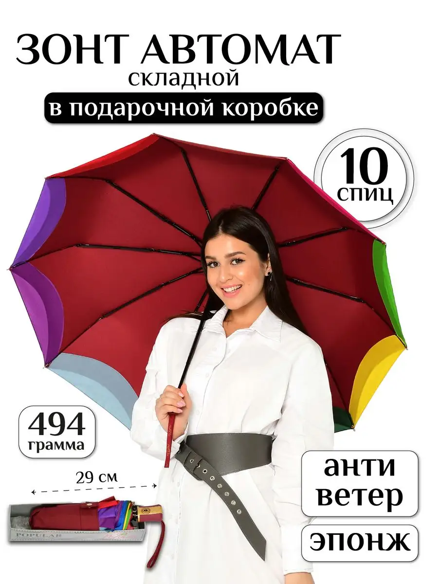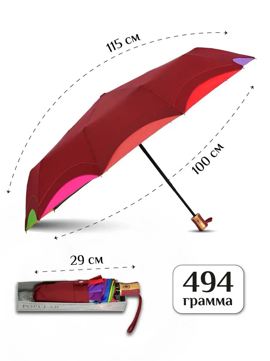 Описание: Женский зонт автомат Popular Umbrella - это стильный и функциональный аксессуар, который защитит вас от дождя и ветра в любую погоду. Он имеет лаконичный цвет, прочный каркас из стали и 10 спиц из нержавеющей стали, что обеспечивает долговечность и надежность. Зонт складной женский оснащен системой "антиветер", которая предотвращает поломку спиц при сильном ветре, и надёжным автоматическим механизмом, который удобен при раскрытии и закрытии нажатием на кнопку. Также в комплекте идет чехол, в который можно поместить мокрый зонт и положить его в сумку, не боясь намочить ее содержимое. Купол зонта имеет диаметр 100 см и внешний диаметр 115 см, что позволяет укрыться от дождя даже в плохую погоду. Материал купола - полиэстер и эпонж, которые обладают высокой прочностью и водоотталкивающими свойствами. Ручка зонта прямая и удобная, она выполнена из пластика и имеет оптимальный размер - всего 5,5 см. Это позволяет комфортно держать зонт в руке и использовать его в течение длительного времени. Зонт легкий и компактный - его длина в сложенном виде всего 29 см. Его удобно брать с собой в сумку или рюкзак. Преимущества этого женского зонта автомата очевидны: он красив, функционален и надежен. Вы можете быть уверены, что он защитит вас от непогоды и сохранит ваш образ стильным и элегантным. Этот маленький компактный аксессуар прекрасно подойдет для девушек, женщин, девочек, школьников и студентов, он будет идеальным подарком женщине, мужчине, девушке на 8 марта, день рождения, Новый год., Рождество, День учителя. Приобретая эту модель, вы получаете качественный и красивый продукт по доступной цене.