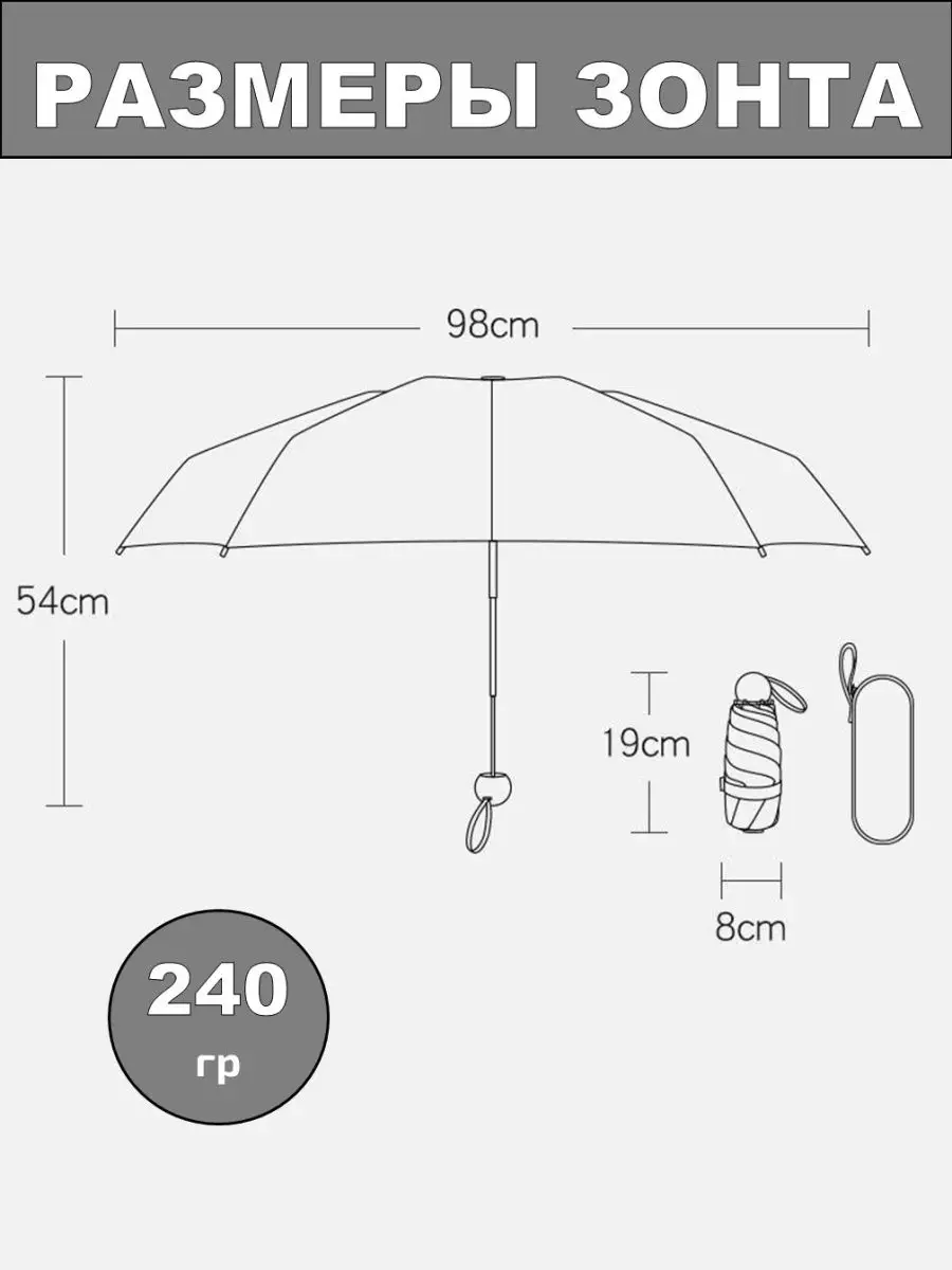 Описание: Вам ни разу не приходилось промокнуть под непрекращающимся дождем, когда вы устало шли по улицам, надеясь найти укрытие или терпеливо ждали сухую погоду? Здесь и сейчас мы представляем вам решение - уникальный женский зонт, который станет вашим надежным и стильным спутником, обеспечивая вам непревзойденный комфорт и защиту от непогоды. Мини автоматический зонтик - это именно то, что вы искали. Восхитительный мужской зонтик, который практичен и удобен для использования, идеально подойдет для детей и взрослых. Его компактные размеры и легкий вес позволят вам всегда иметь его под рукой в любой ситуации. Каким бы ветреным или солнечным ни был день, этот зонт гарантирует надежное покрытие от ультрафиолетовых лучей и влажности. Стильный зонт из трендовой коллекции подчеркнет вашу индивидуальность среди серой рутины. Его антиветер, лаконичный дизайн и полуавтоматичность делают его идеальным выбором для стильных и трендовых леди. Разнообразие цветовых комбинаций и узоров позволяет выбрать модель, которая идеально подойдет вашему гардеробу. Складной пляжный зонт - это просто находка для любителей пляжного отдыха. Он легко помещается в специальный чехол, который обеспечивает защиту от песка и воды. Белый или черный цвет зонта создаст атмосферу лета и спокойствия у вас на пляже. Этот автоматический пластиковый карманный зонт идеально подойдет для малышей и подростков. Его легкий вес и прочные спицы гарантируют комфорт и безопасность. Небольшой и прочный зонт охраняет от солнца и дождя, давая возможность наслаждаться уличным прогулками в любой погоде. Если вы ищете надежное решение в комфорте и стиле, выбирайте нашу продукцию. Мы предлагаем широкий выбор женских и детских зонтов, подходящих для всех возрастных групп и сезонов. У нас есть зонты для мальчиков и девочек, зонты подростковые и компактные зонты для людей в поисках удобства. Пора перестать рисковать своим здоровьем и комфортом. Купите себе надежный и стильный зонт уже сегодня и наслаждайтесь моментами, не беспокоясь о погоде!