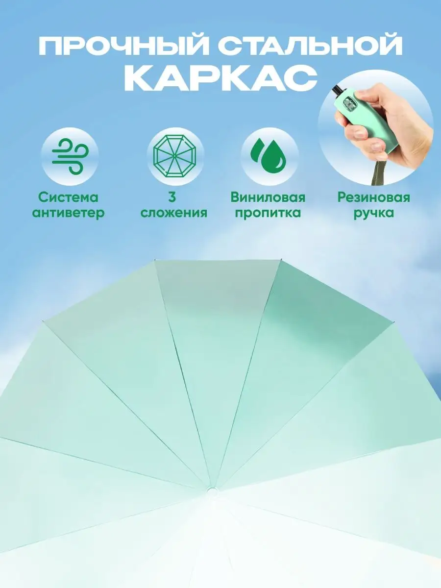 Описание: Удобный и функциональный зонт автомат антиветер это стильный аксессуар для женщин. Зонт 12 спиц женский обеспечивает надежную защиту от ветра, дождя и солнца. Универсальный зонтик однотонный складной выполнен из двухслойной плотной ткани с водоотталкивающей виниловой пропиткой, внутренняя часть которой всегда остается сухой при его складывании. Непродуваемый материал обладает влагонепроницаемостью и повышенной износостойкостью, а также имеет защиту от УФ UPF40. Механизм большого зонта - полный автомат, 3 сложения. Он очень прост и удобен в использовании. Изделие, маленькое в собранном виде и большое после раскрытия, имеет усиленный механизм, благодаря которому купол сохраняет свое положение во время сильного дождя и ветра. Удобная резиновая ручка комфортно лежит в руке. В сложенном виде зонт компактный автоматический не займет много места в вашей сумке. Надежный зонтик женский с большим куполом прослужит вам долгие годы благодаря своей прочности и устойчивости. Важно знать - открывать и закрывать купол аксессуара нужно нажатием на кнопку. Ручное открывание и закрывание приводит к поломке механизма: торможение при открывании, не полное закрытие или раскрытие. В комплекте идет чехол. Наш товар станет отличным подарком для женщины на любой праздник.