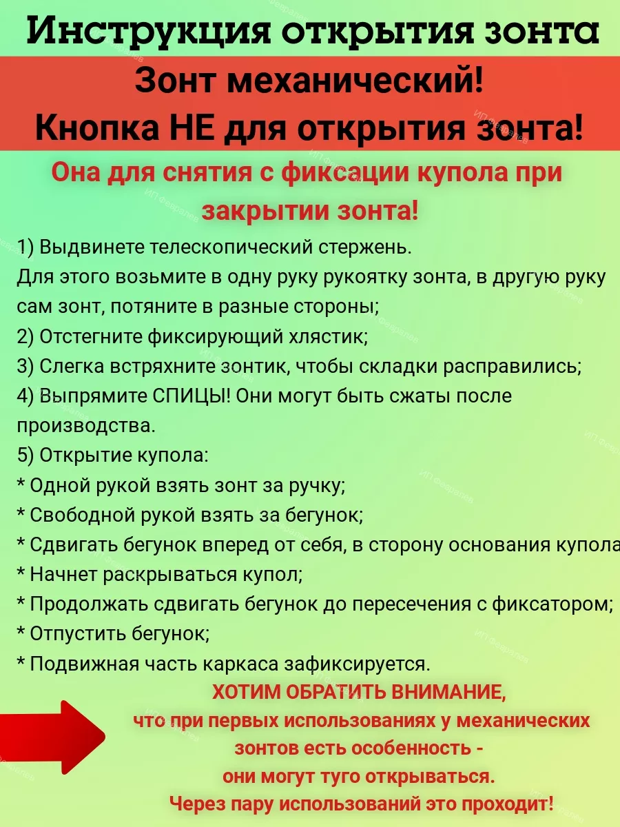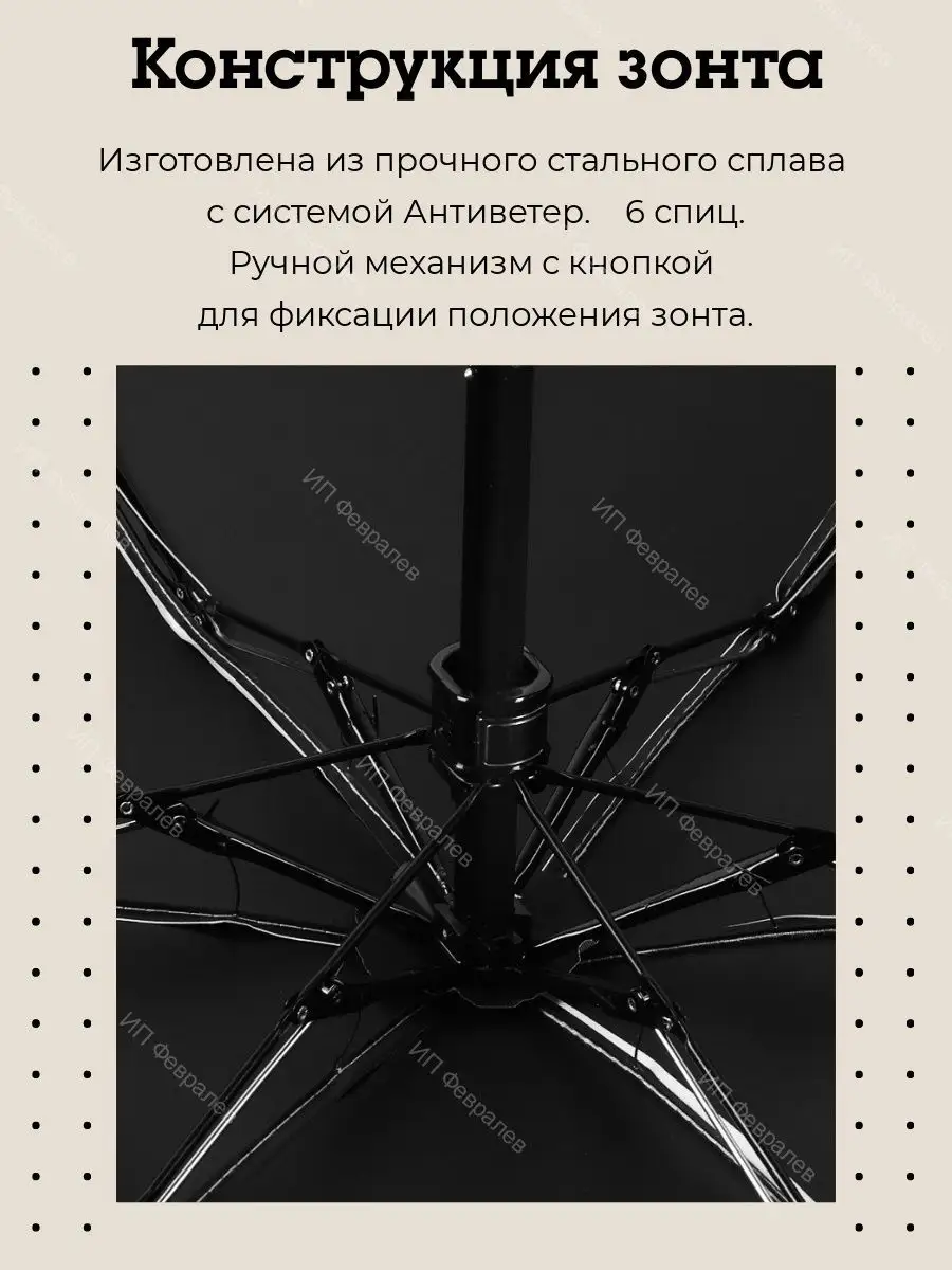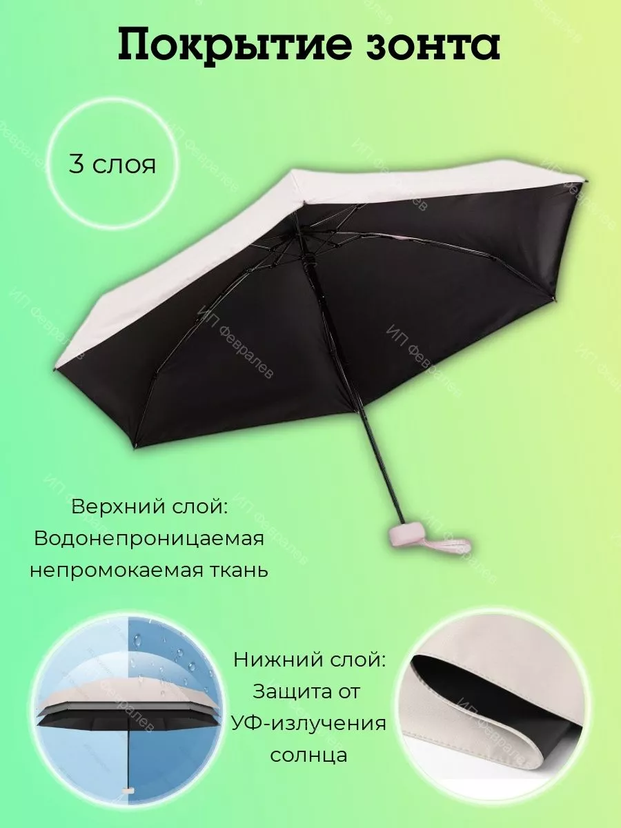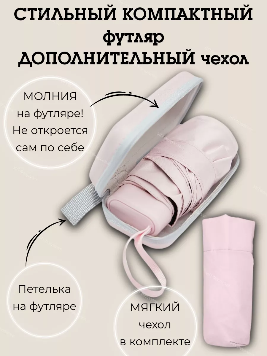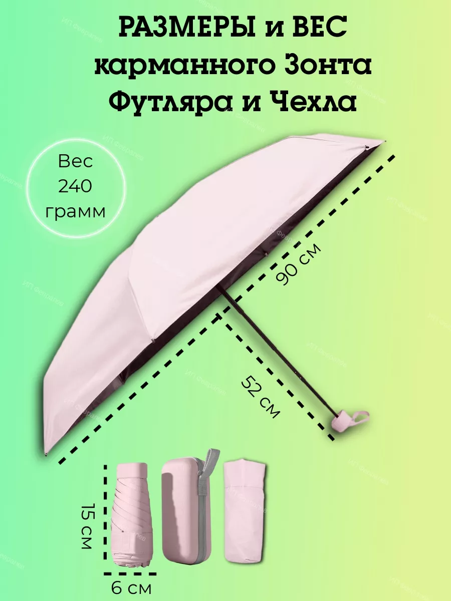 Описание: МЕХАНИЧЕСКИЙ зонт. Кнопка НЕ для открытия зонта, а для закрытия (снятия с фиксации купола)! В нашем магазине вы найдете все, что нужно для комфортной защиты от погодных условий. Мы предлагаем выбор зонтов разных цветов, чтобы каждый мог выбрать то, что подходит именно ему. Наш ассортимент включает зонтики молочного, черного, бежевого, розового и зеленого цветов для повседневного использования. Легкий компактный женский зонт с чехлом, он не займет много места в сумке, рюкзаке или в бардачке автомобиля, но выручит в нужный момент. За счет своей легкости, он не утяжеляет сумку. Его вес составляет всего 240 грамм, что сравнимо с привычными для нас гаджетами – телефонами. Размер в сложенном виде: в длину 15 см, в ширину 6 см; в разложенном виде: диаметр купола 90 см, высота от рукоятки до купола 52 см; размер футляра 16 см на 7 см. Складной, карманный зонт в футляре защитит вас от солнца и дождя. Механический мини зонт с чехлом оснащен системой Антиветер, надежен и практичен. Все наши зонты высокого качества и прочности, что гарантирует их долговечность и надежность в любых погодных условиях. Каркас состоит из 6 спиц. Механизм складывания ручной, механический. Кнопка на каркасе фиксирует его в раскрытом положении. Он настолько маленький в защитном футляре, что не займет много места в ваших поездках. Купол состоит из трех слоев плотного материала. Внутренний слой mini зонта имеет специальное покрытие, которое блокирует вредные ультрафиолетовые лучи. Это помогает защитить вашу кожу и глаза от негативного воздействия солнца. Верхний слой водоотталкивающий и непромокаемый, благодаря чему очень быстро сохнет после дождя. Компактный зонт идет в комплекте с футляром. Футляр плотный и твердый, благодаря чему не потеряет форму. На футляре расположена молния, предотвращающая случайное открытие футляра. С помощью непромокаемого футляра ваша сумка всегда останется сухой после дождя! Вам не придется нести мокрый зонт в руках, можно со спокойной душой положить его в футляр и убрать в сумку. Вы можете спокойно сесть в автомобиль, не беспокоясь о том, что он намочит сидение в салоне. Футляр не только защитит от пыли и грязи, но и станет стильным аксессуаром, подчеркивающим вашу индивидуальность. Это универсальная модель, которую можно дать ребенку в школу или взять на прогулку. Она имеет простой дизайн, который понравится как мальчикам, так и девочкам. Наш зонтик имеет унисекс дизайн, что делает его подходящим для любого пола. Эта модель подходит к спортивному стилю, что подойдет для активных людей. Однако, она также может использоваться для делового образа, благодаря своей элегантности и простоте. Наш зонтик подходит под любой стиль и ситуацию. Наш зонт - это не только стильный и удобный аксессуар, но и функциональный. Он оснащен петелькой на чехле, что позволяет удобно крепить его к рюкзаку или сумке. Кроме того, на ручке также есть петелька, которая помогает удерживать его в руке, не скользящим и не утомляя руку. Эти мелкие детали делают использование еще более комфортным и удобным. Миниатюрные складные зонтики не оставят никого равнодушным. Покупайте зонты в нашем магазине и наслаждайтесь комфортом и защитой в любую погоду! Купите наш зонт в качестве подарка для близкого человека, который ценит комфорт и защиту от погоды. Это универсальный подарок, к