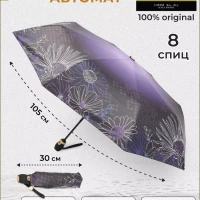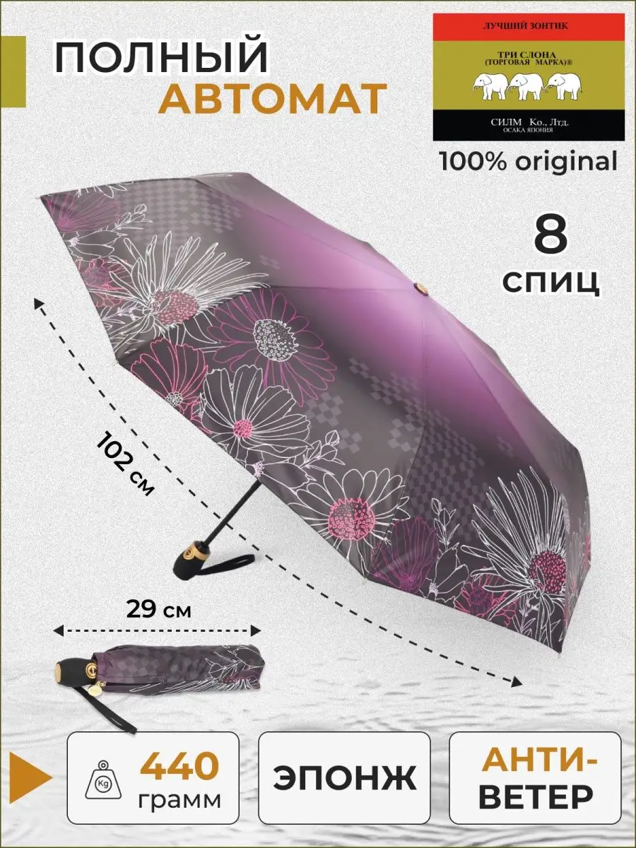 Описание: Привлекательная модель зонтов от бренда Три Слона подойдет для защиты от дождя и станет отличным подарком для девушки, любимой, жены, мамы, учителя, бабушки, тещи, свекрови, сестры, дочки, внучки, коллеги, подруги. Характеристики: полный автомат, 8 спиц, вес 440 гр, 3 сложения, длина в сложенном виде 30 см, фактический диаметр купола 102 см, материал купола Эпонж, материал ручки пластик (soft-touch), материал каркаса и спиц сталь, алюминий, фибергласс. На зонты бренда Три Слона действует гарантия 6 месяцев. Во все наши зонты встроена система антиветер. В комплекте зонт и чехол. Три Слона-это знаменитый во всем мире и постсоветском пространстве бренд зонтов, качество которых проверено годами. Наша продукция 100% оригинальная, имеет все фирменные бирки, заводские выштамповки и голографические наклейки, которые подтверждают безупречное качество.