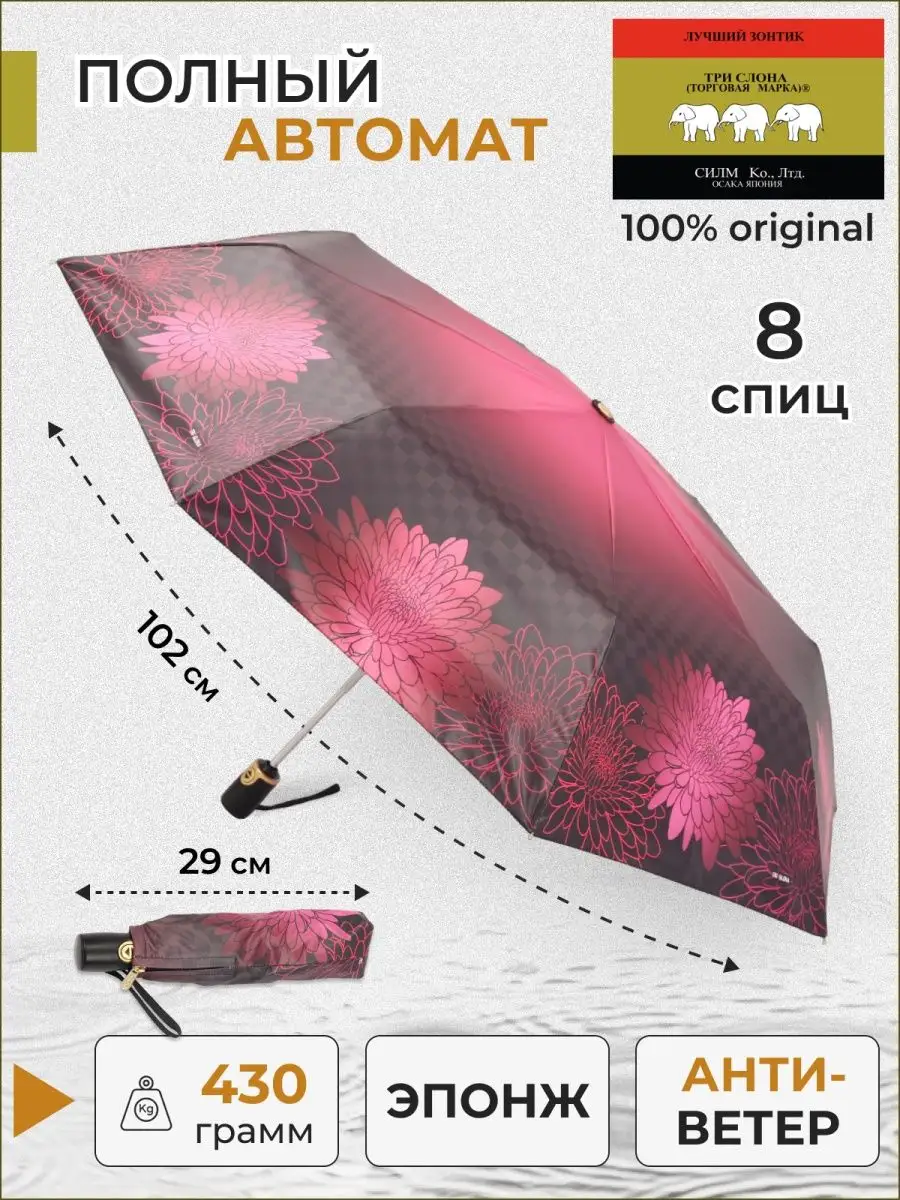 Описание: Привлекательная модель зонтов от бренда Три Слона подойдет для защиты от дождя и станет отличным подарком для девушки, любимой, жены, мамы, учителя, бабушки, тещи, свекрови, сестры, дочки, внучки, коллеги, подруги. Характеристики: полный автомат, 8 спиц, вес 430 гр, 3 сложения, длина в сложенном виде 29 см, фактический диаметр купола 102 см, материал купола Полиэстер, материал ручки эко кожа, материал каркаса и спиц сталь, алюминий, фибергласс. На зонты бренда Три Слона действует гарантия 6 месяцев. Во все наши зонты встроена система антиветер. В комплекте зонт и чехол. Три Слона-это знаменитый во всем мире и постсоветском пространстве бренд зонтов, качество которых проверено годами. Наша продукция 100% оригинальная, имеет все фирменные бирки, заводские выштамповки и голографические наклейки, которые подтверждают безупречное качество.