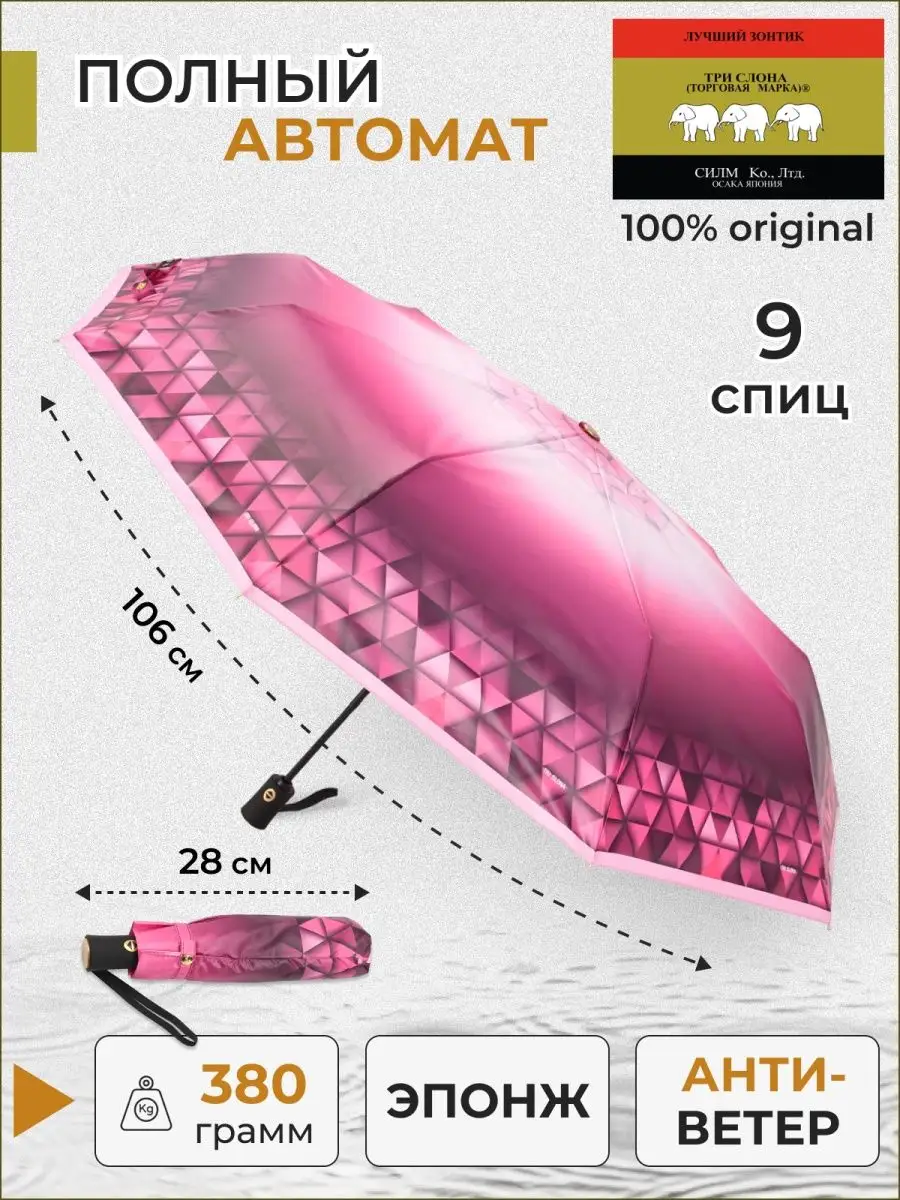Описание: Современная модель зонтов от бренда Три Слона подойдет для защиты от дождя и станет отличным подарком для девушки, любимой, жены, мамы, учителя, бабушки, тещи, свекрови, сестры, дочки, внучки, коллеги, подруги. Характеристики: полный автомат, 9 спиц, вес 380 гр, 3 сложения, длина в сложенном виде 28 см, фактический диаметр купола 102 см, материал купола Эпонж, материал ручки пластик (soft-touch), материал каркаса и спиц сталь, алюминий, фибергласс. На зонты бренда Три Слона действует гарантия 6 месяцев. Во все наши зонты встроена система антиветер. В комплекте зонт и чехол. Три Слона-это знаменитый во всем мире и постсоветском пространстве бренд зонтов, качество которых проверено годами. Наша продукция 100% оригинальная, имеет все фирменные бирки, заводские выштамповки и голографические наклейки, которые подтверждают безупречное качество.